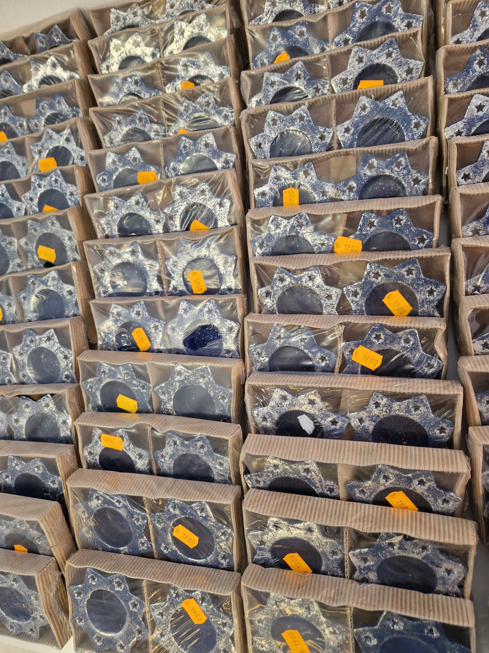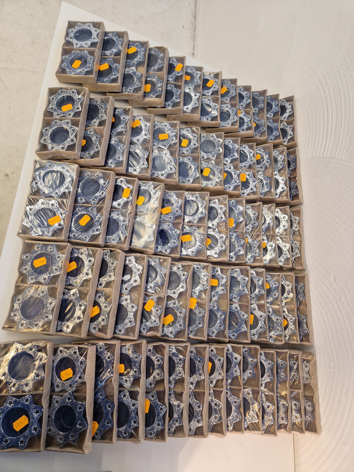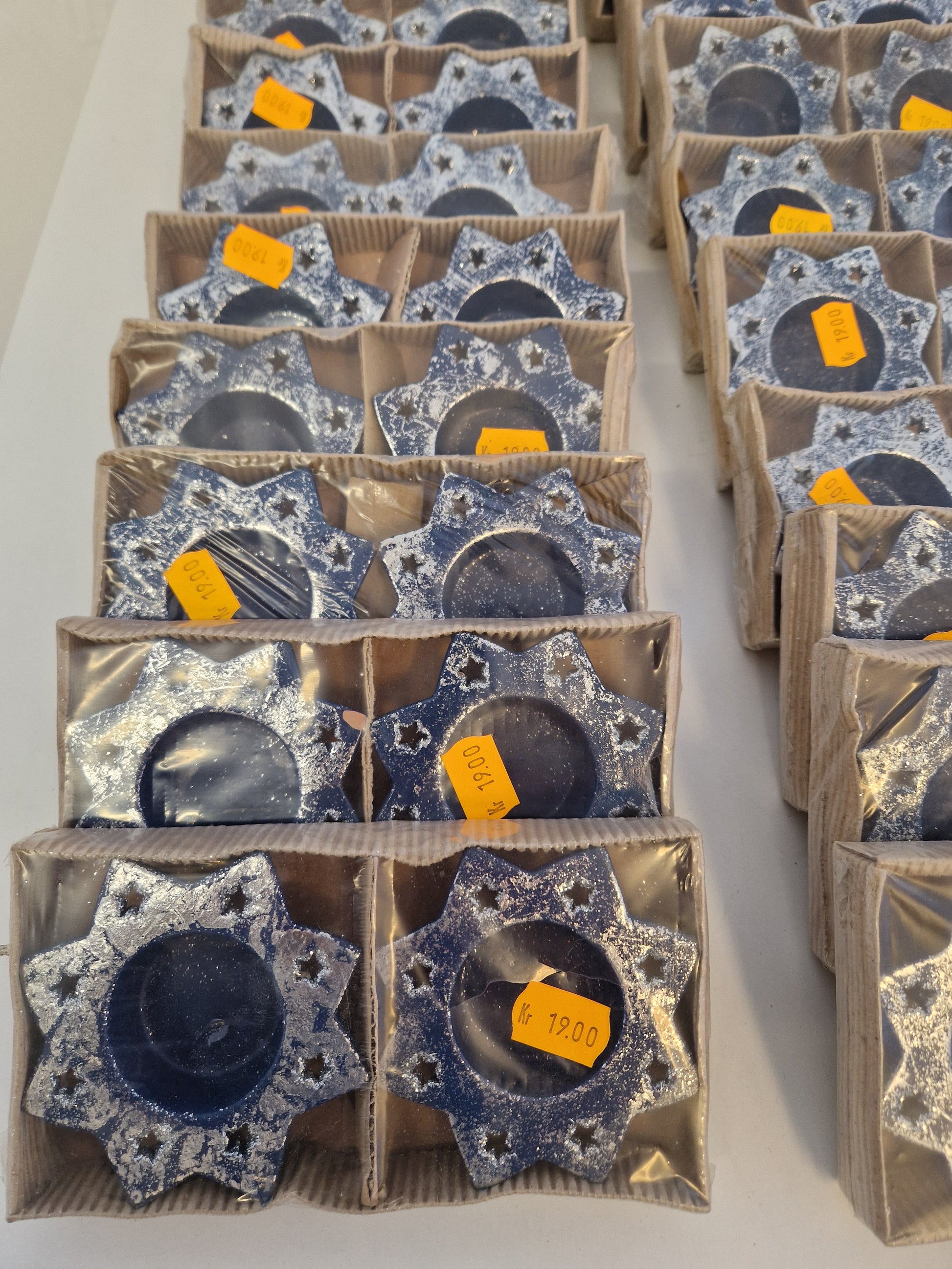 63 par ljushållare i förpackning, prismärkta och färdiga till försäljning.