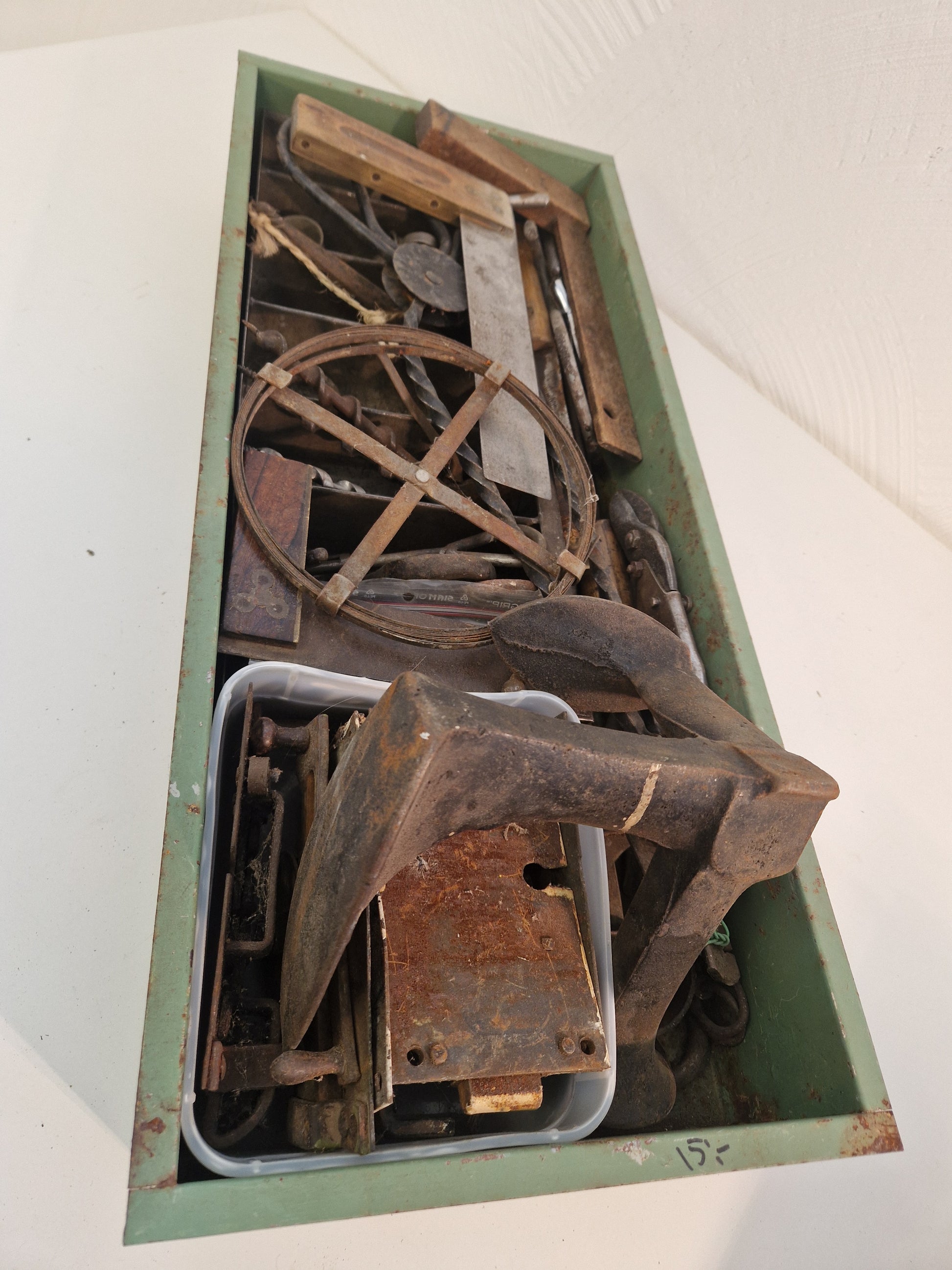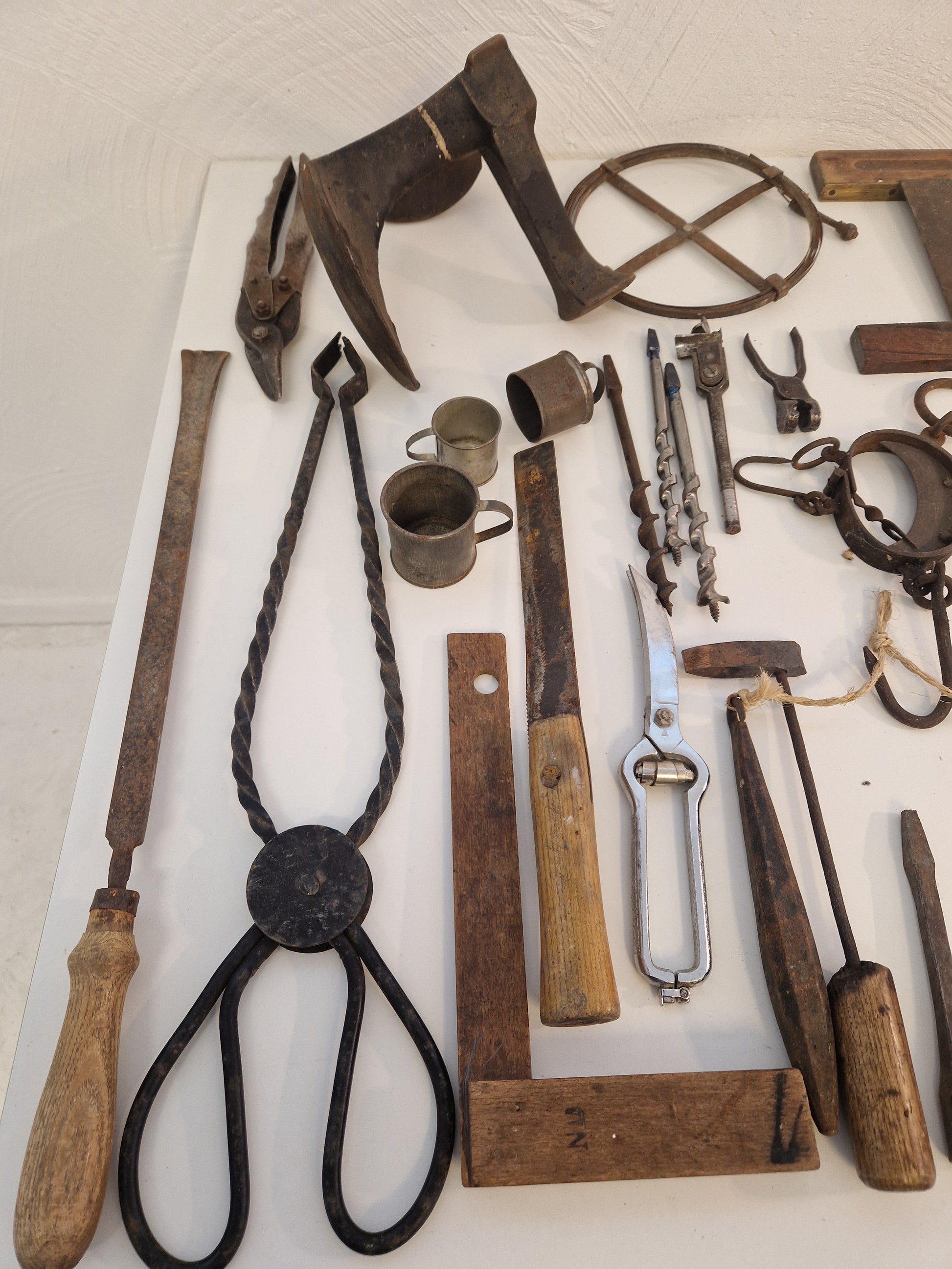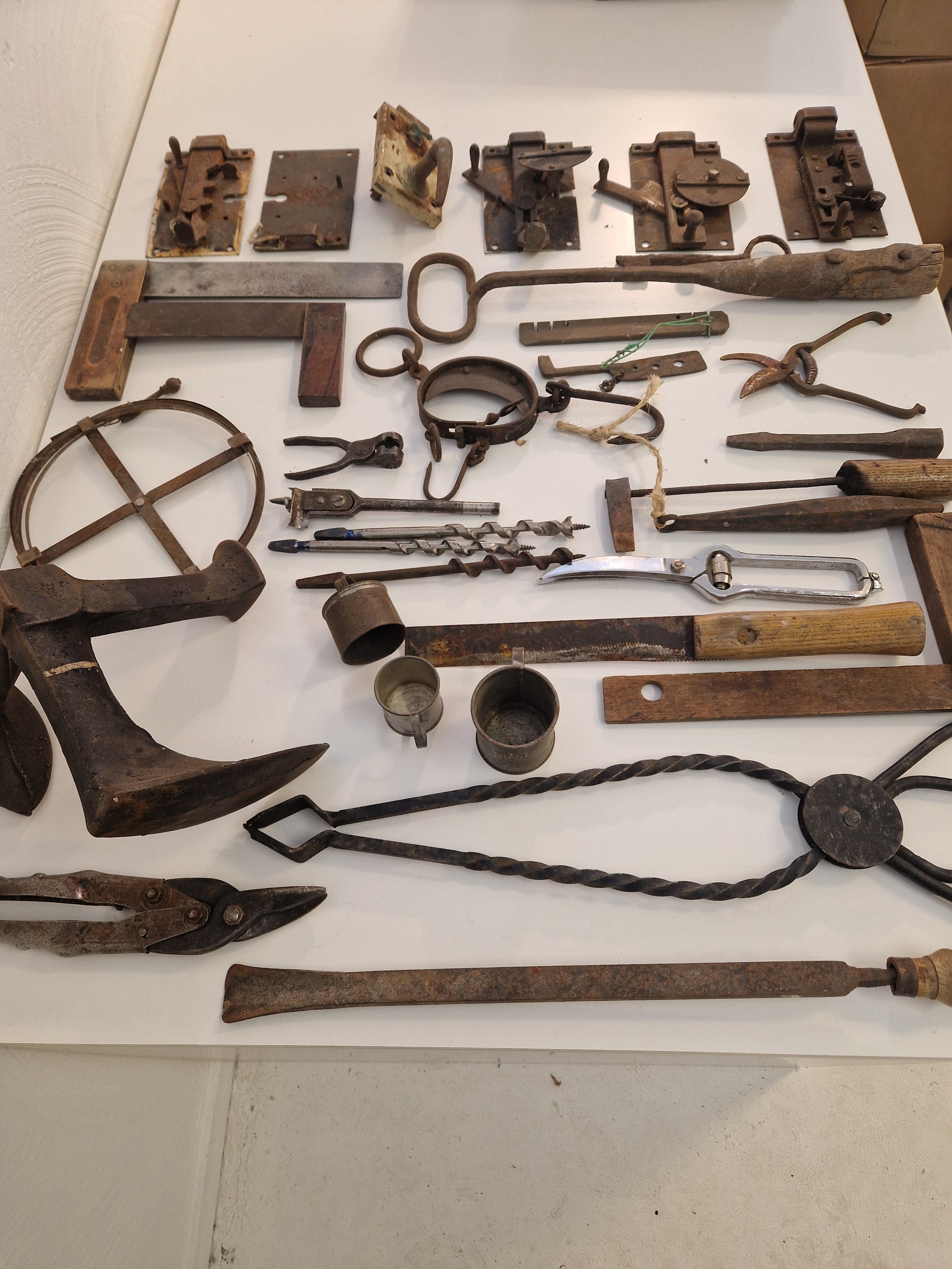 Innehåller bl.a. äldre vinkelhakar, smidestång, lästjärn (skomakarjärn), fågelsaxar, låskistor, våg, lödkolv, träborr mm.