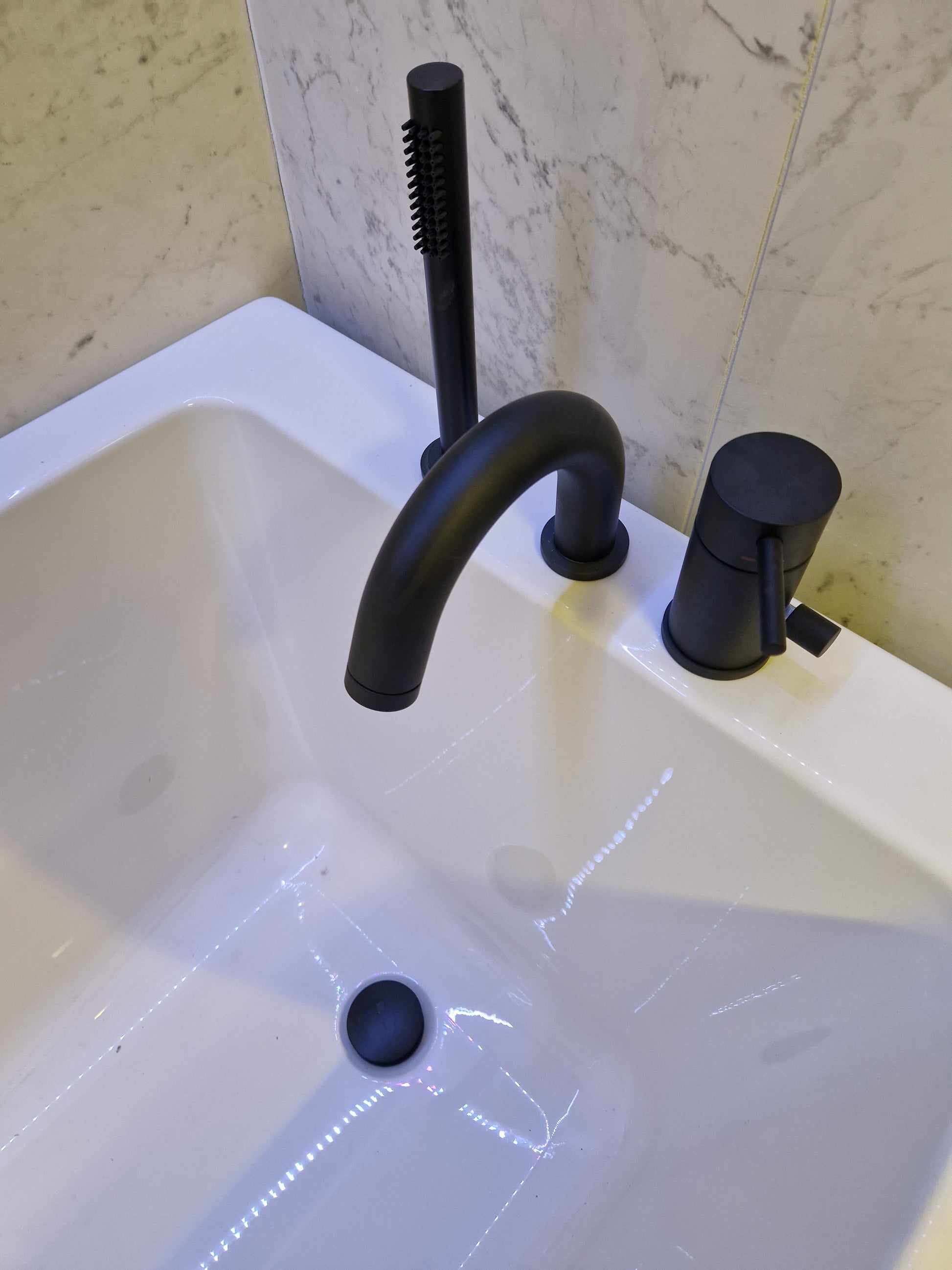 Badkar i plast, komplett med blandare, duschmunstycke och bottenventil i mattsvart utförande.