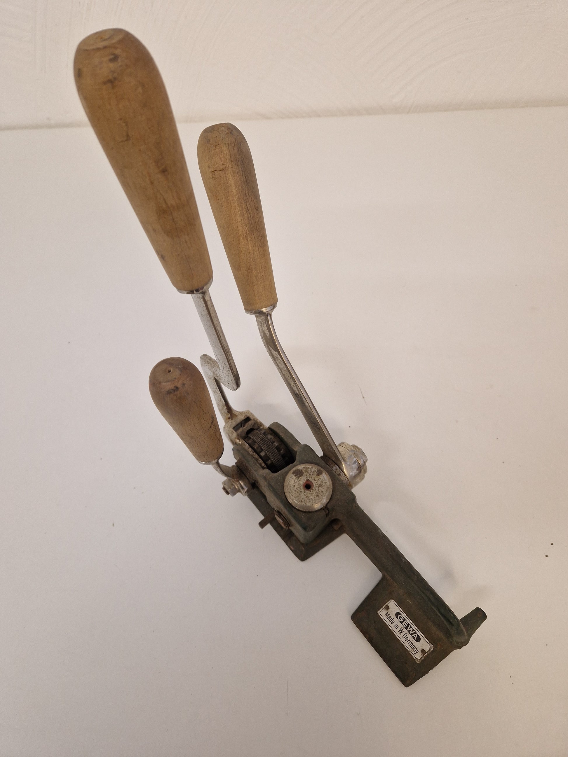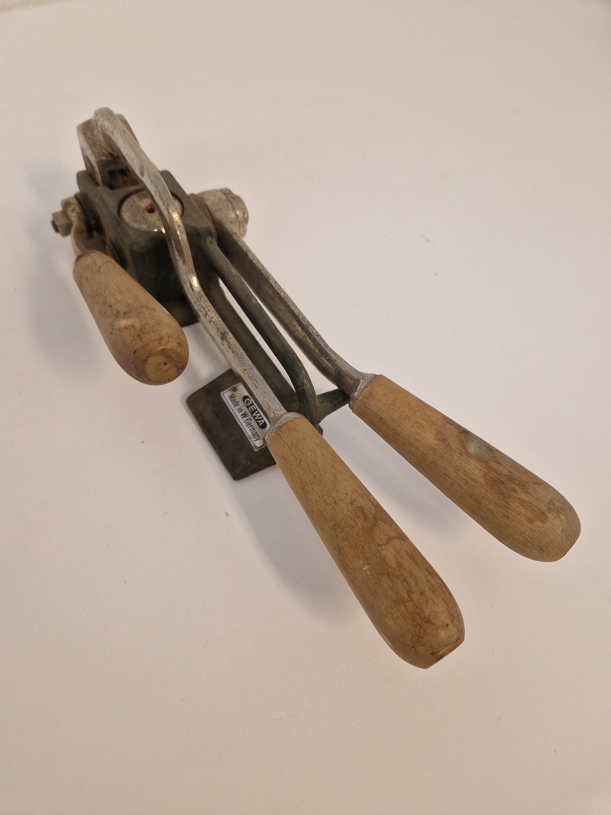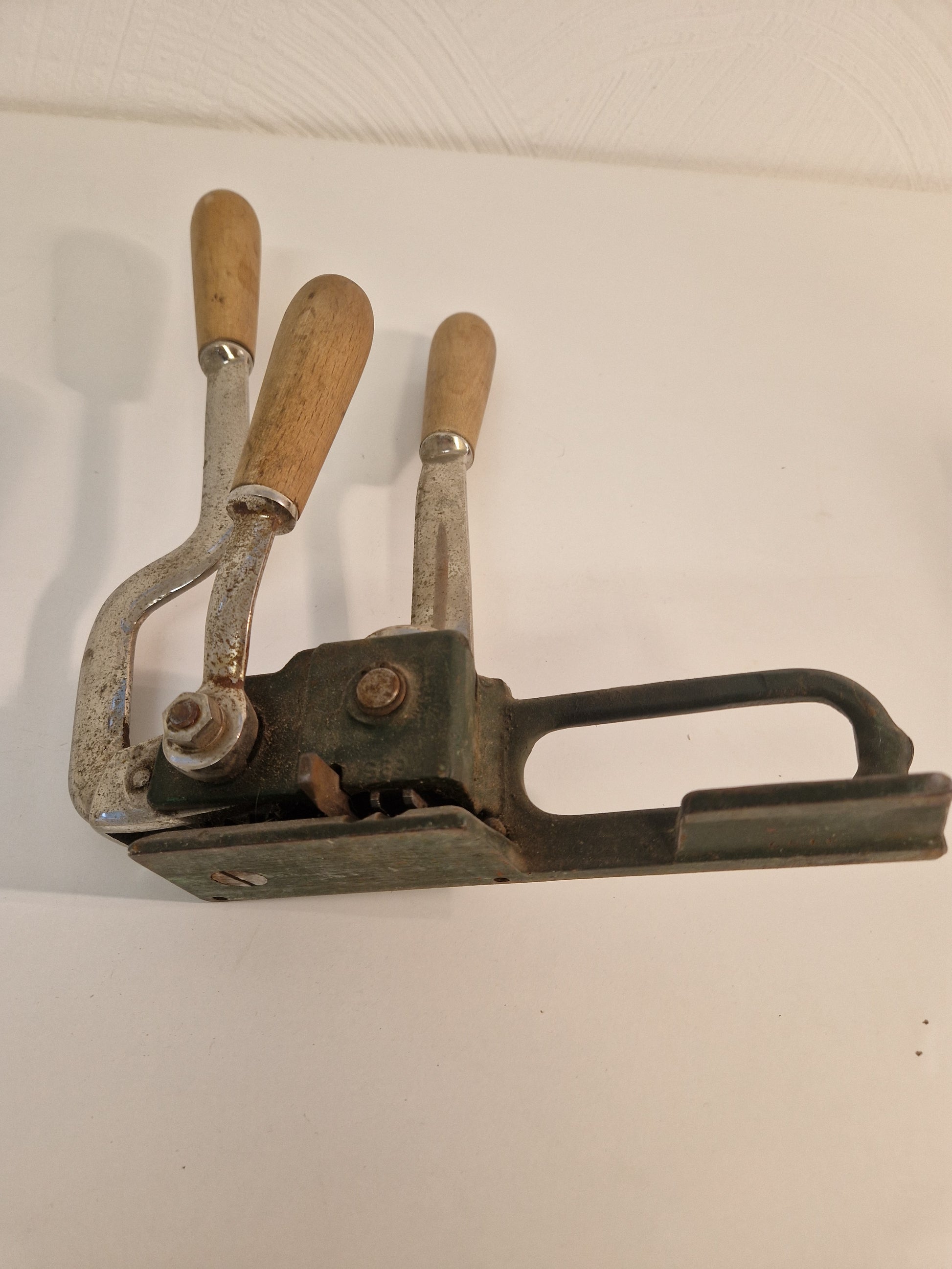 Bandsträckningsverktyg för plåtband. Fungerar tillsammans med plåthylsa som kläms ihop om banden.