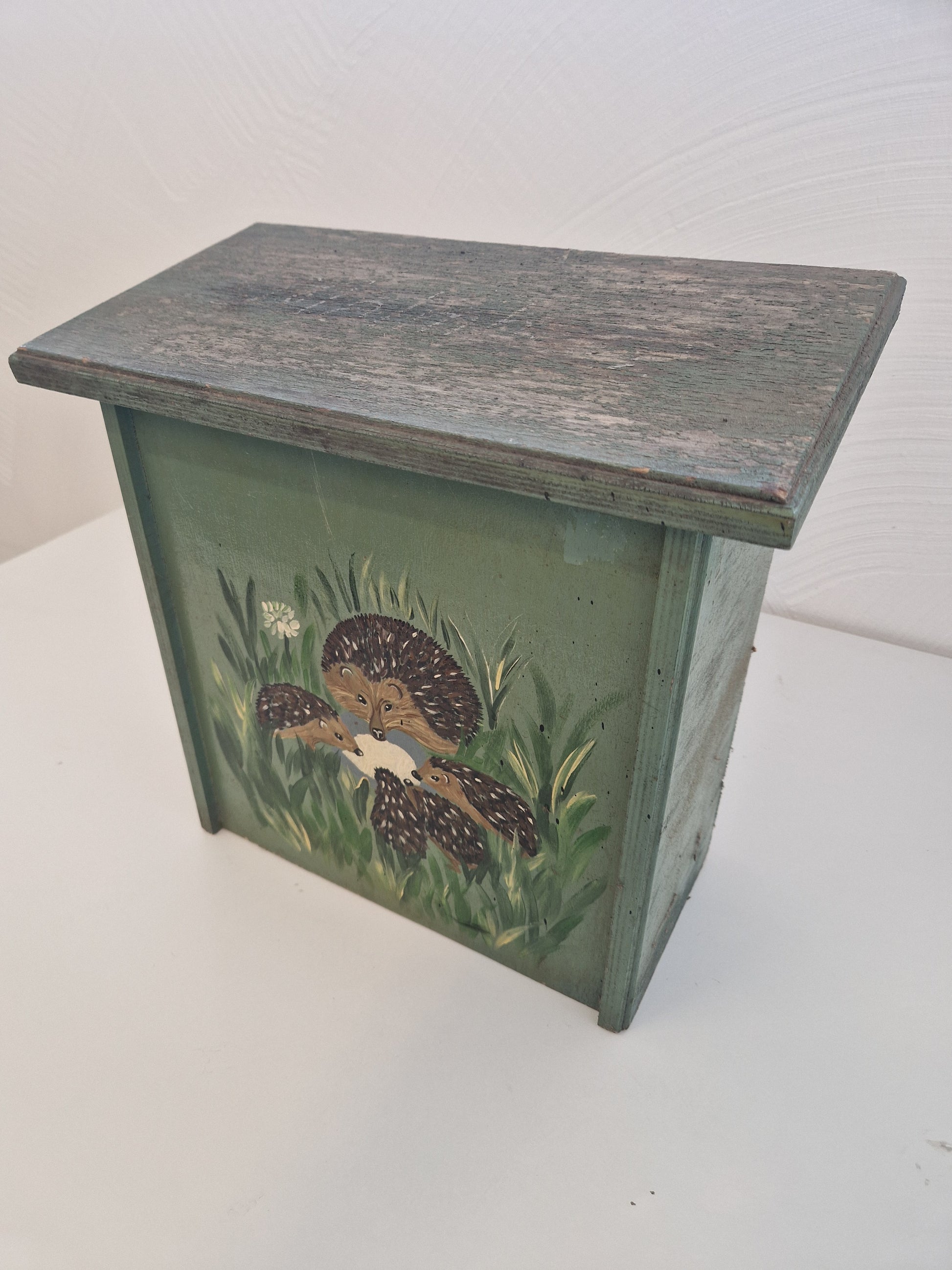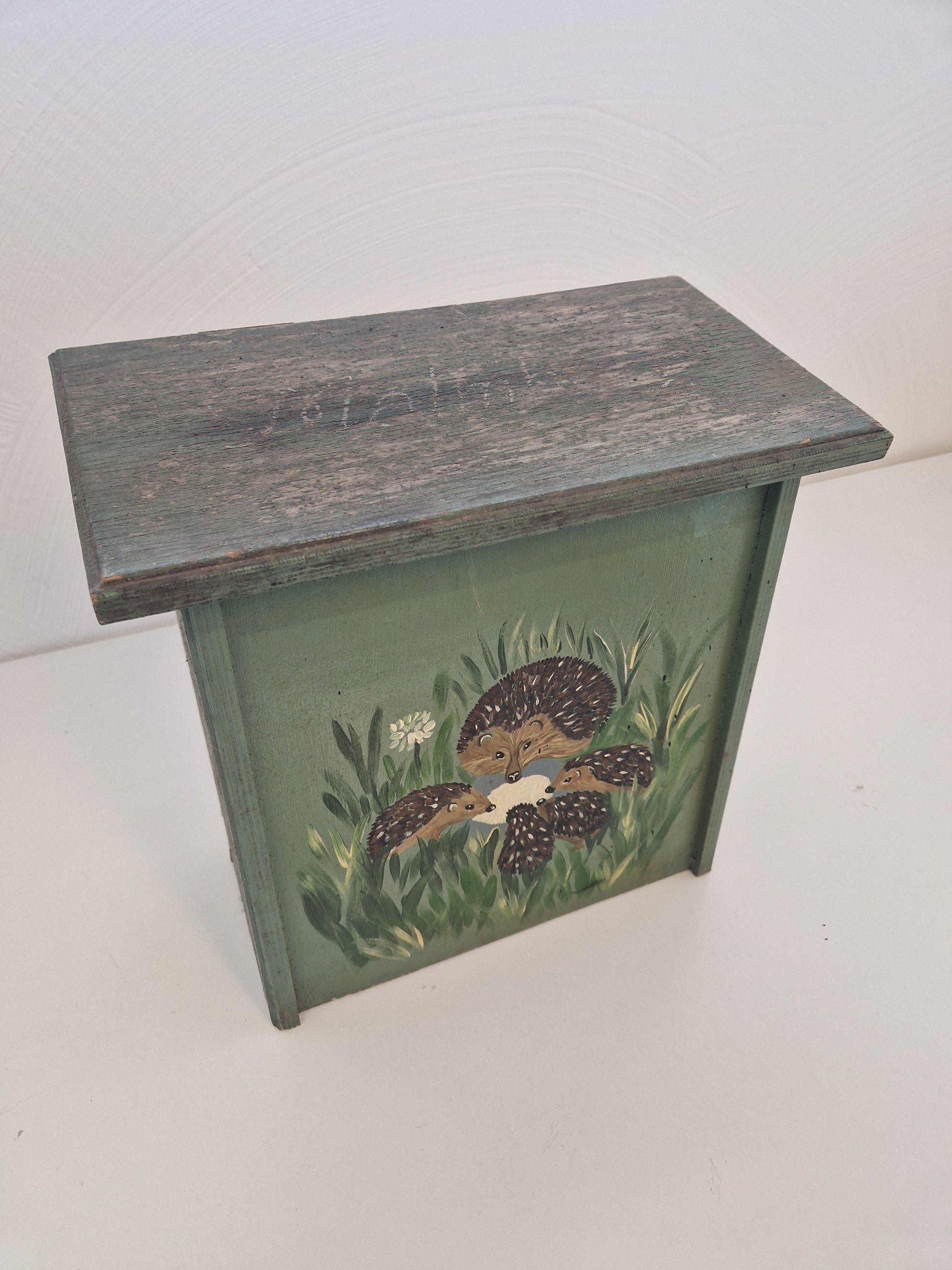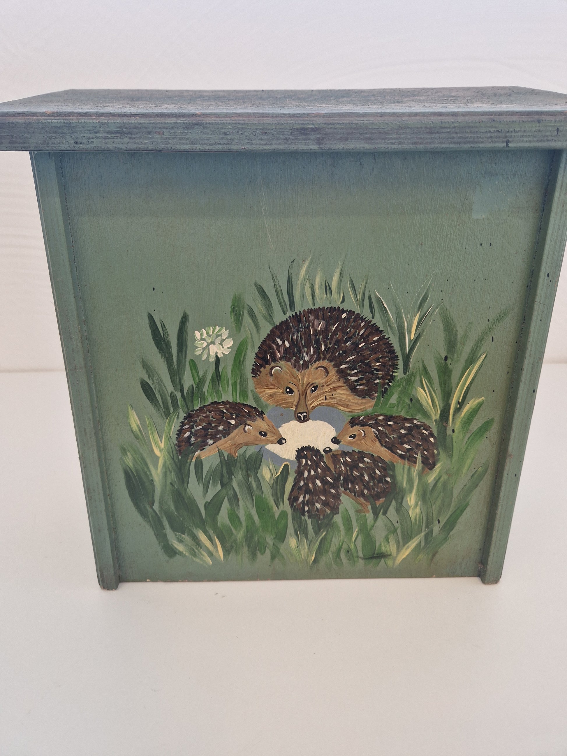 Brevlåda i trä med igelkottsfamilj som motiv.