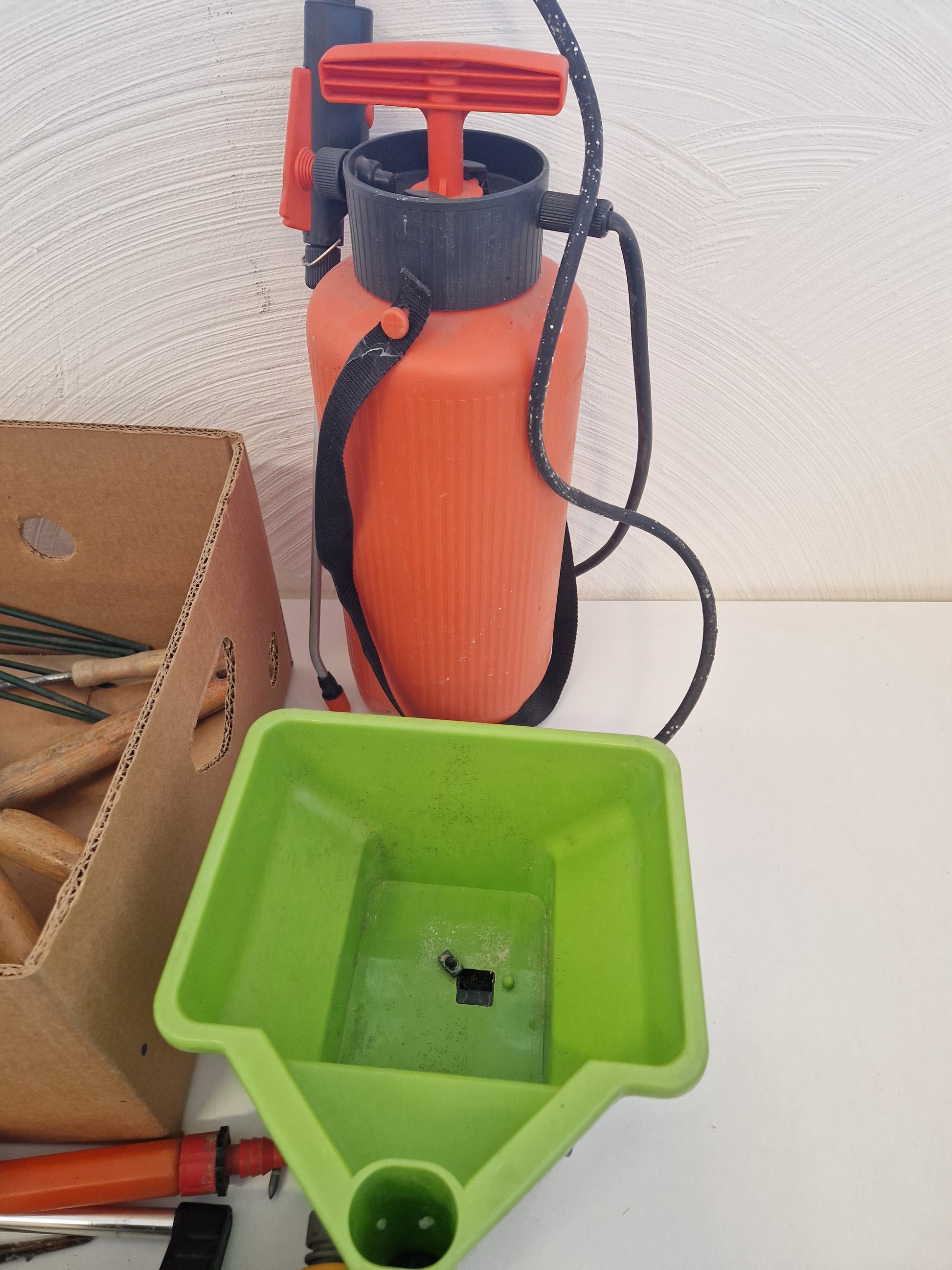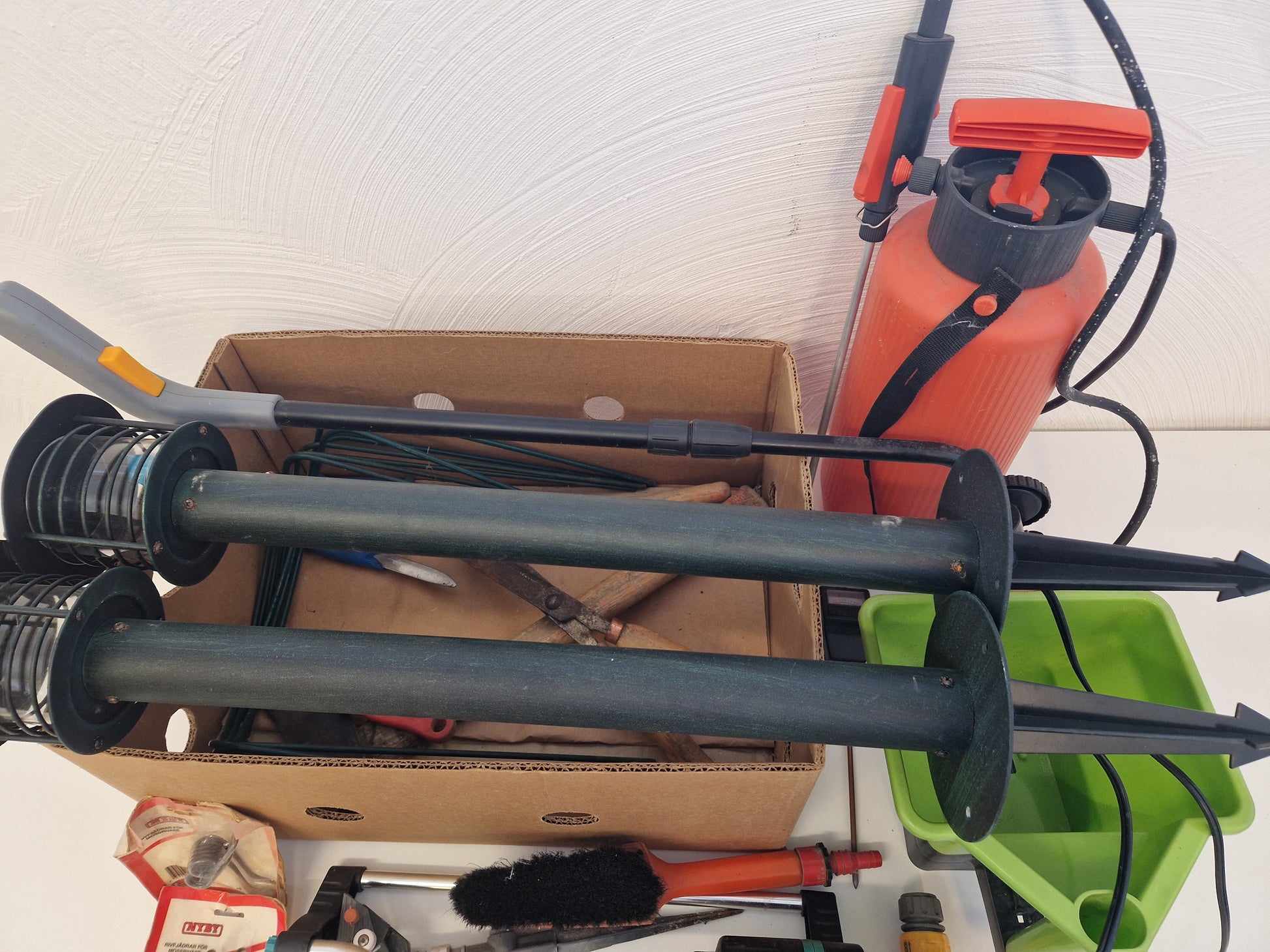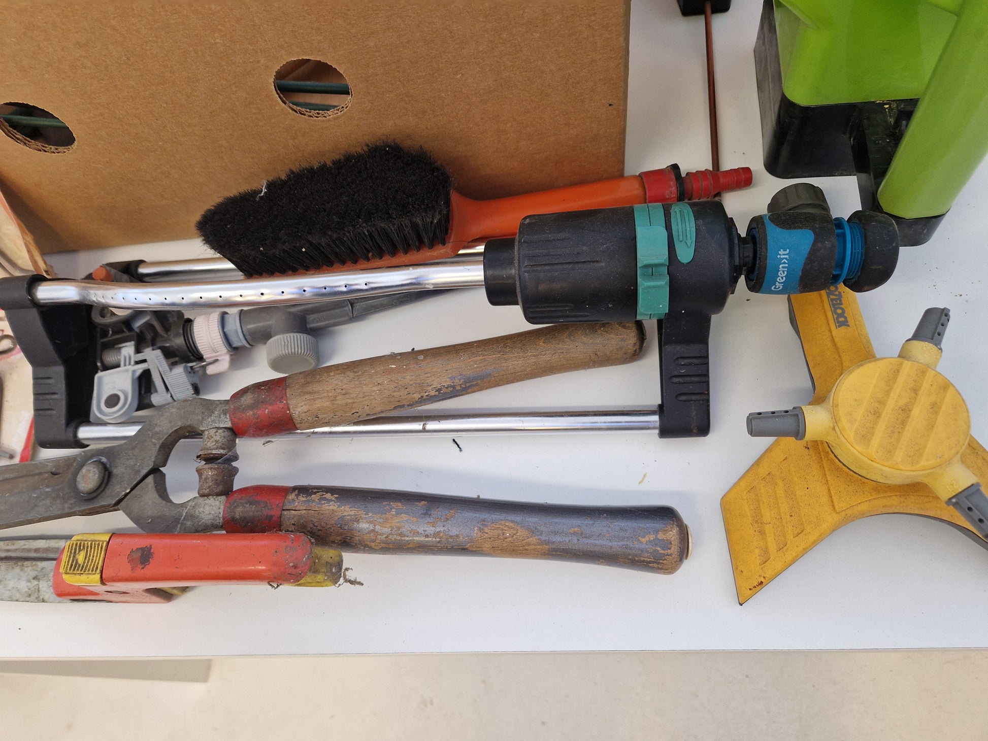 Tryckspruta, gödningsspridare, vattenspridare, häcksax, växtskydd, vattenslang 20 + 16 meter, fuktmätare mm.