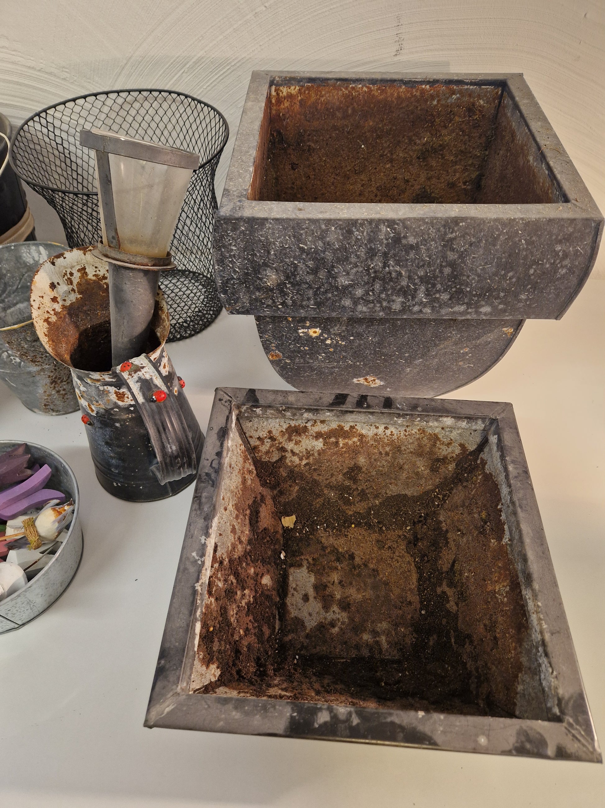 Plåtkrukor, svartmålade och förzinkade.