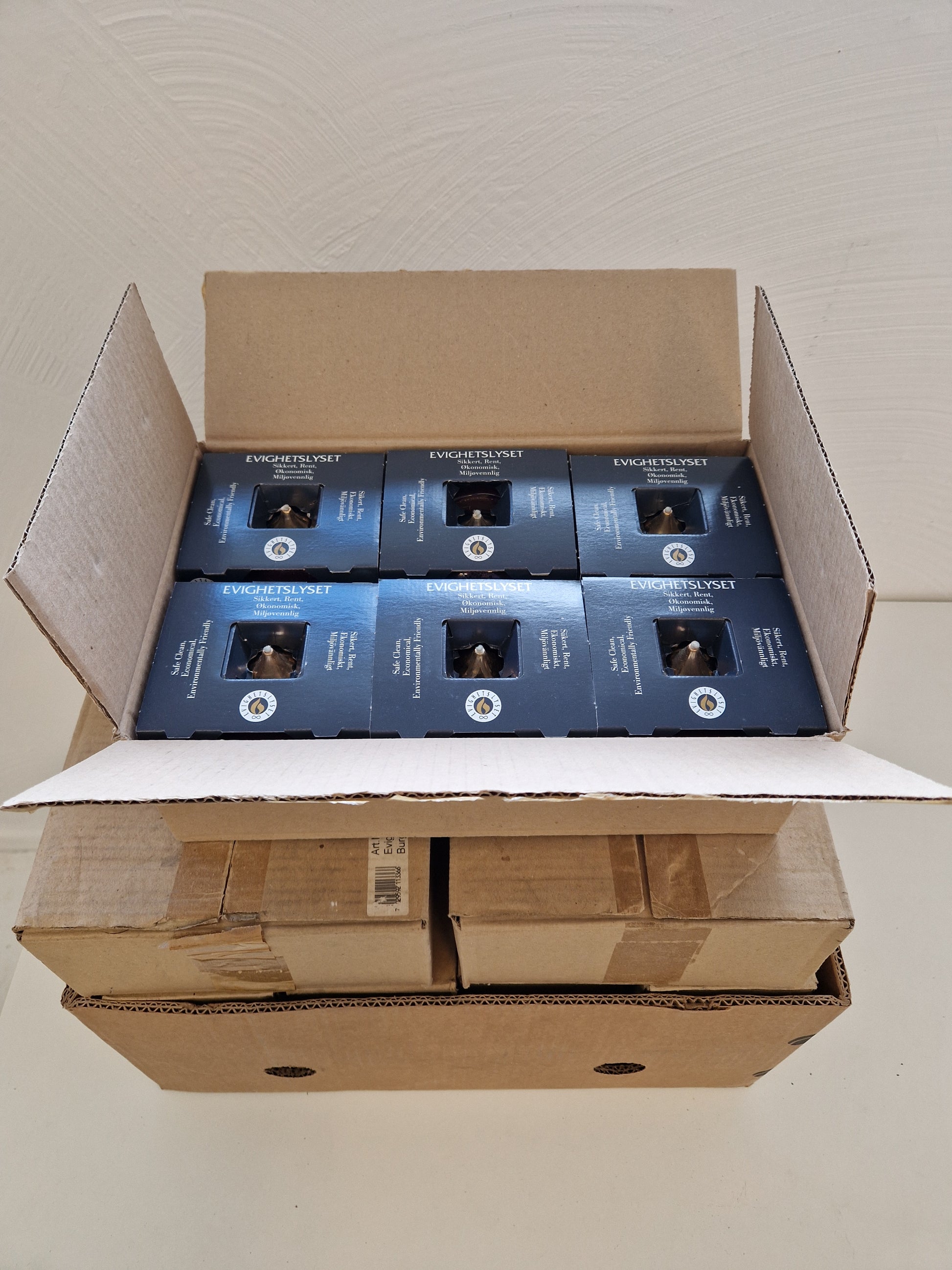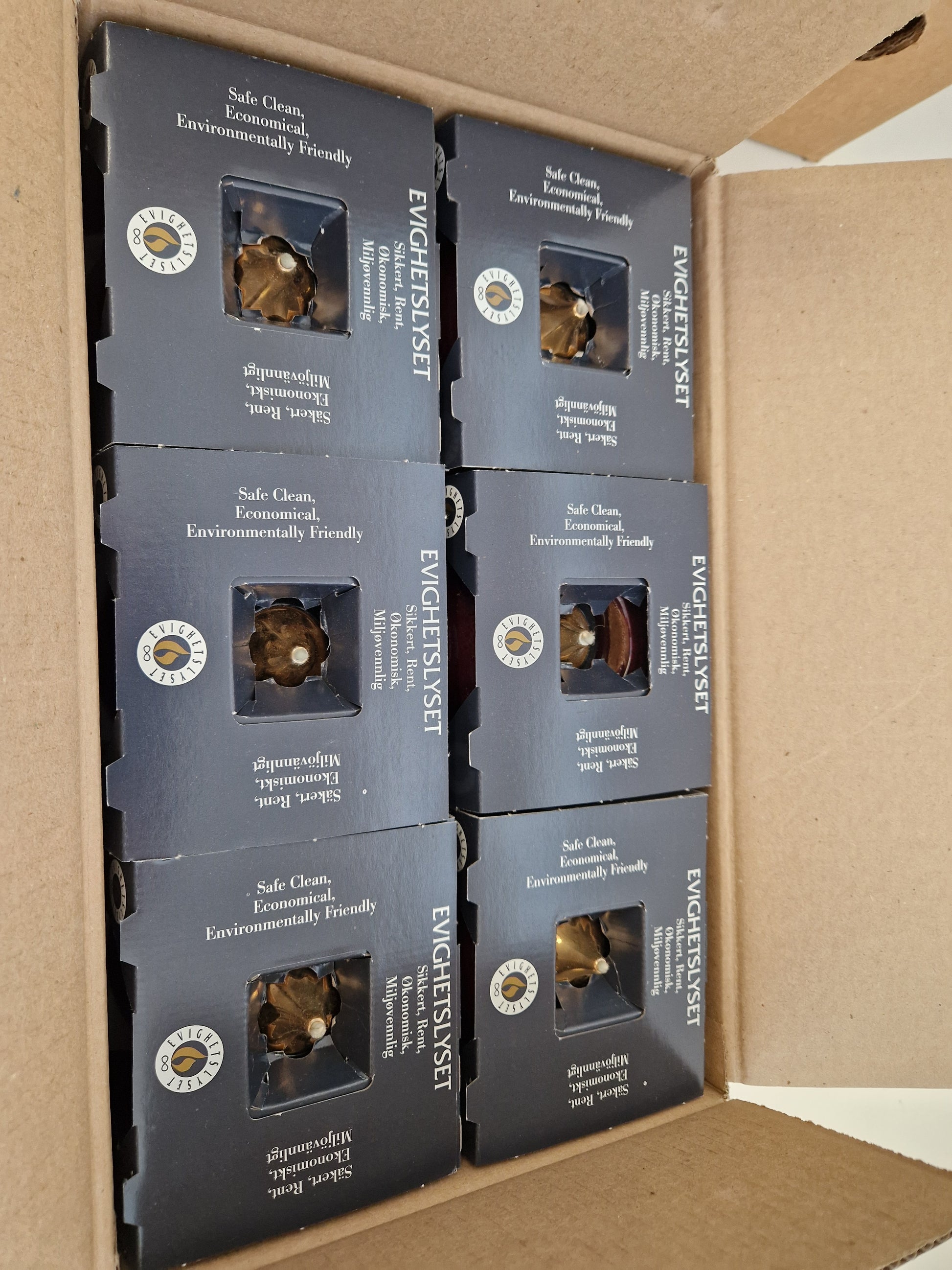 Partiet innehåller 7 lådor med 6st lampor i varje, så totalt 42st oljelampor.