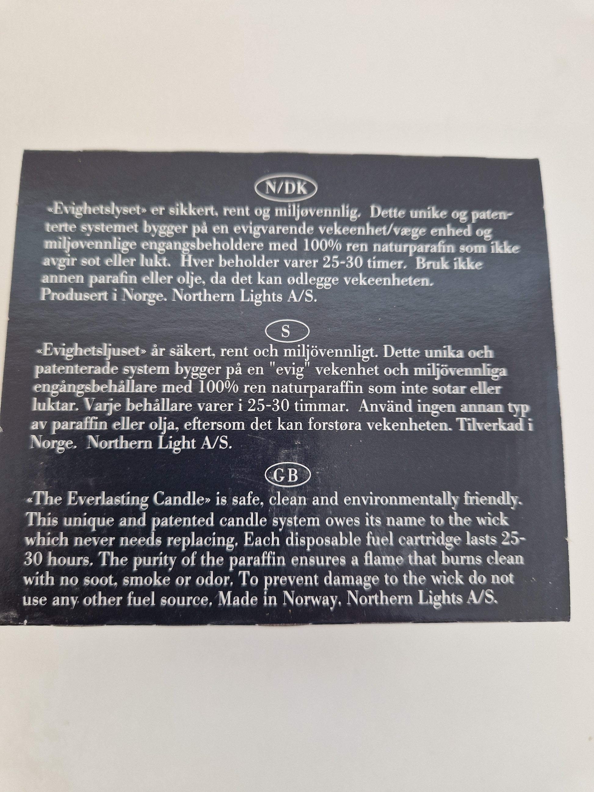 Evighetslyset är en oljelampa med veke som drivs med 100% ren naturparaffin, som inte sotar eller luktar.