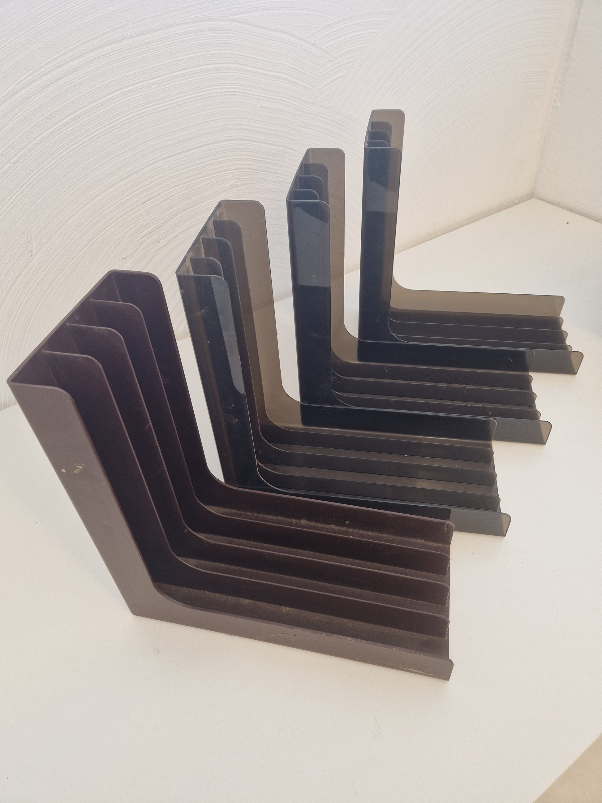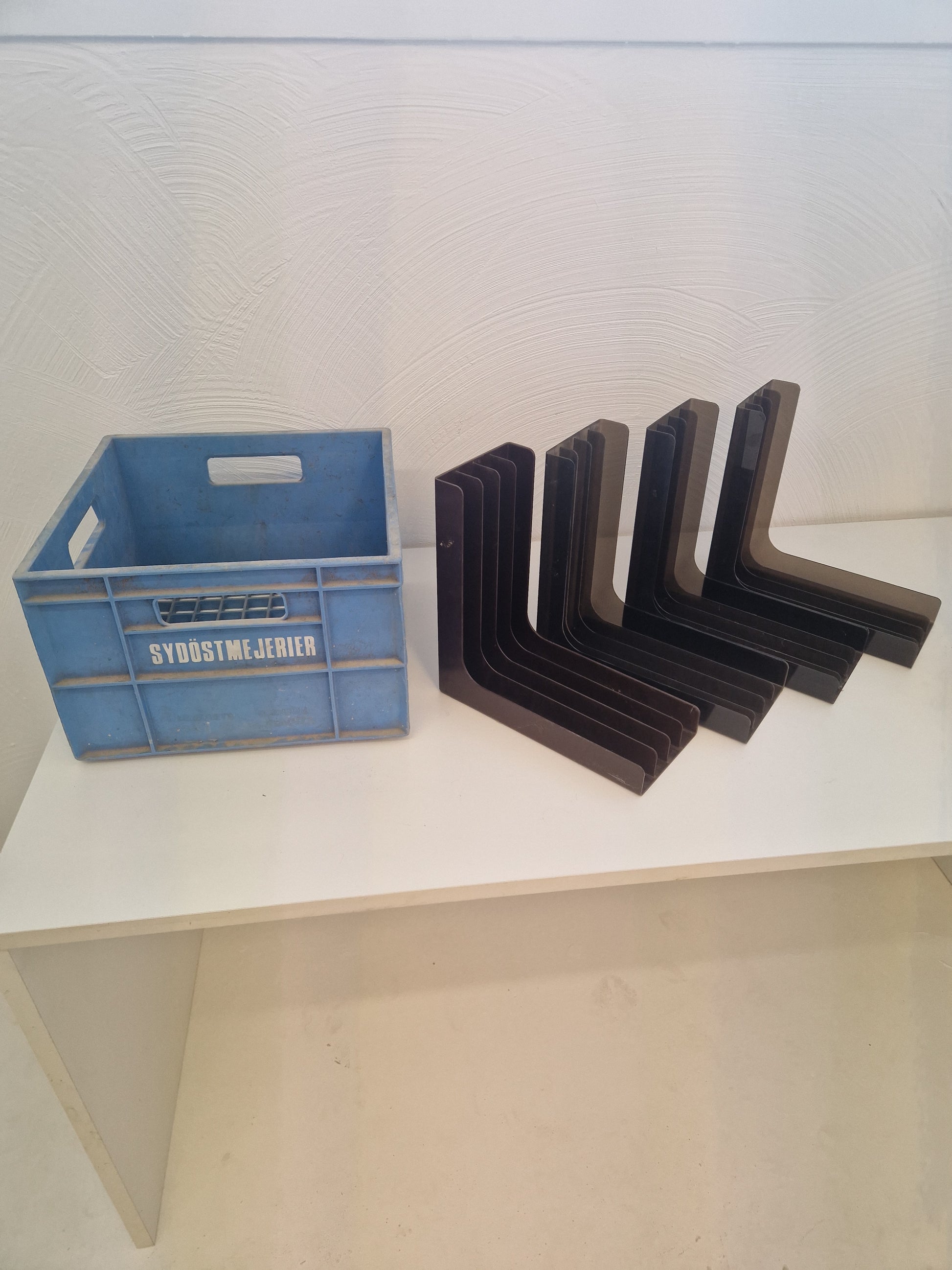 4st skivställ och en äldre mjölkback för förvaring av LP-skivor.