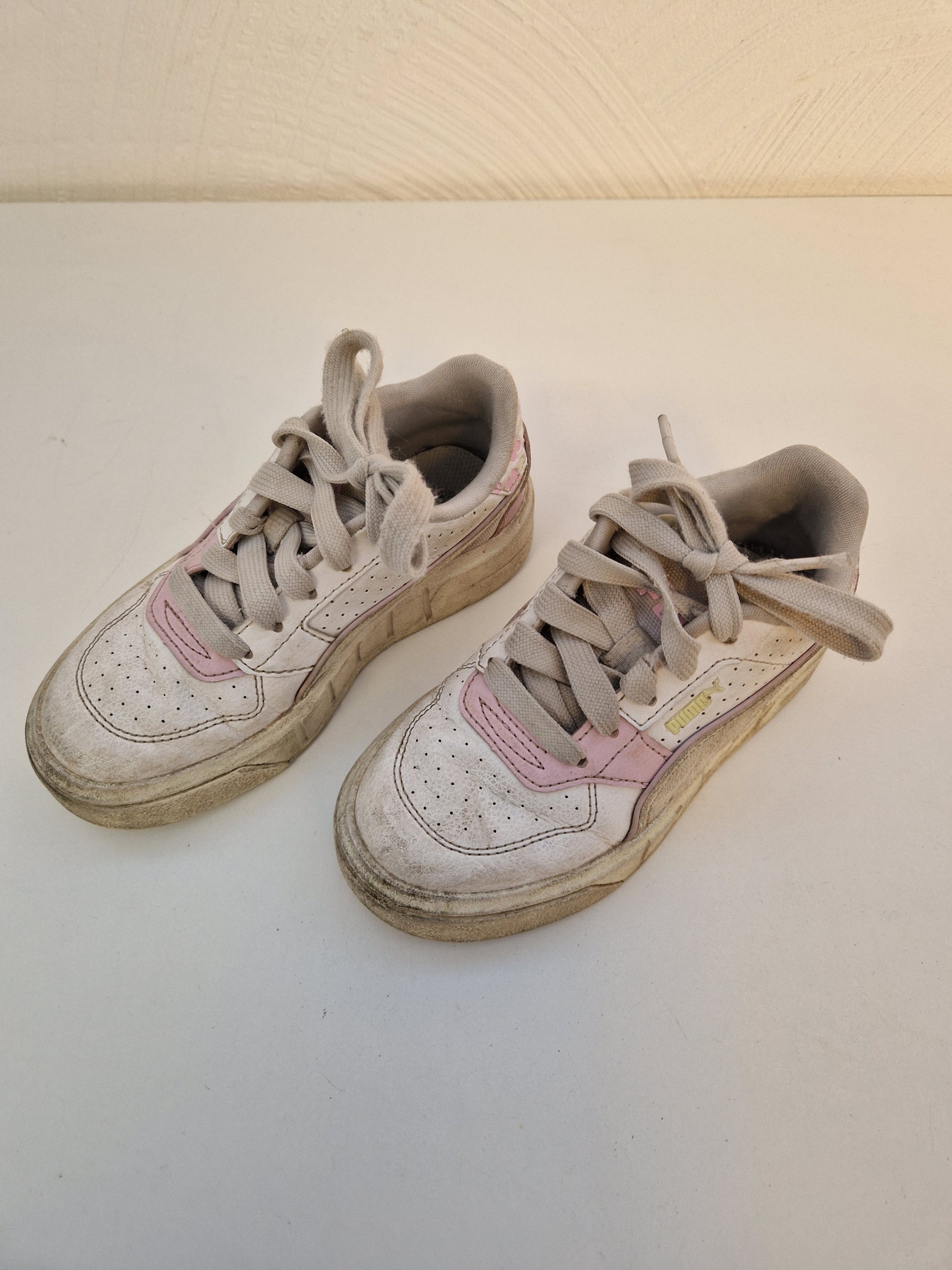 Ett par vita/rosa fritidsskor/gympaskor från PUMA i storlek 30, som är väl använda och lite smutsiga men annars hela.