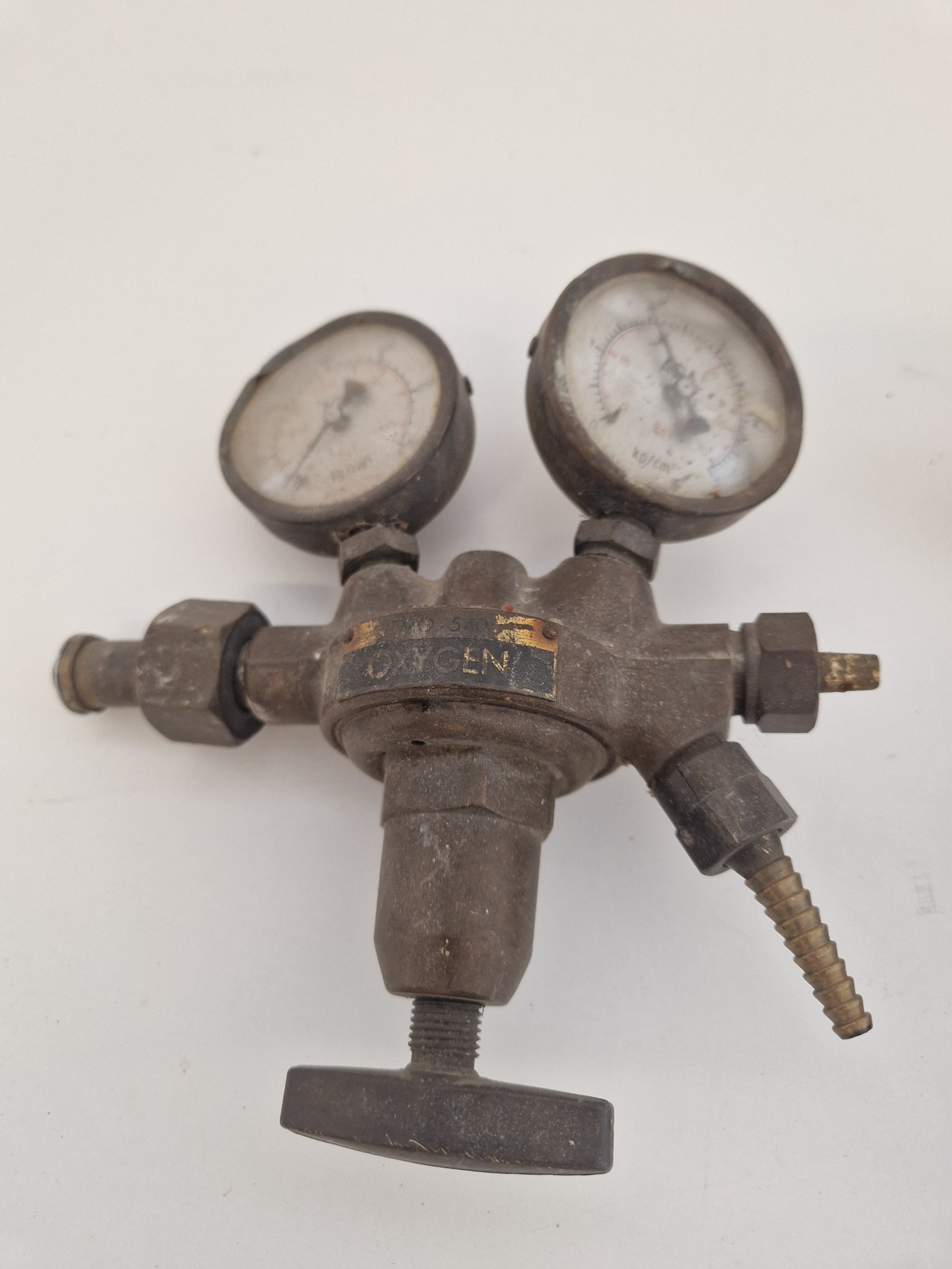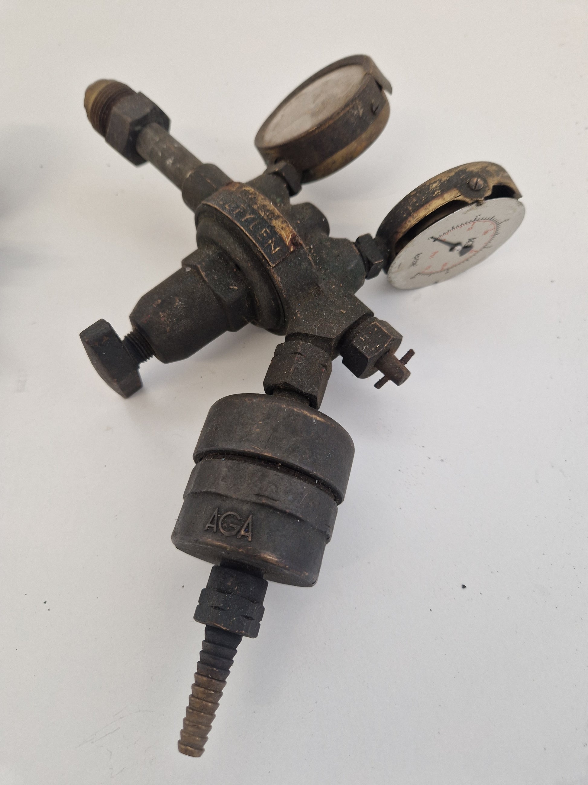 Innehåller bl.a. 3st skärbrännare, 6st svetsmunstycken, rensnålar, gnisttändare samt 1 oxygenregulator som är lite kantstött och 1 acetylenregulator som också den är kantstött och saknar glas på en klocka.