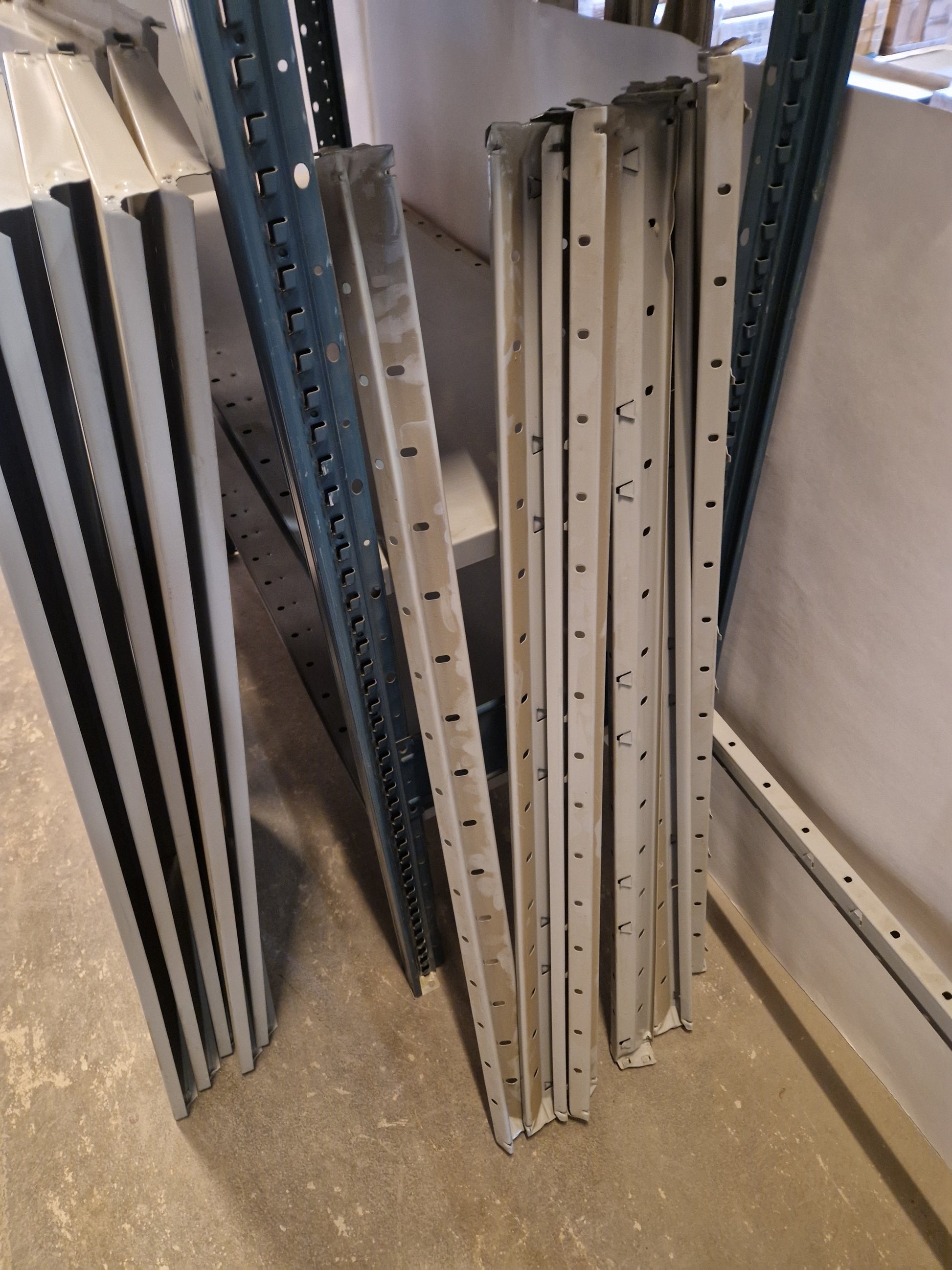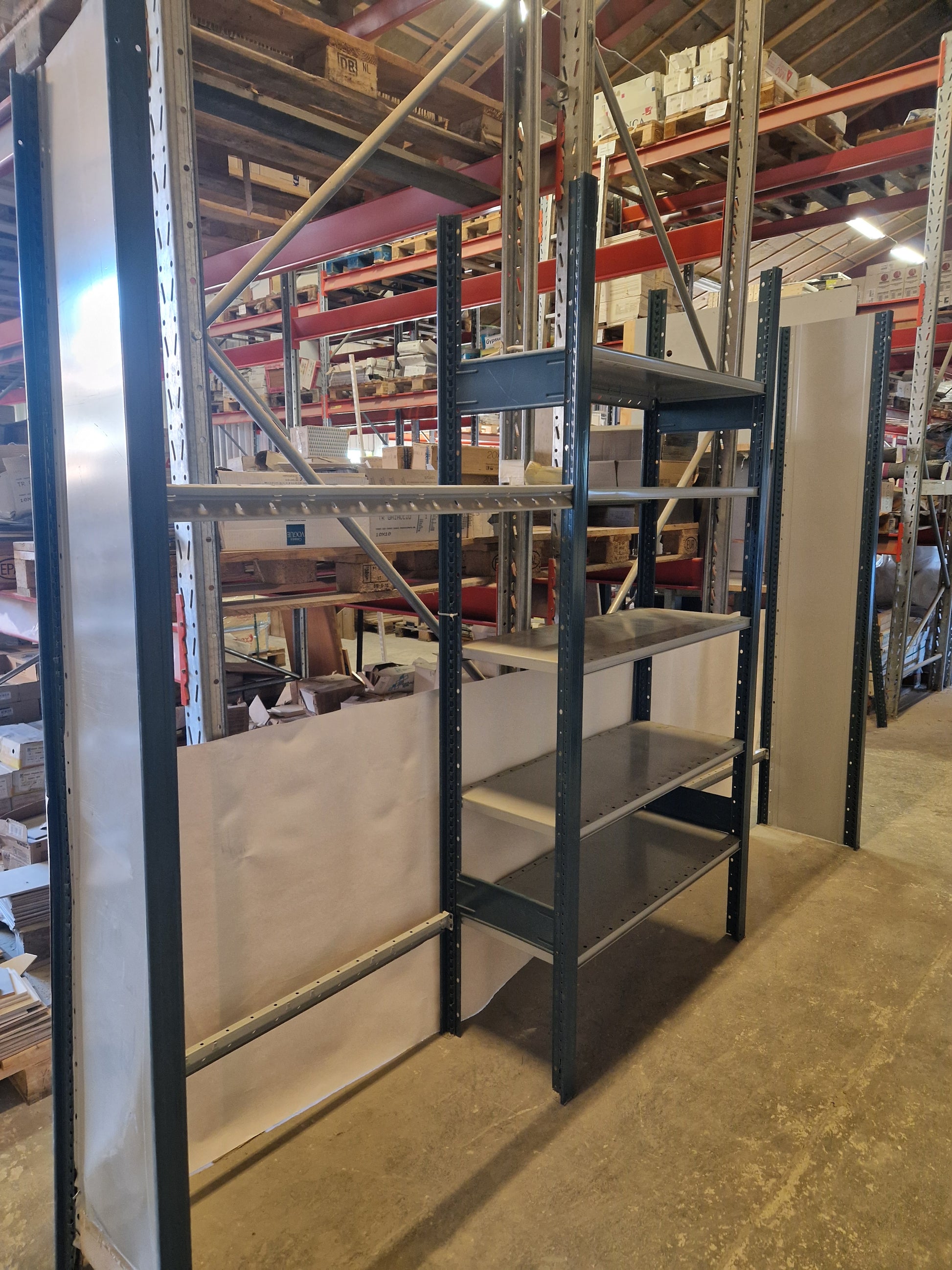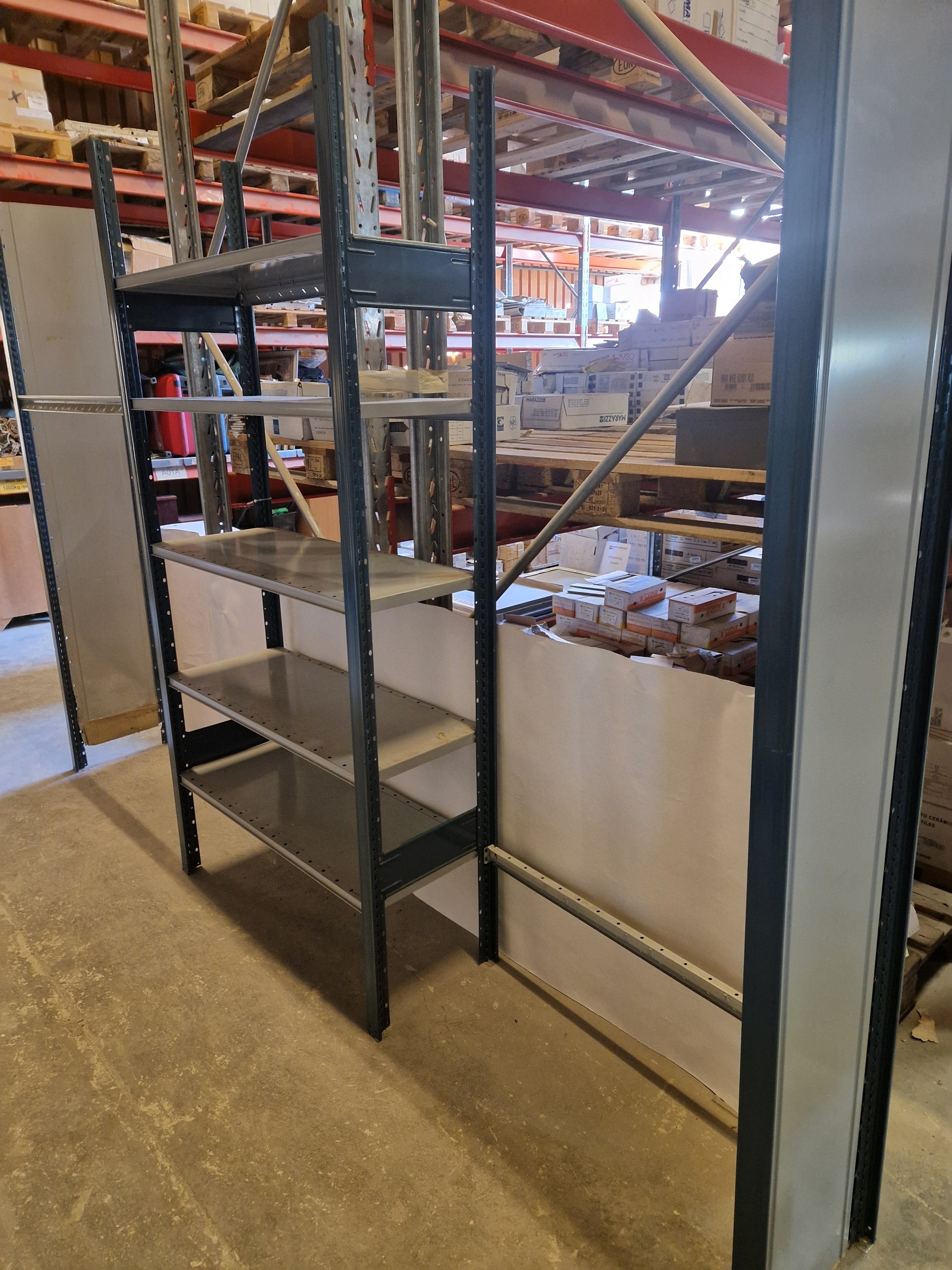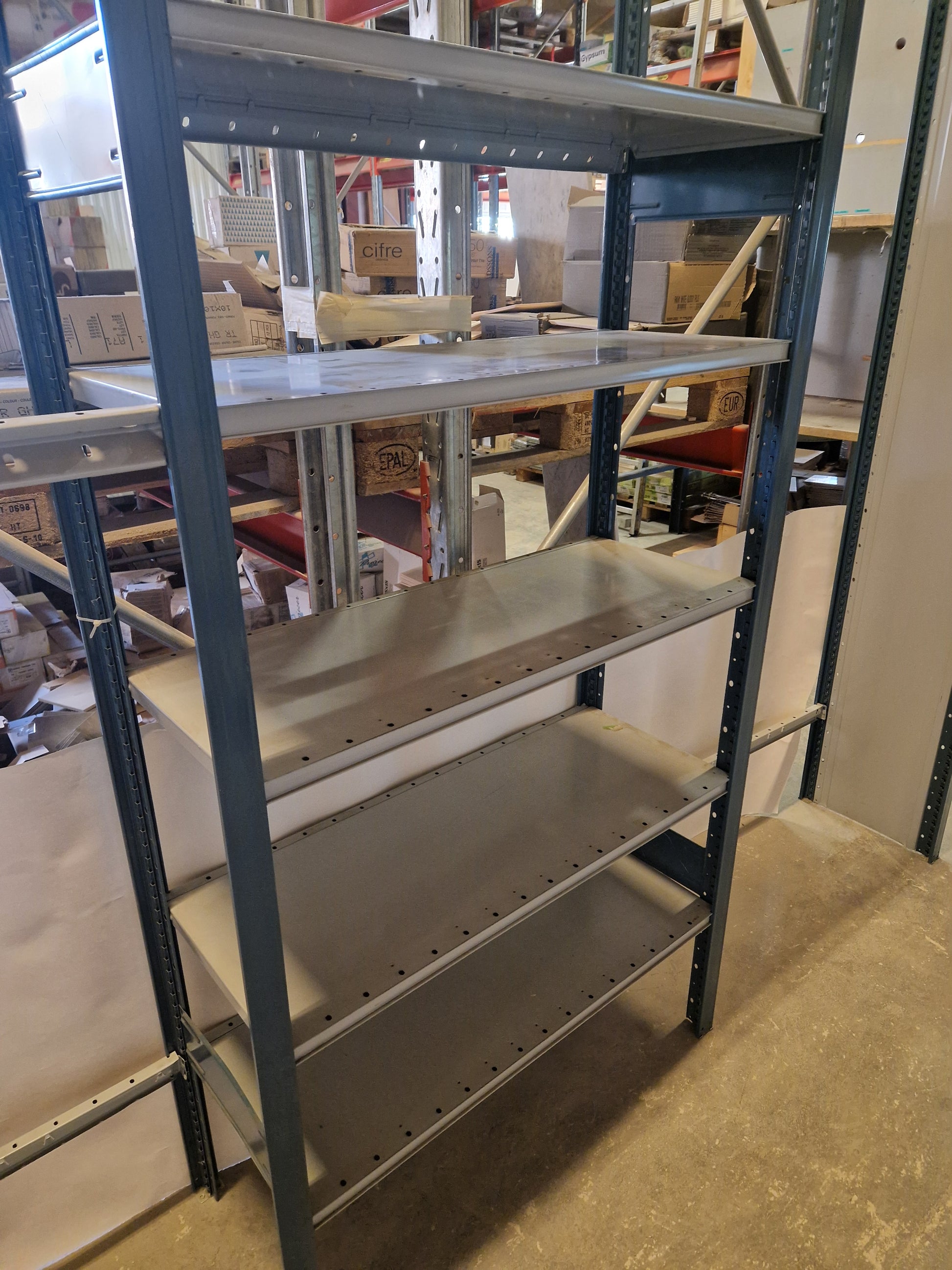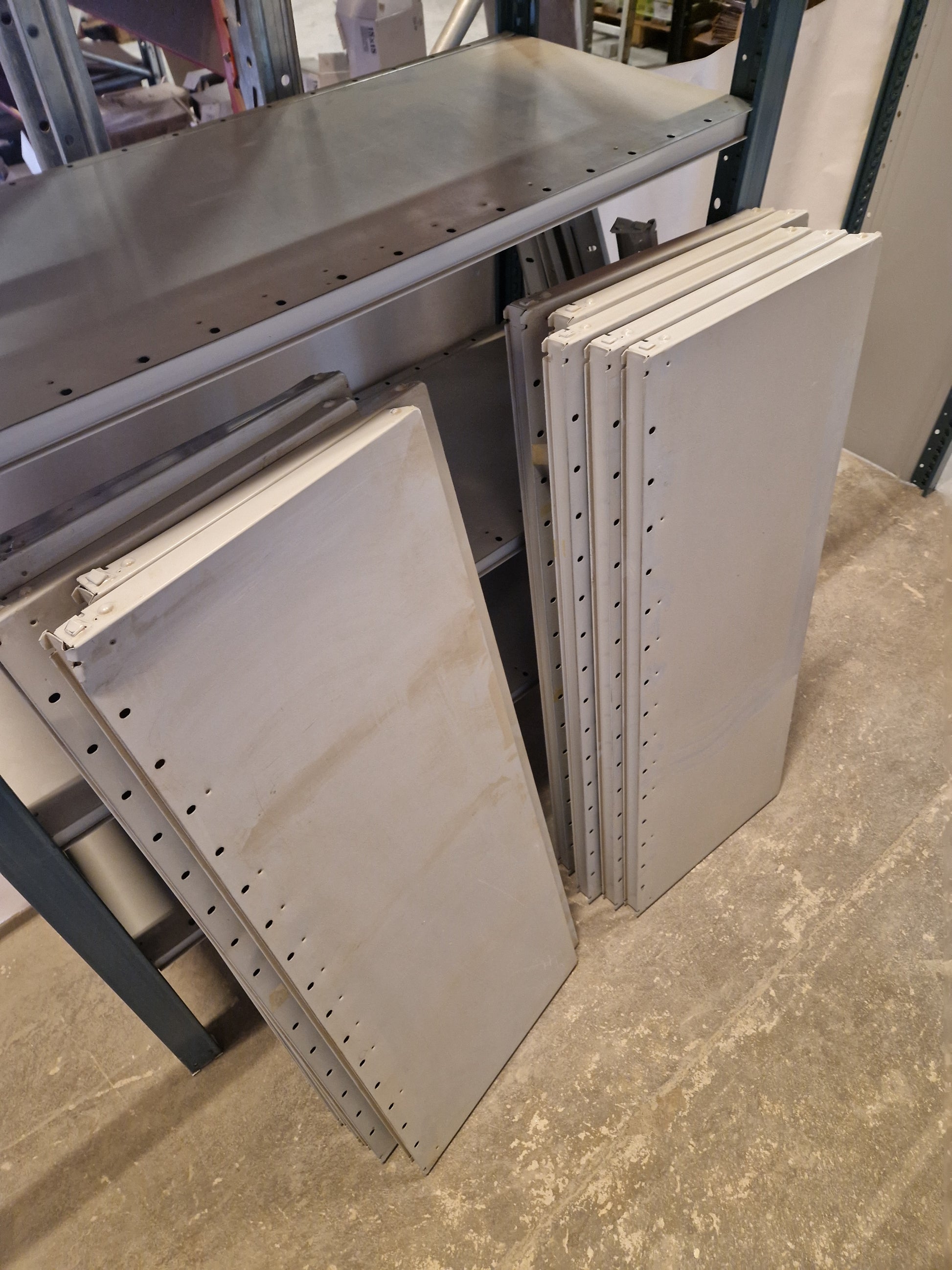 Plåthyllor i 3 sektioner med vardera 5 hyllplan.