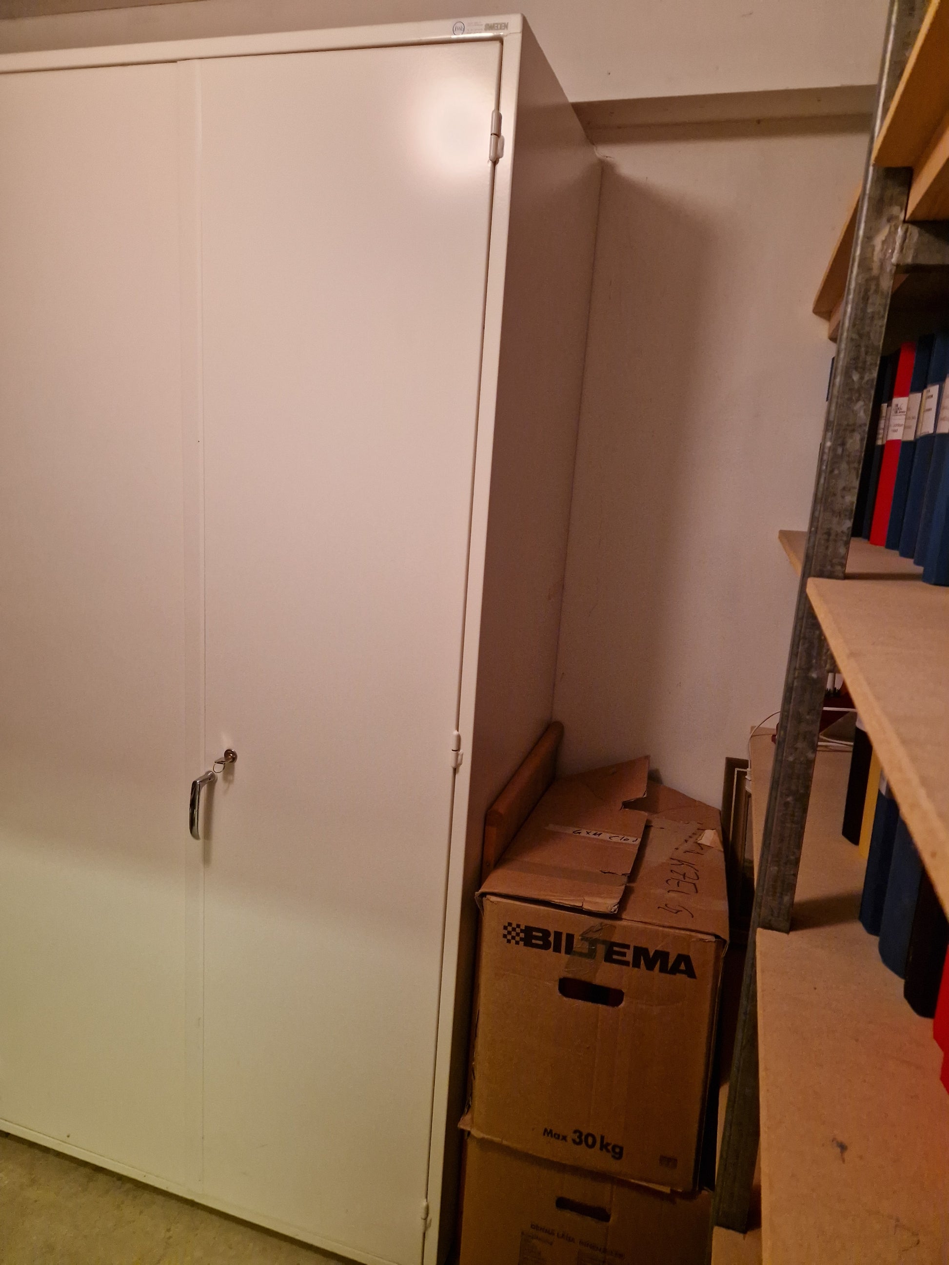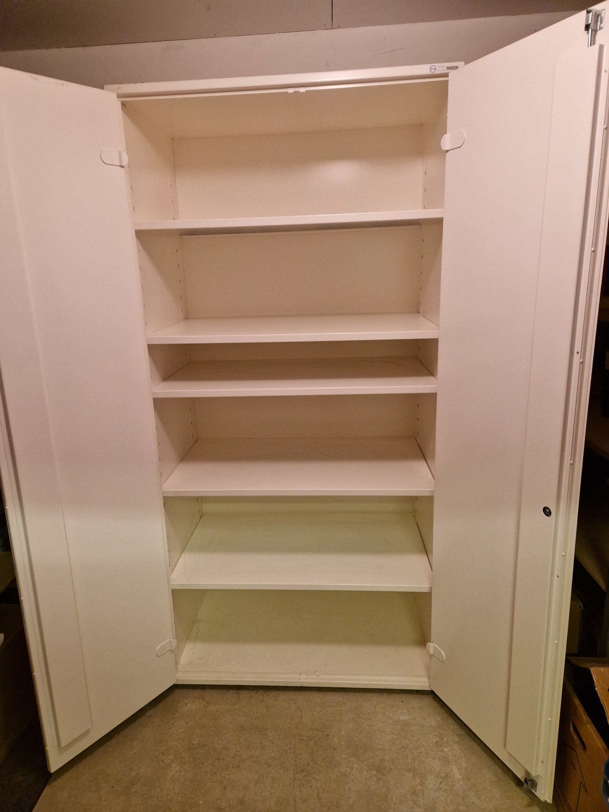 Brandklassat kemikalieskåp med höjd ca 205cm, bredd ca 100cm och djup ca 60cm. Obetydligt begagnat.