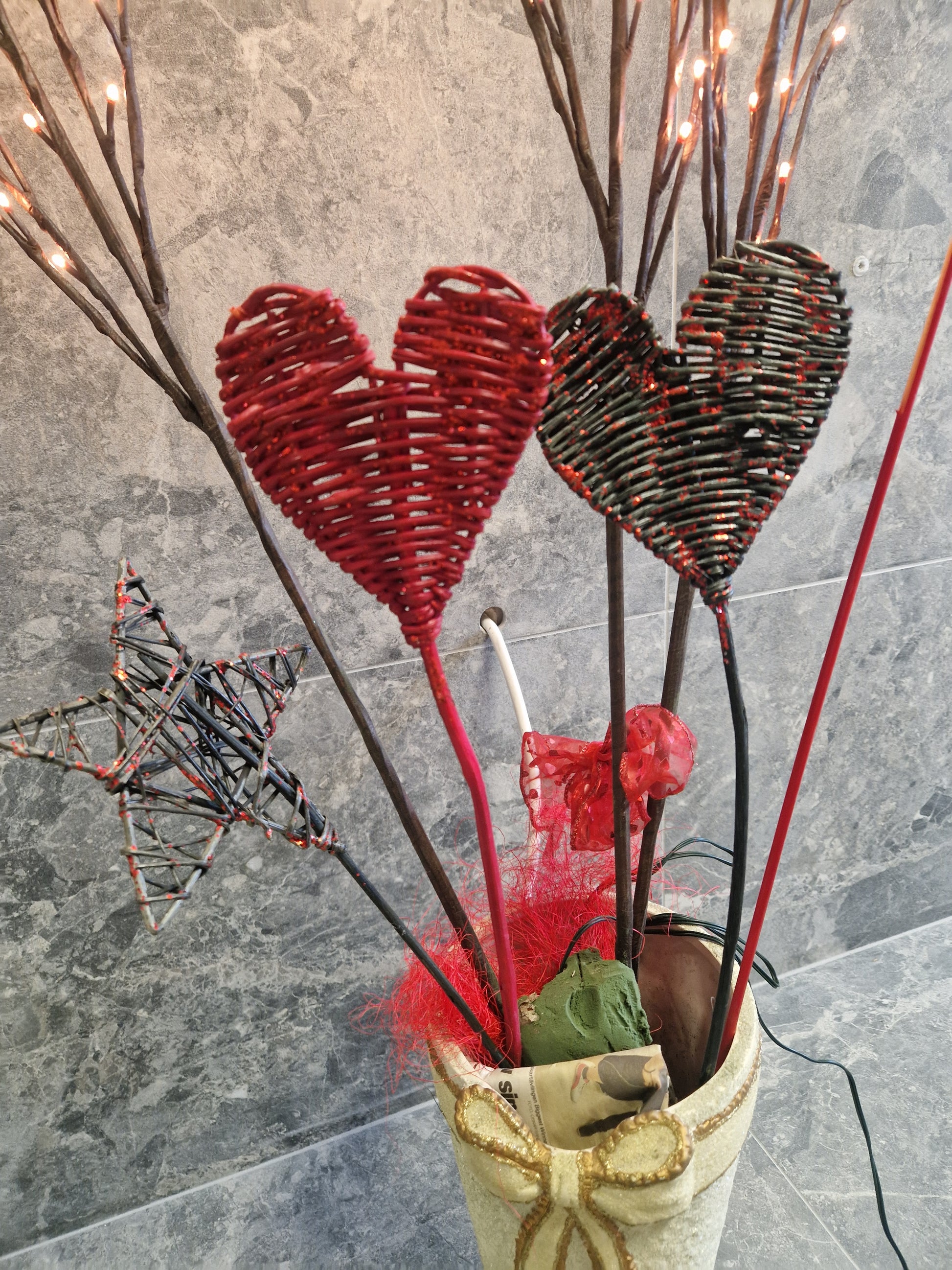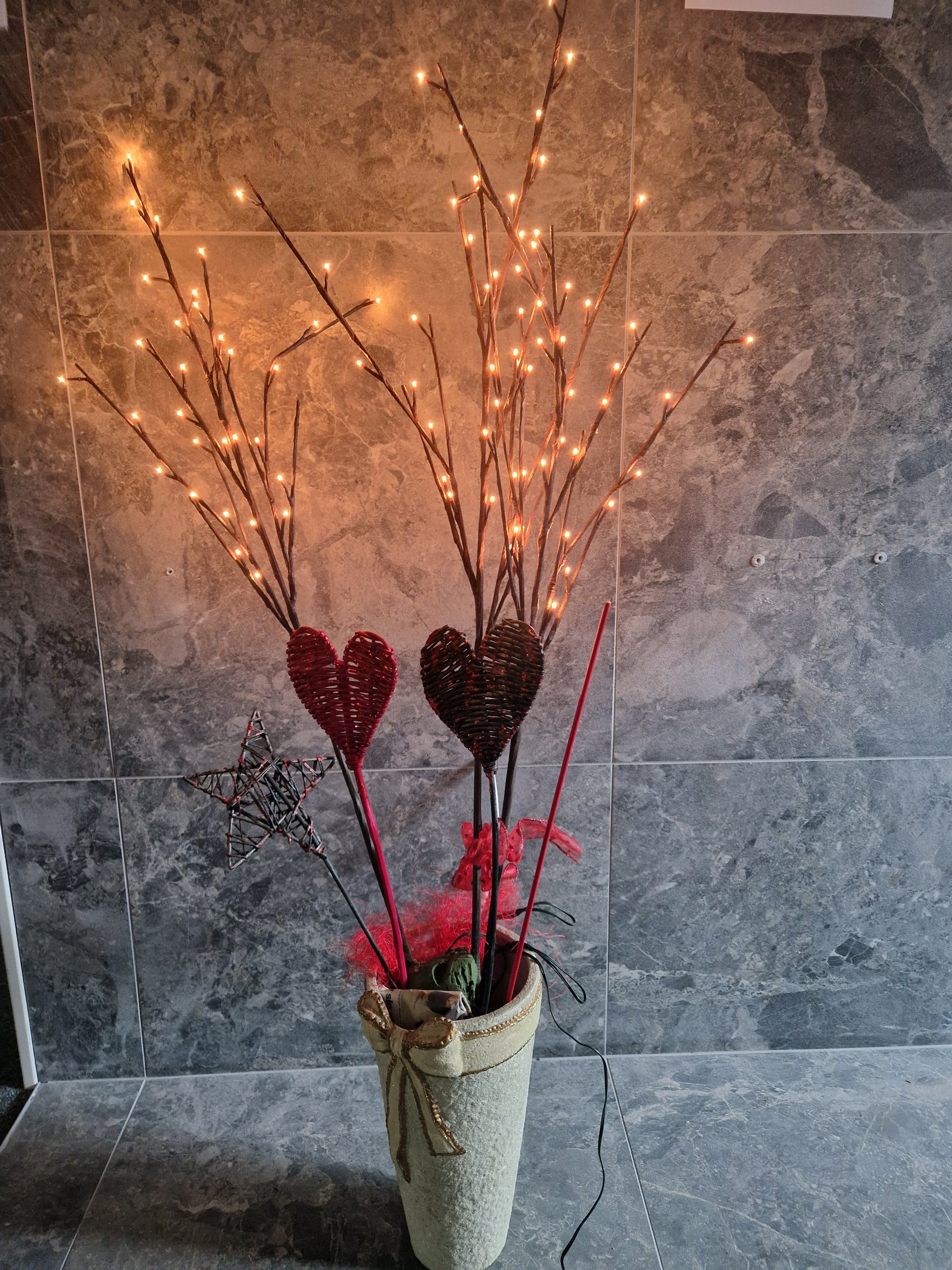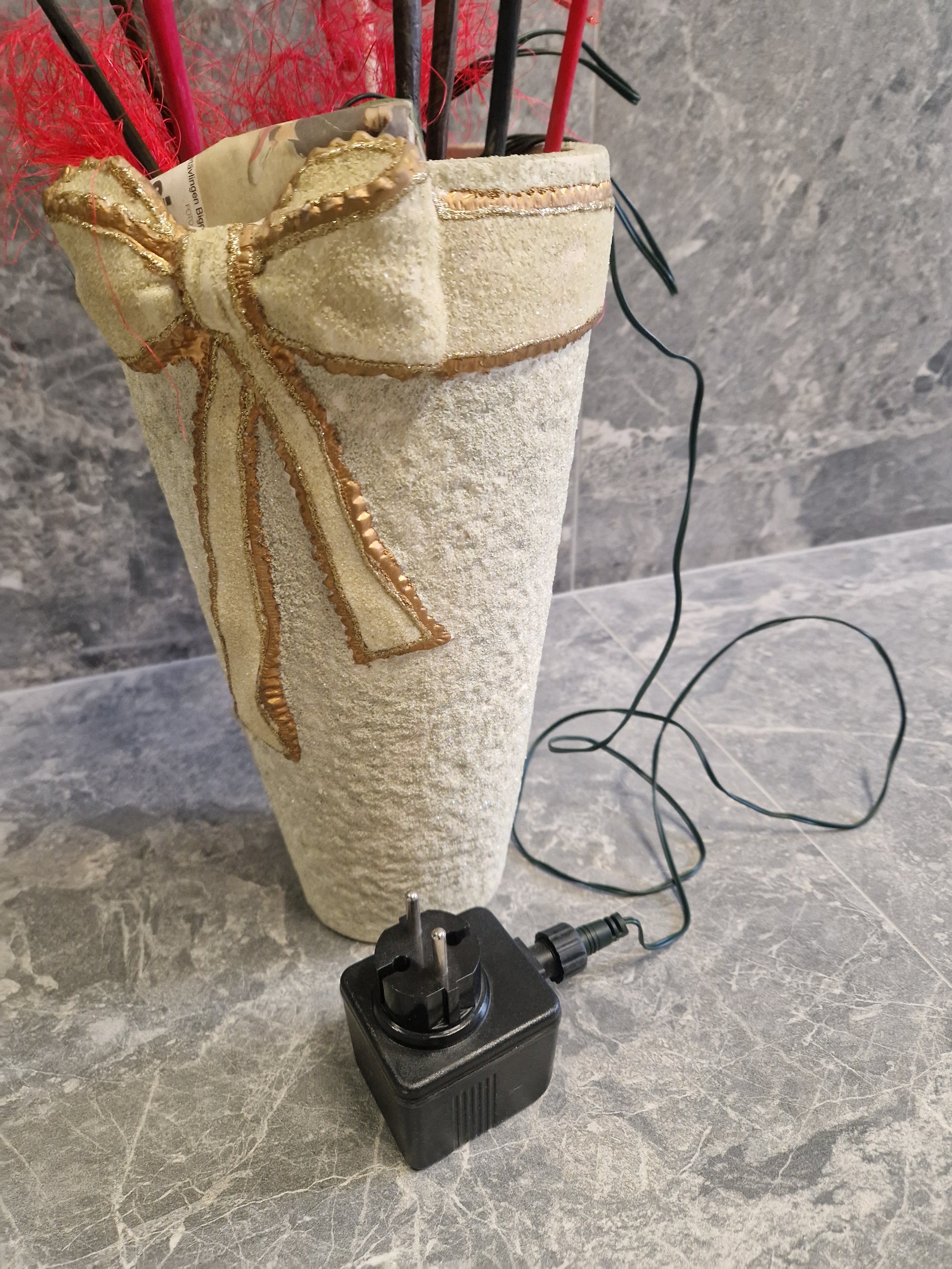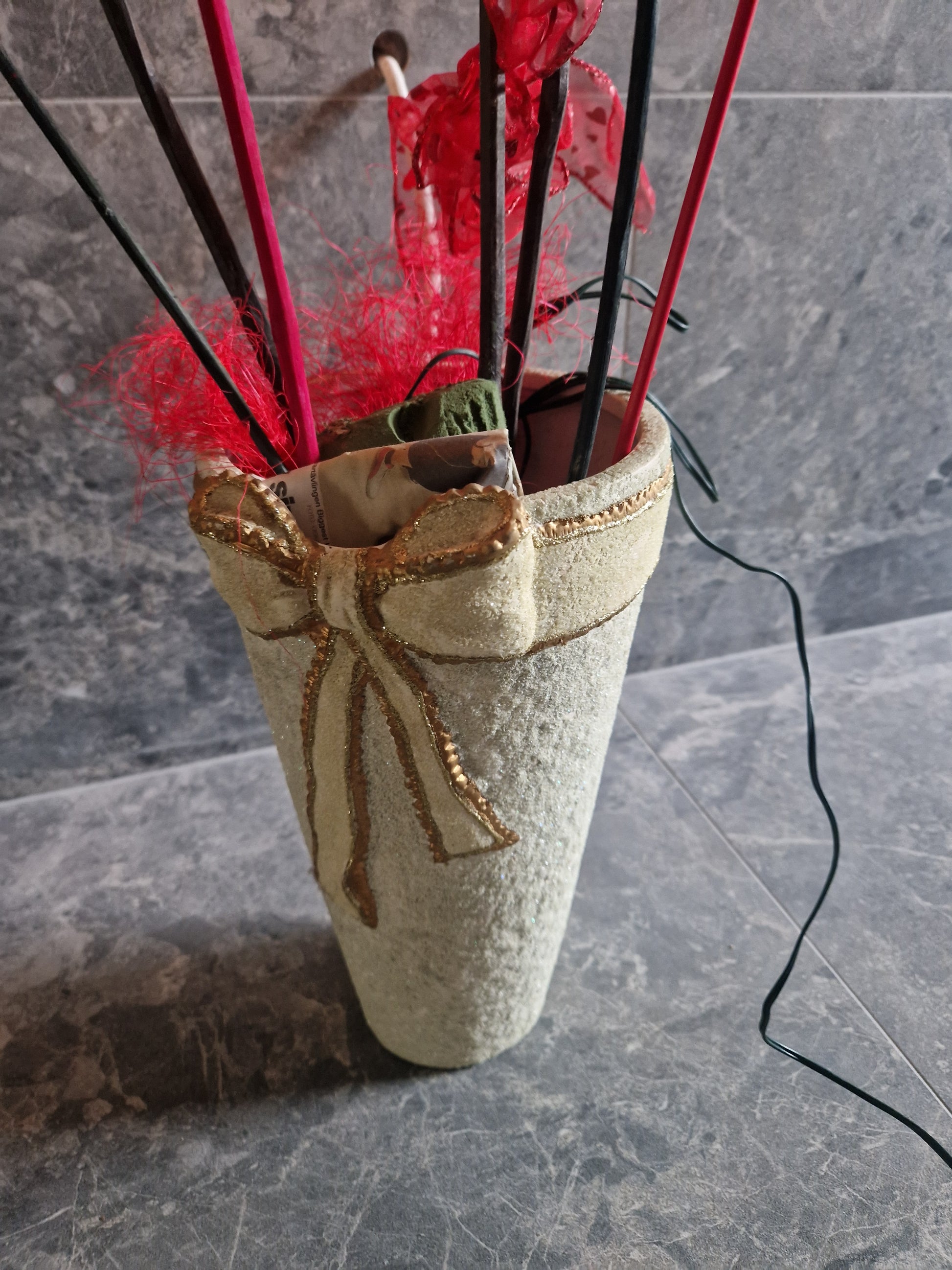 Julkruka med rosett i beige & guld. Krukan höjd ca 31cm och diam ca 16cm. Totalhöjd ca 110cm.