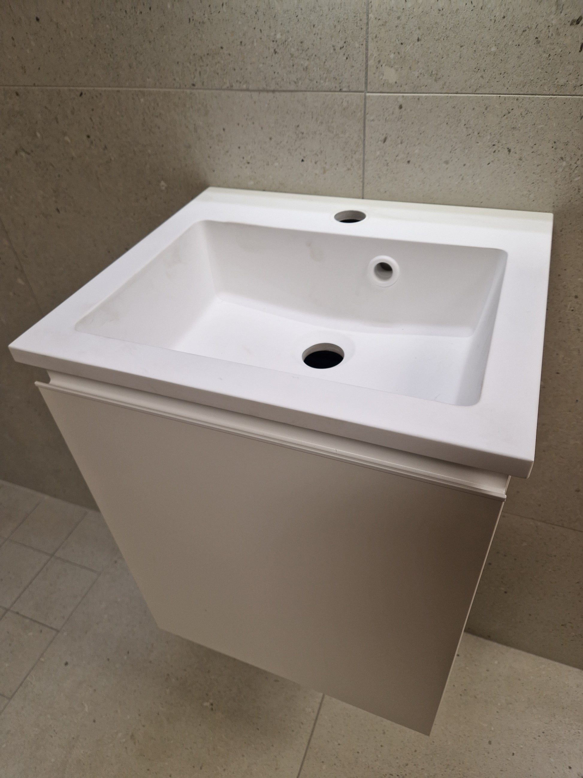 Vask i mattvitt utförande med bredd 40cm X 35cm Vit kommod passande vasken, med höjd 49cm. Spegel med tillhörande belysning. Spegelns bredd 40cm och höjd 72cm.