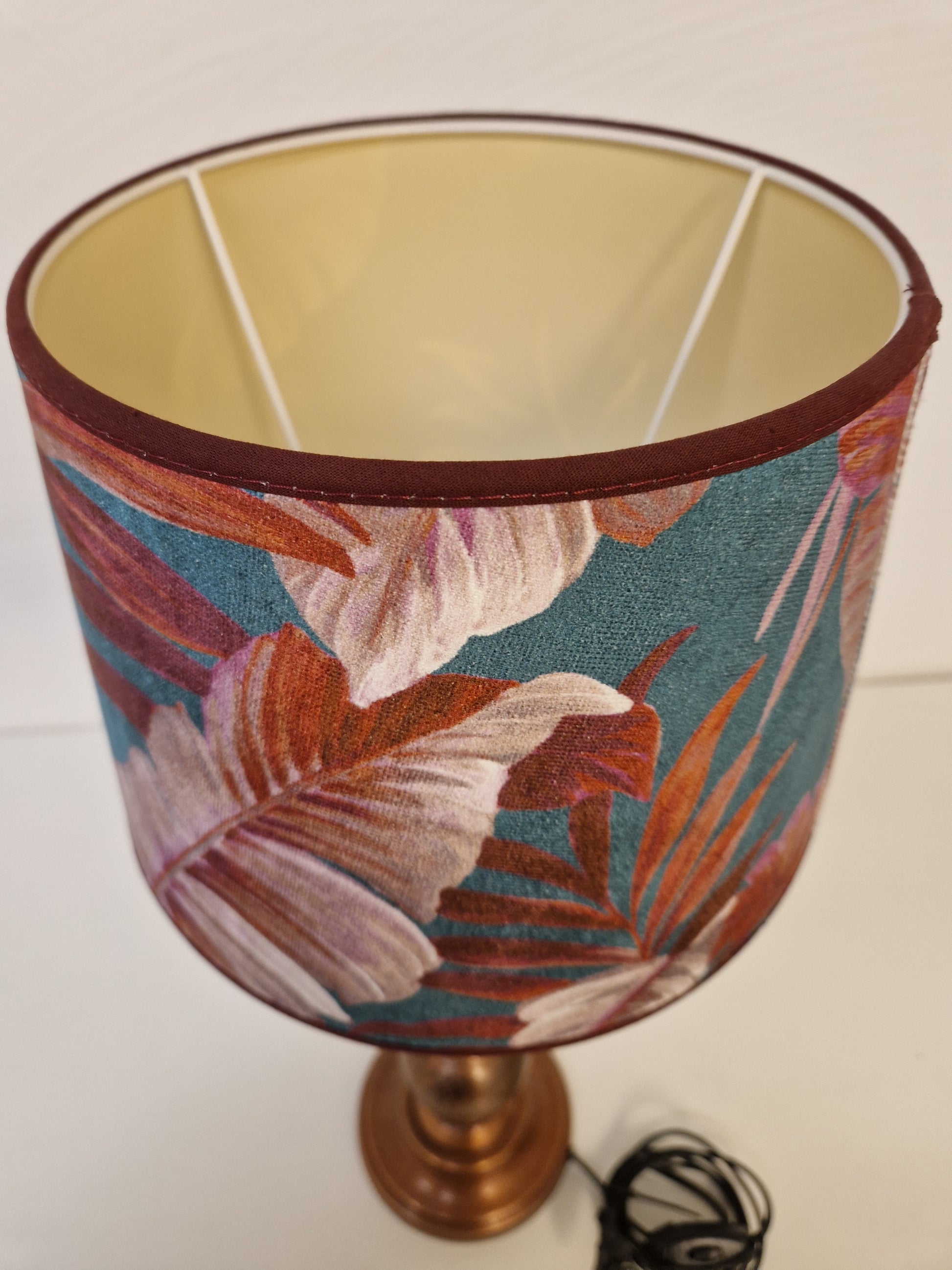 Bordslampa med fot som har en metallisk finish i bronsfärgat utseende.