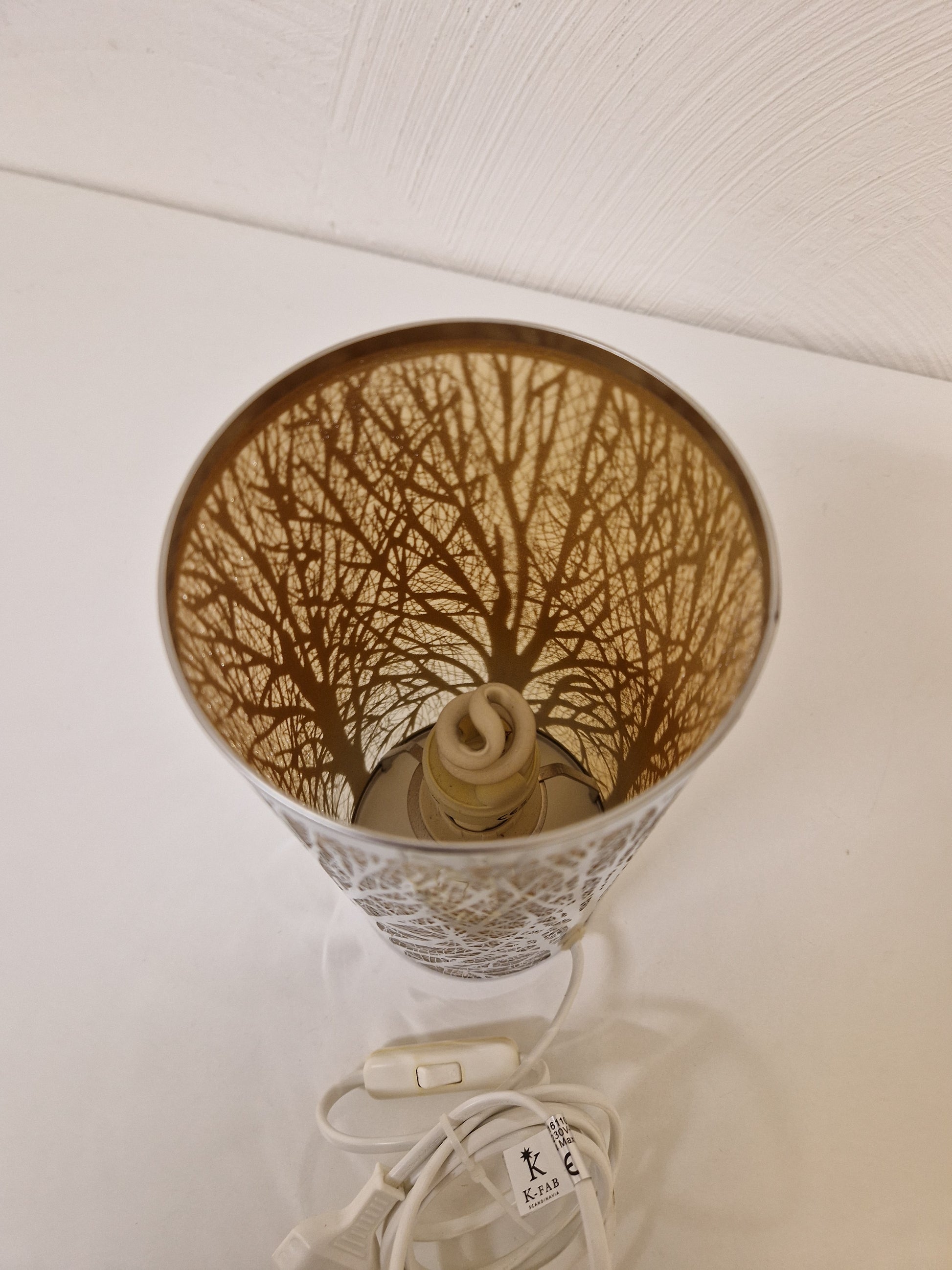 Bordslampa med skärm i utskuren folie och med trädmotiv.
