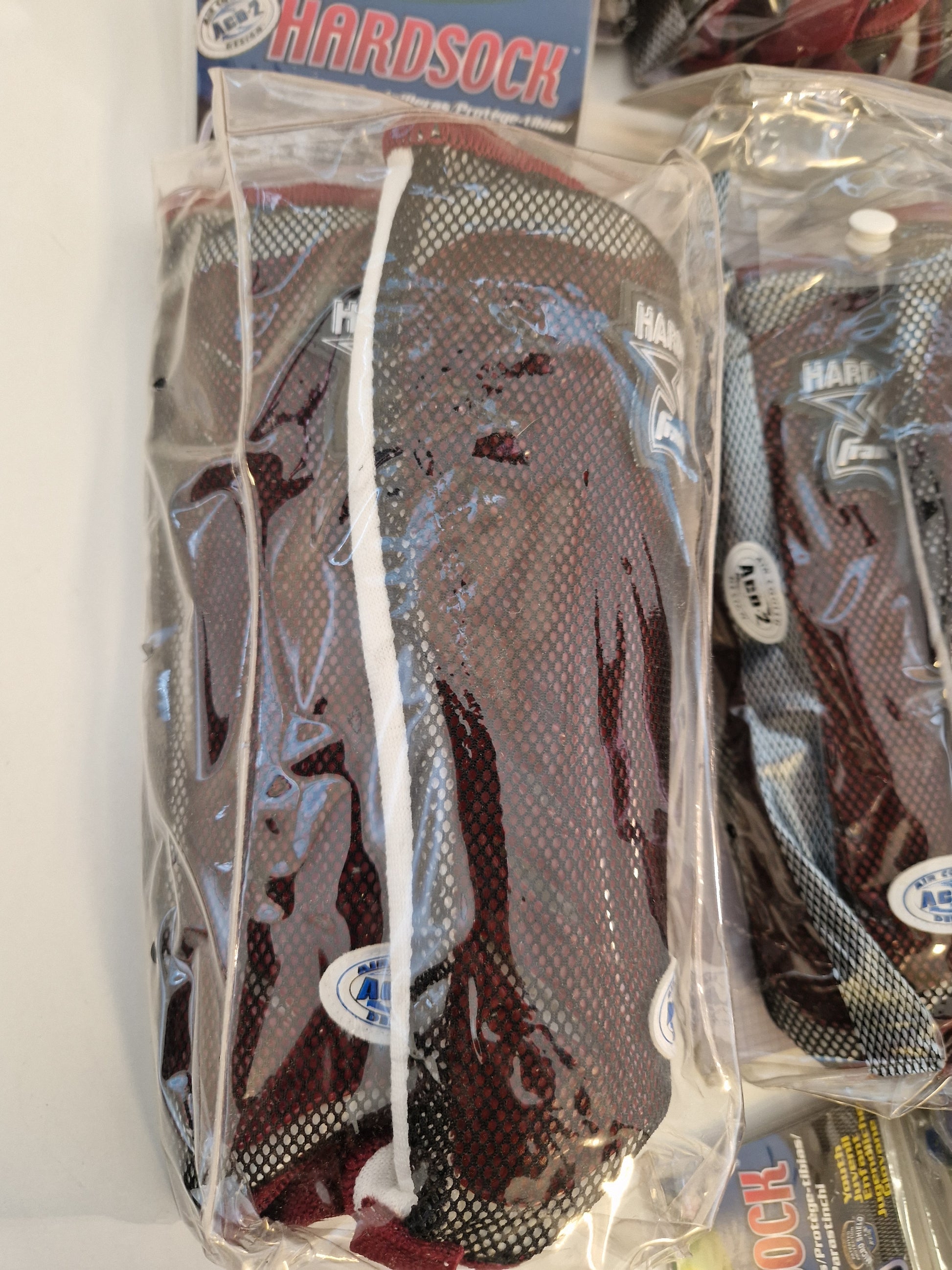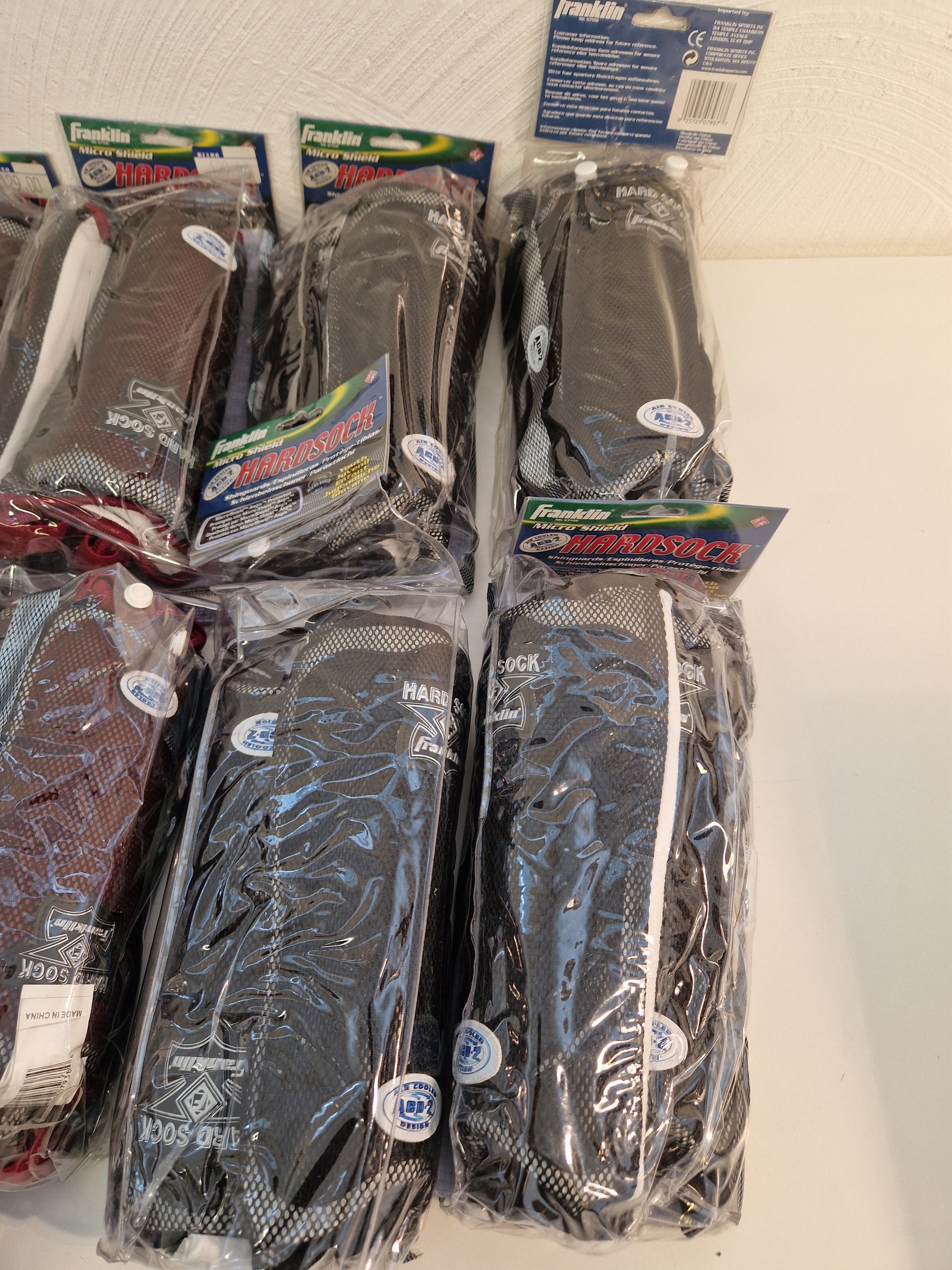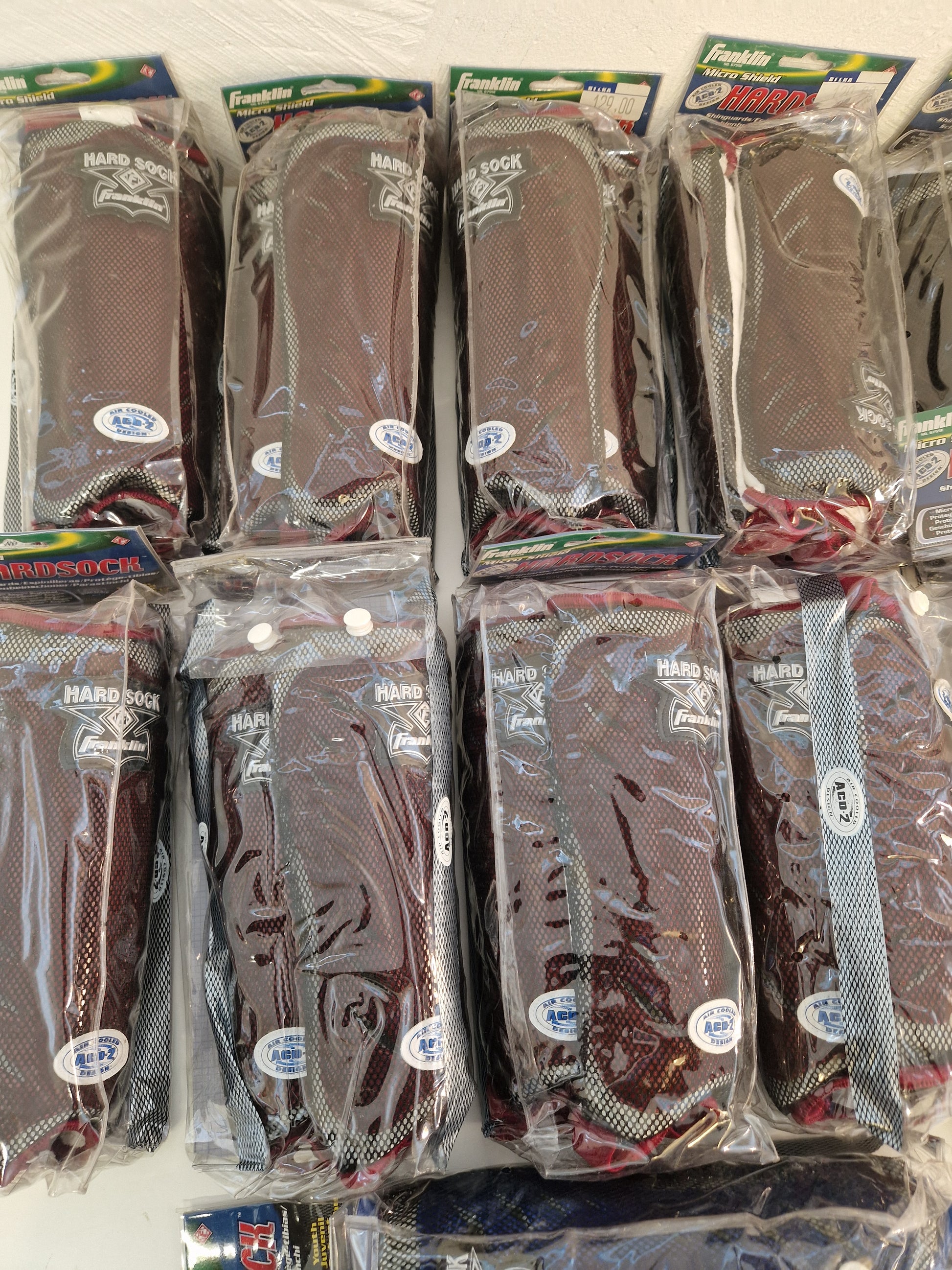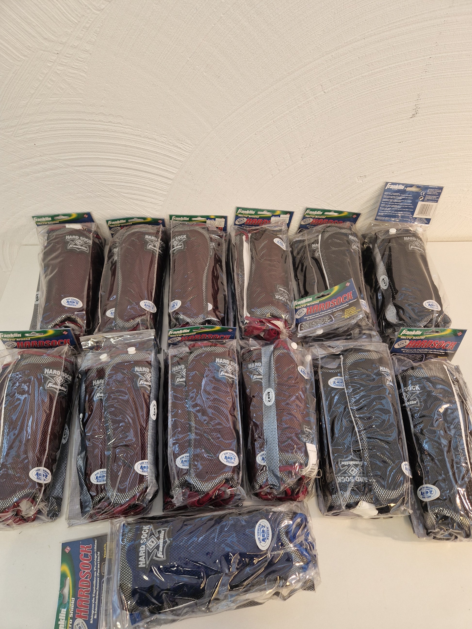 13 par fotbollsbenskydd av lättviktsmodell, fördelat på 8 par vinröda, 4 par svarta samt ett par mörkblå.