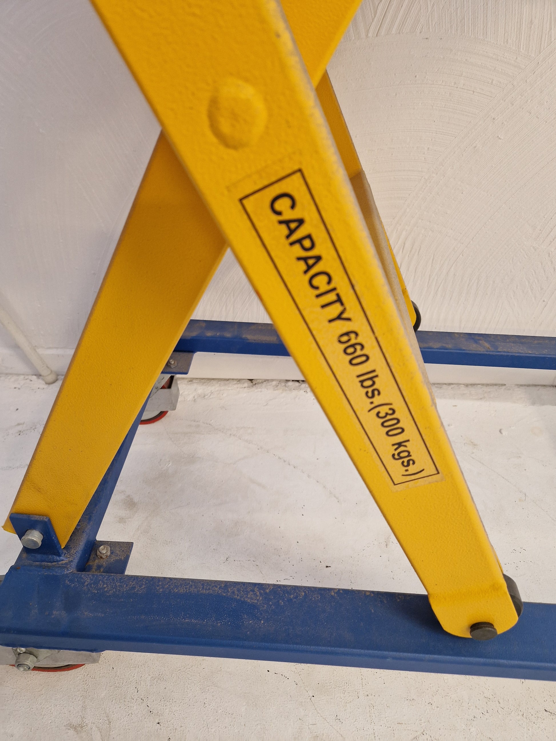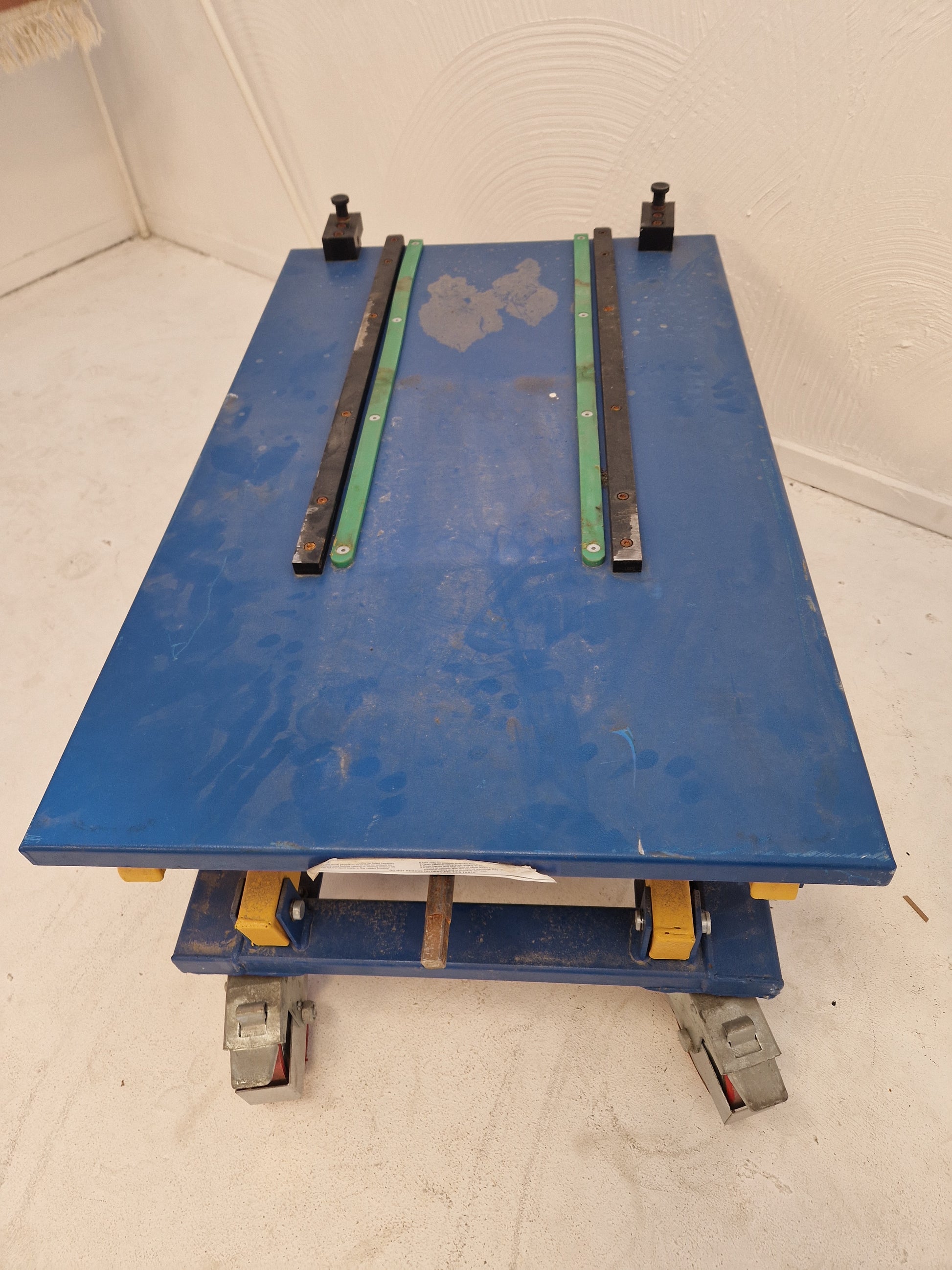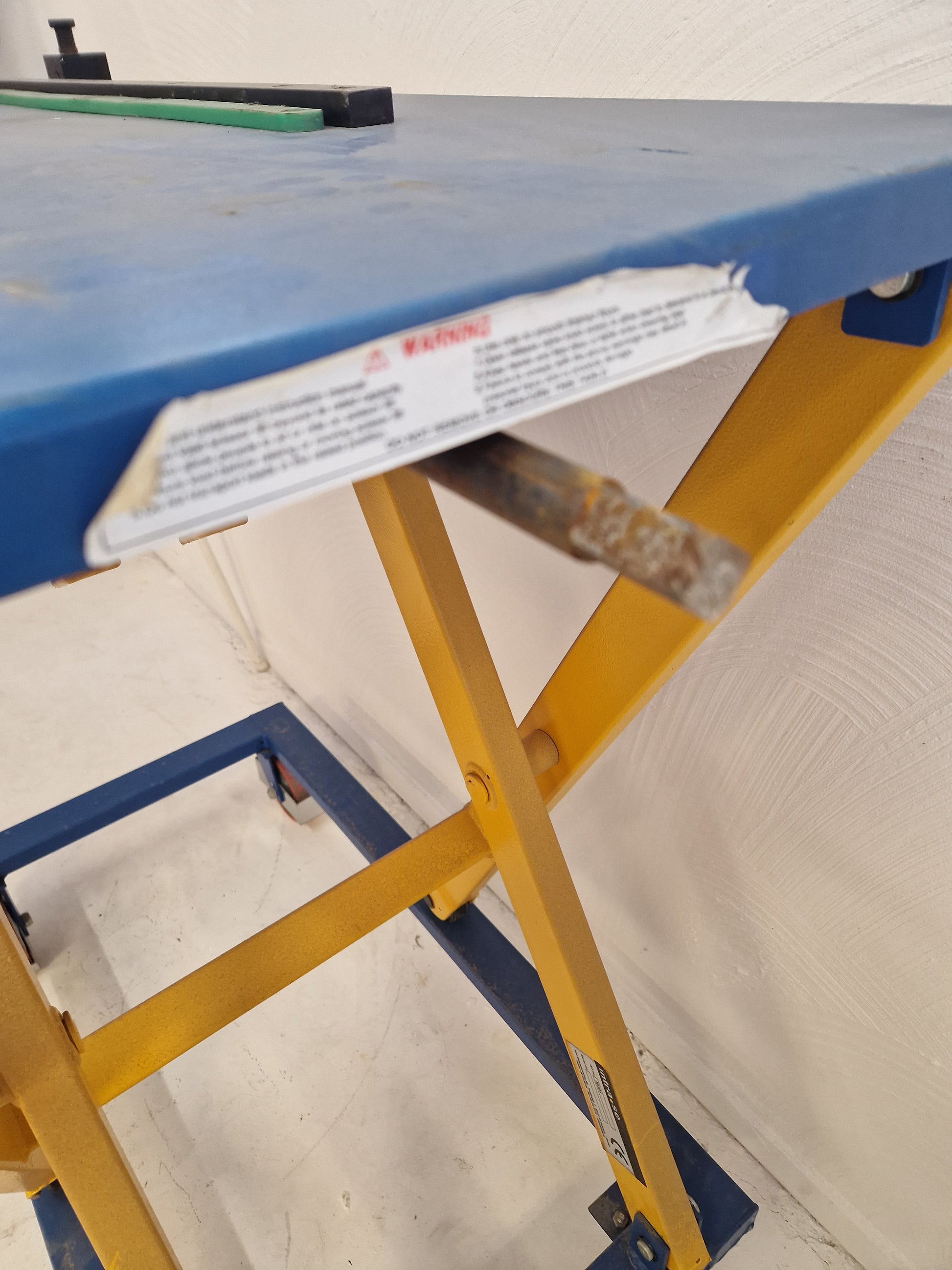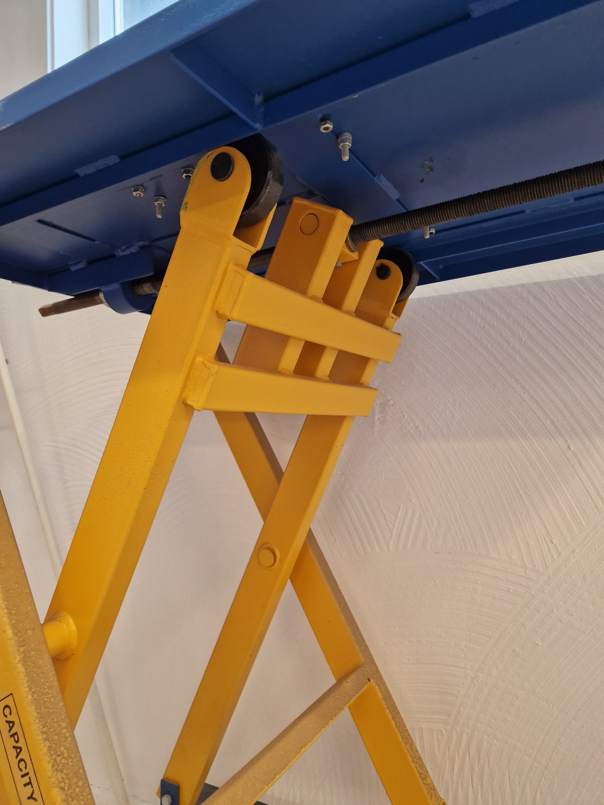 Manuellt lyftbord som tyvärr saknar sin vev för att höja och sänka bordsskivan, men fyrkantsfästet för veven mäter ca 15mm, så en 17mm hylsa eller ringnyckel gör samma jobb.