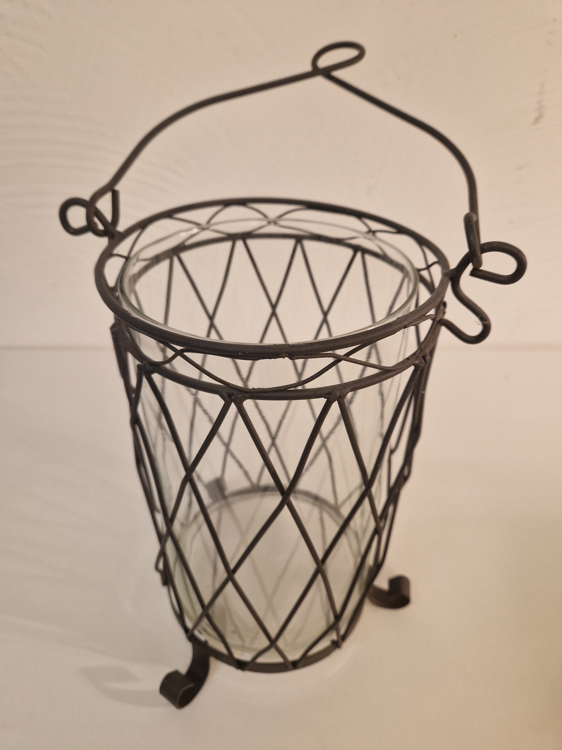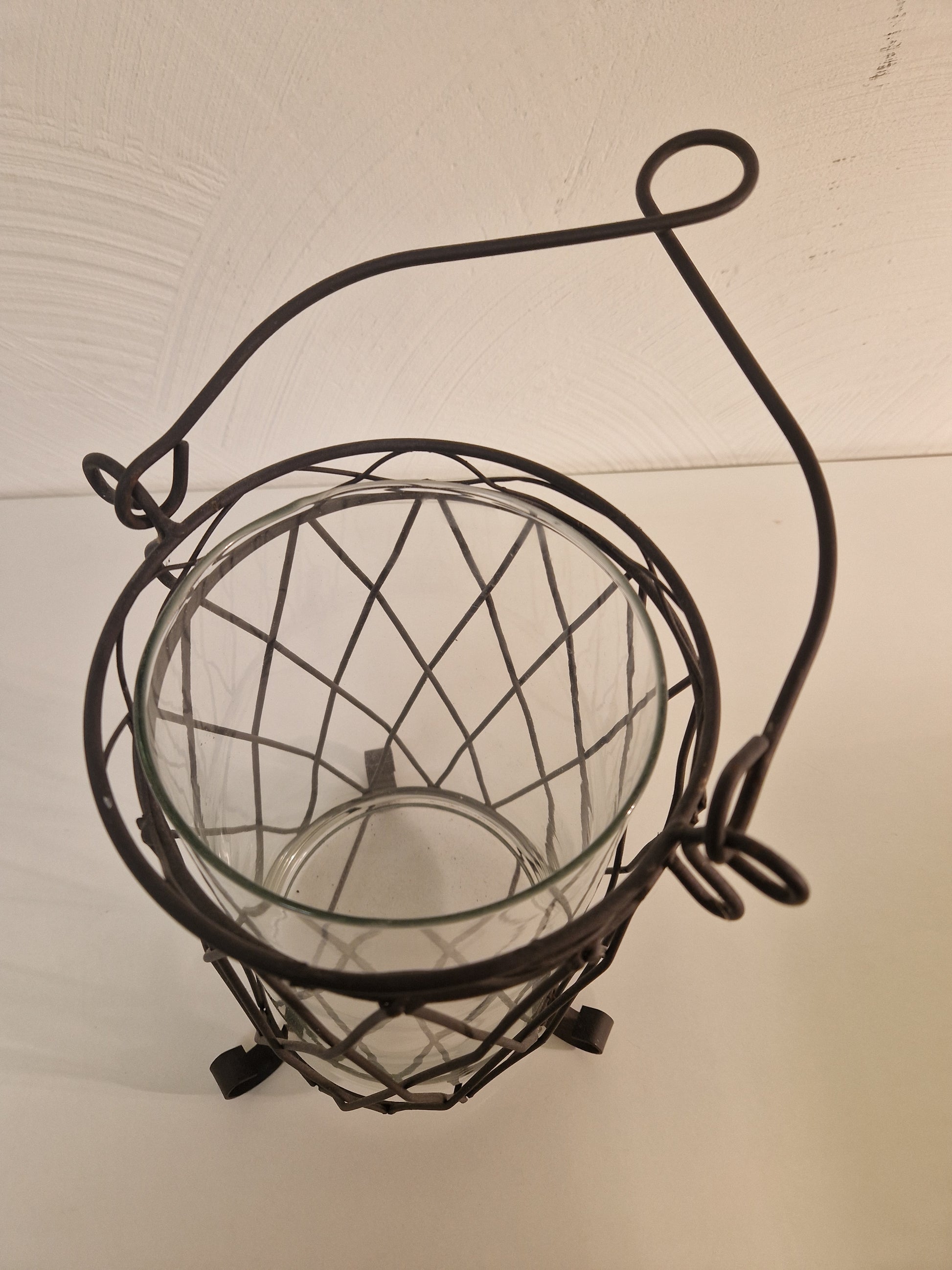 Ljuslykta i smide med ljushållare i glas. Totalhöjden inkl. handtag ca 48cm. (Exkl. handtag ca 29cm med diam. ca 18cm.