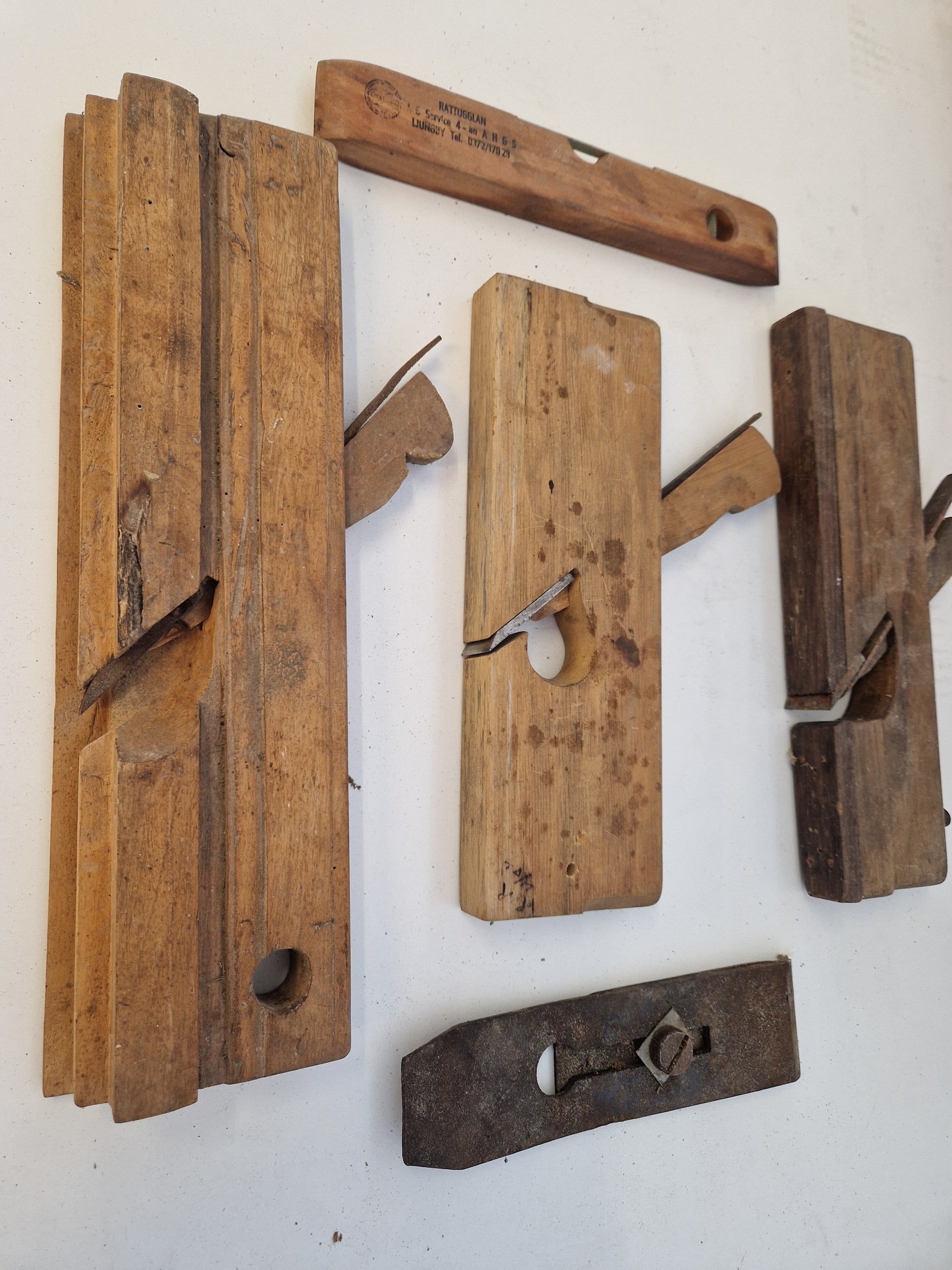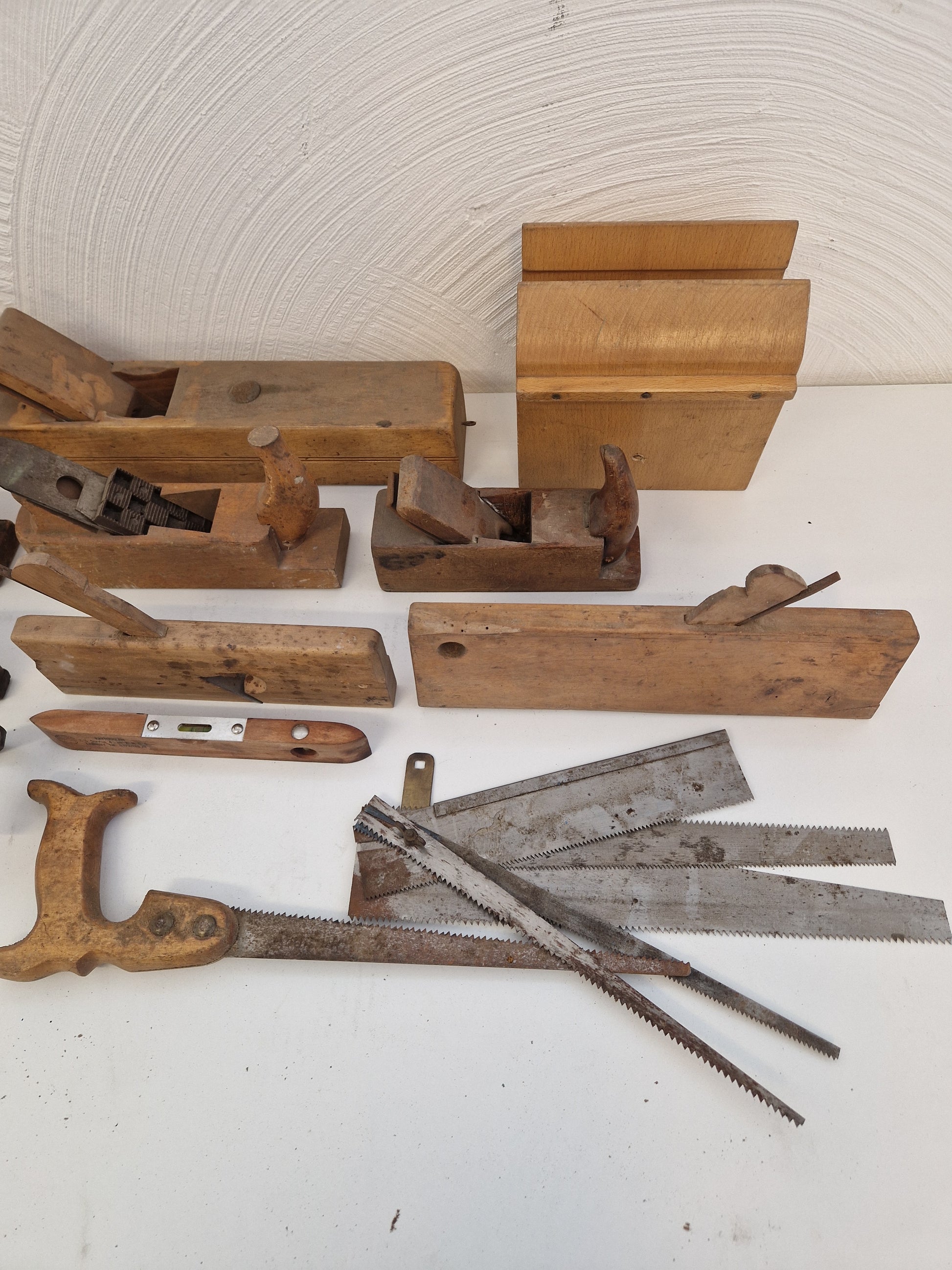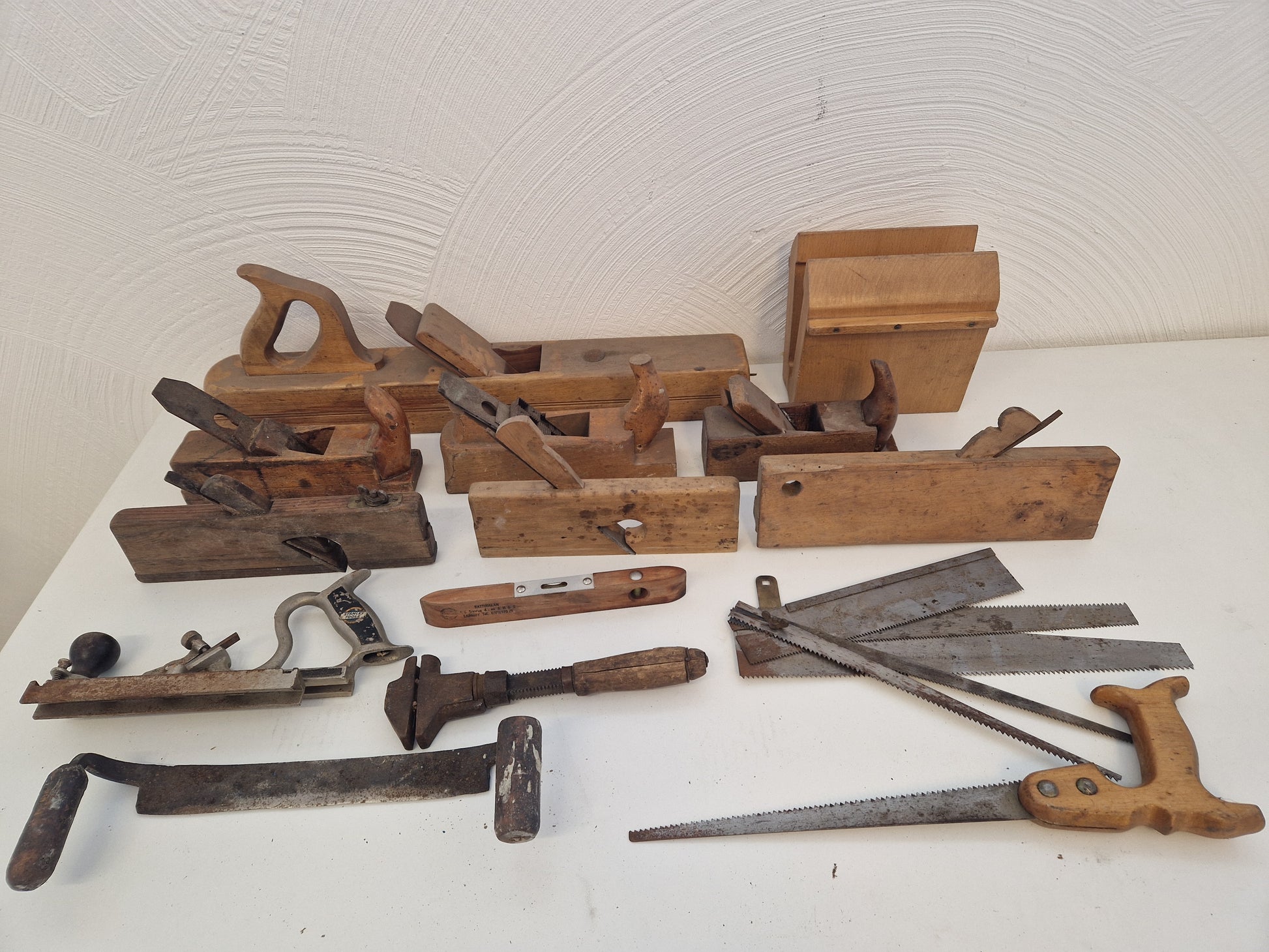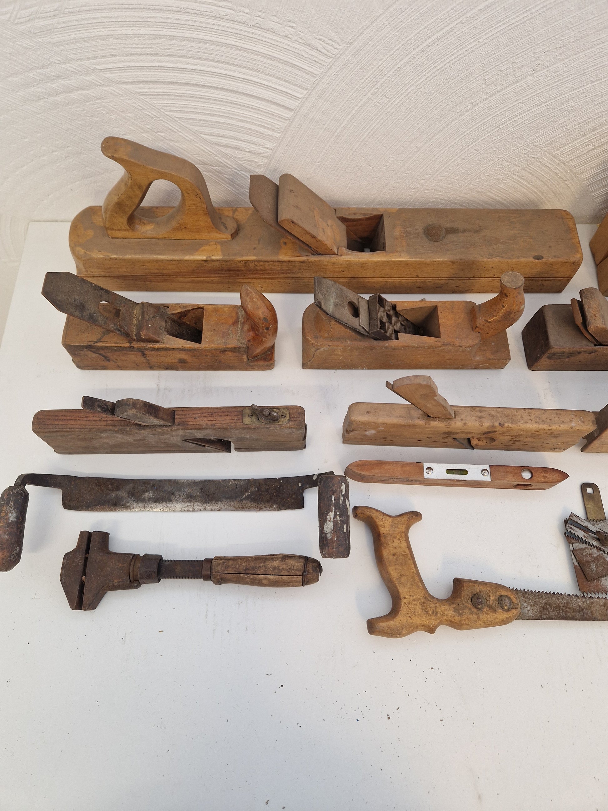 Äldre verktyg enligt bilder, bl.a. rubank ca 60cm, vattenpass "Rattugglan", sponthyvel Stanley som tyvärr saknar ena skärstålet, 3st trähyvlar, 3st spont-/kanthyvlar, sticksåg med utbytbara sågblad, äldre "skiftnyckel mm.