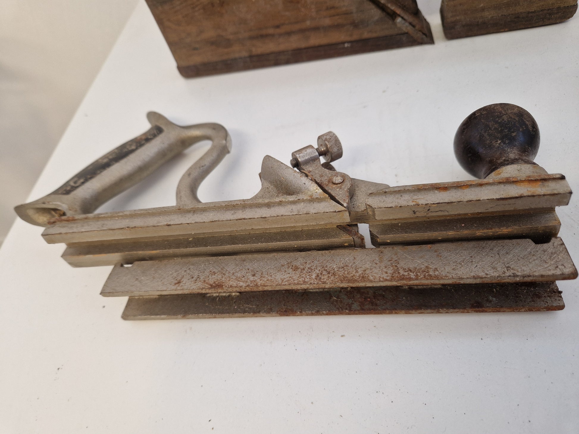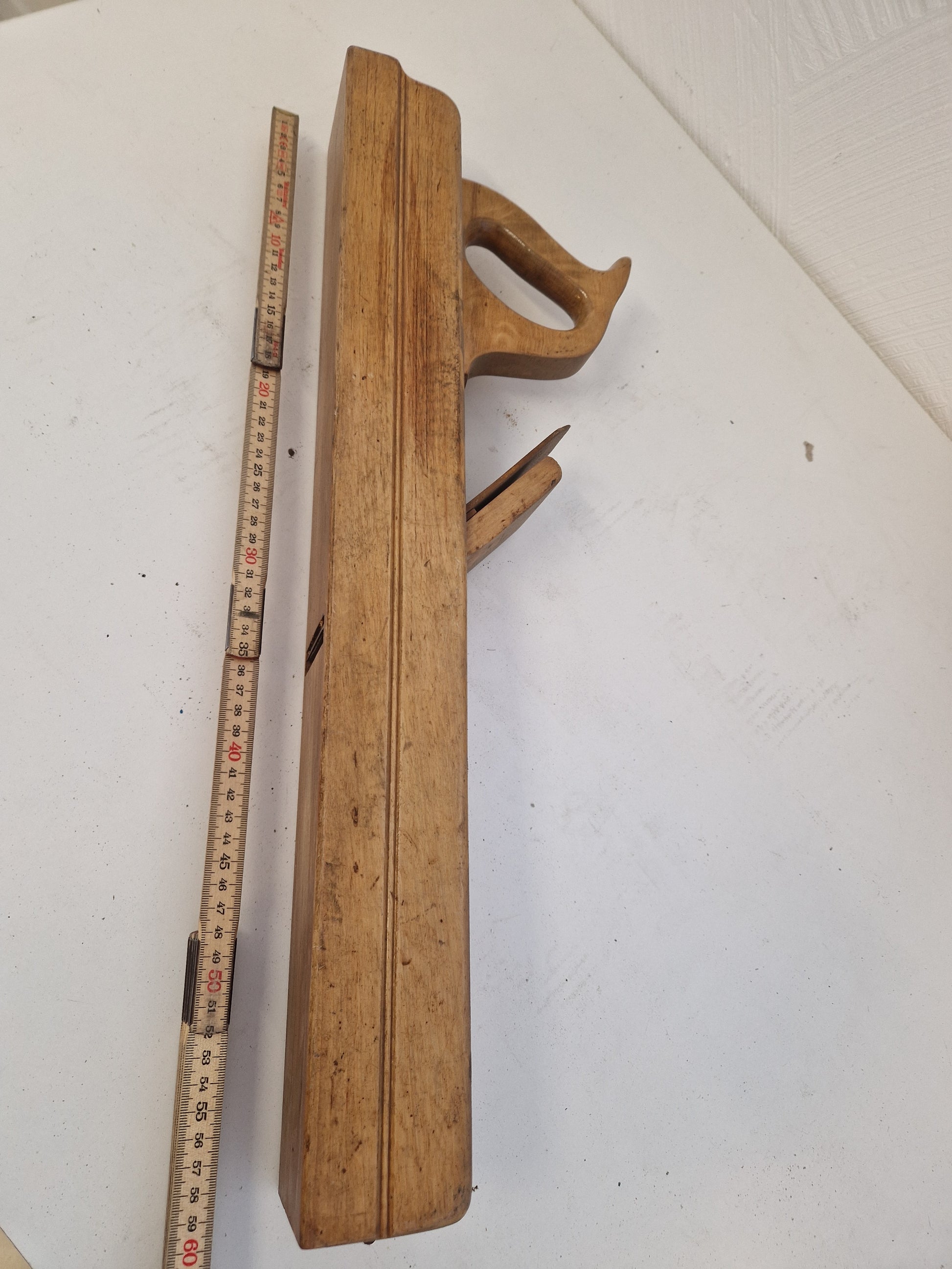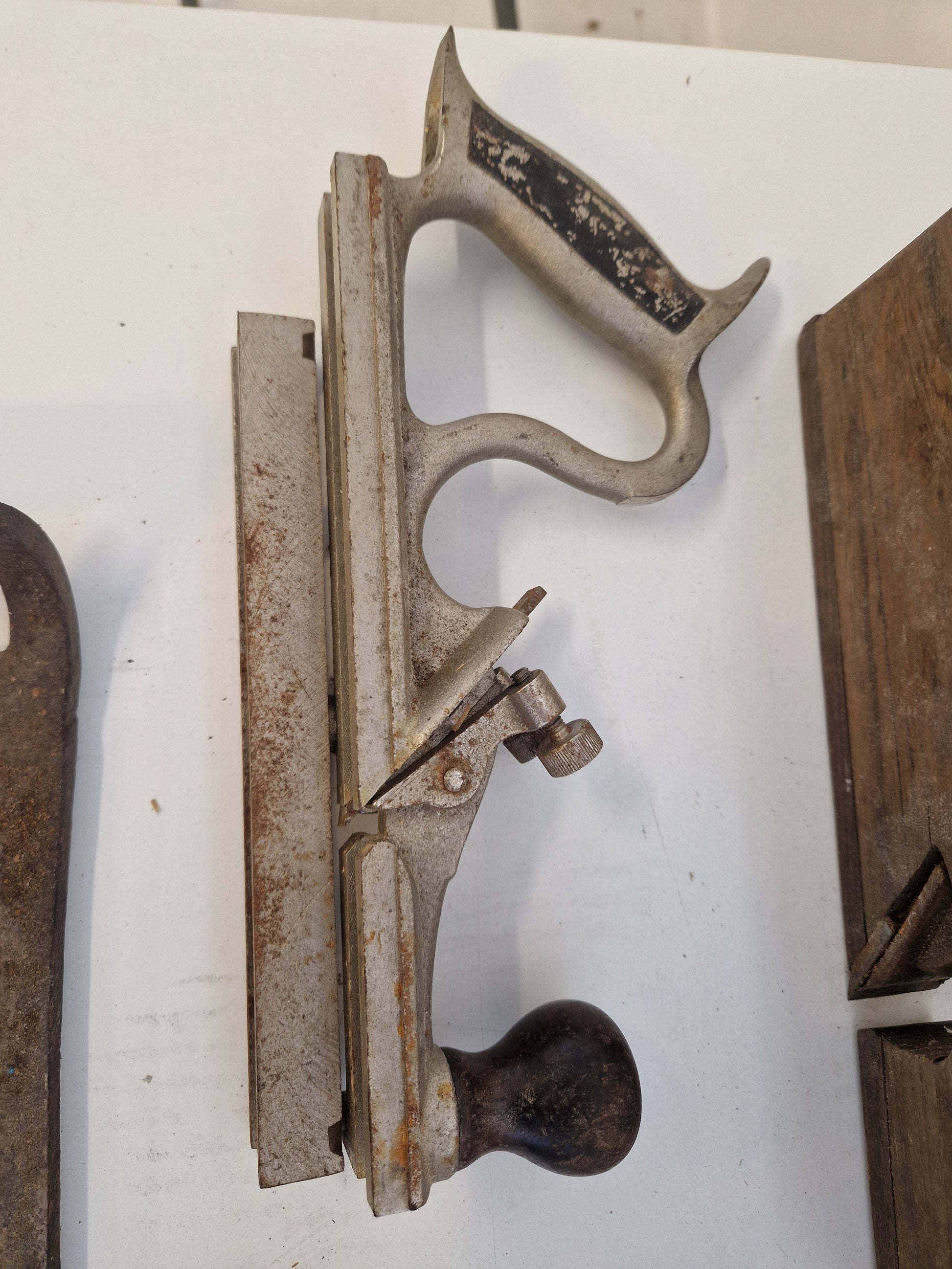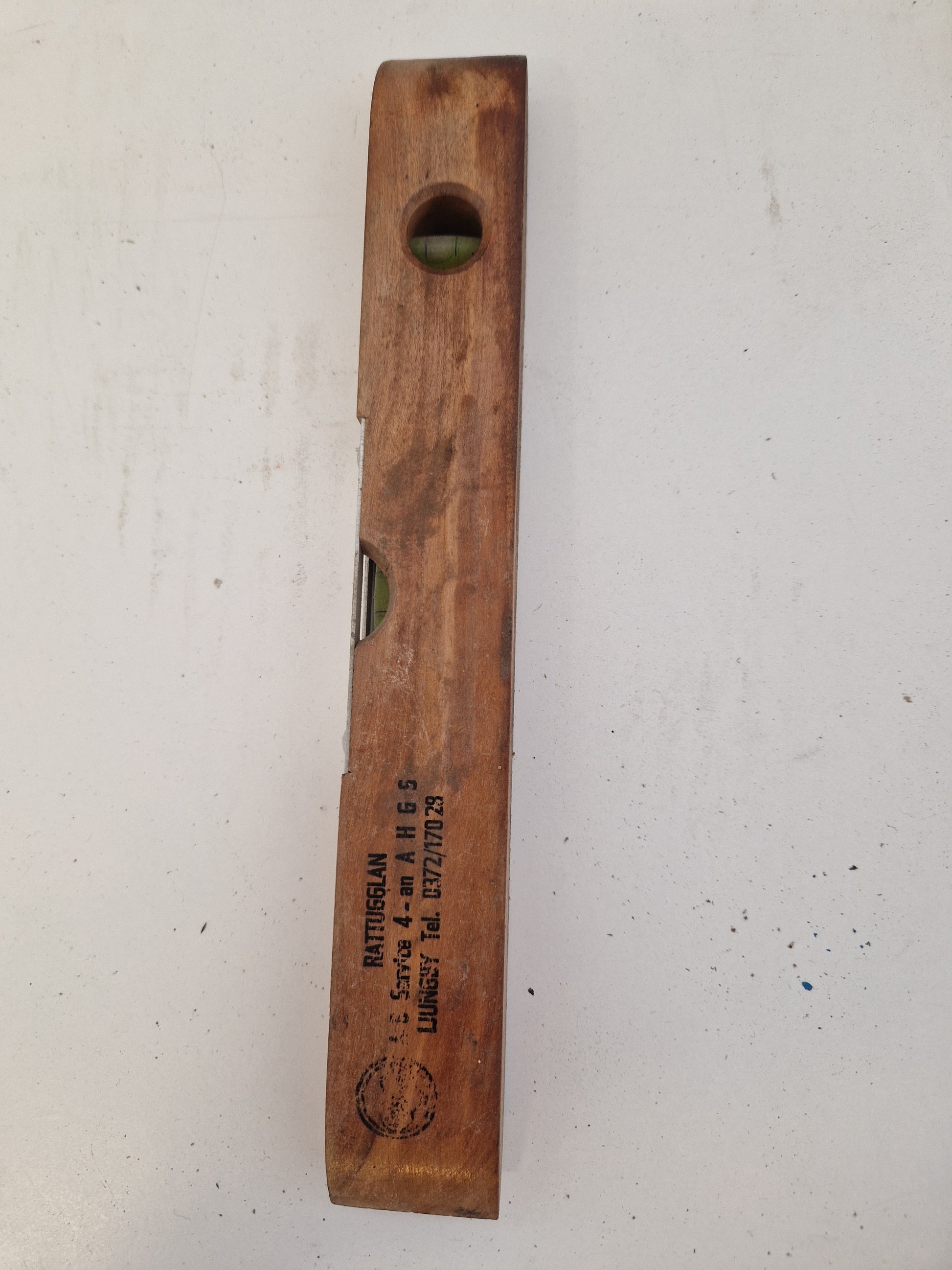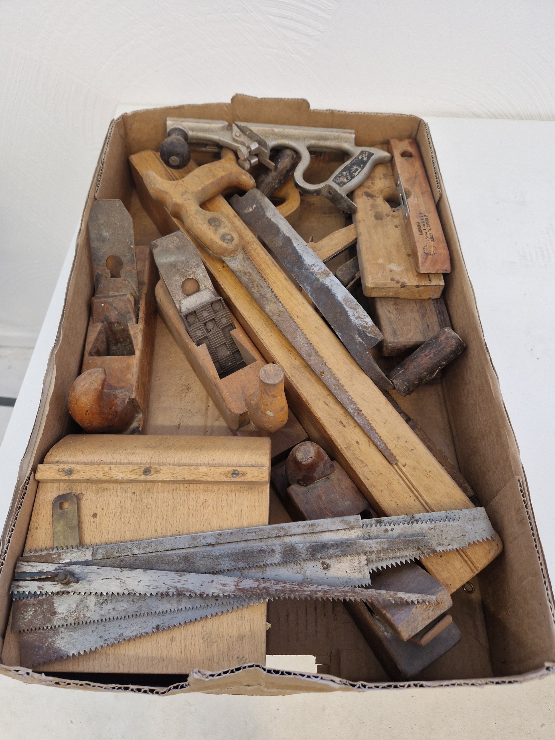 Äldre verktyg enligt bilder, bl.a. rubank ca 60cm, vattenpass "Rattugglan", sponthyvel Stanley som tyvärr saknar ena skärstålet, 3st trähyvlar, 3st spont-/kanthyvlar, sticksåg med utbytbara sågblad, äldre "skiftnyckel mm.