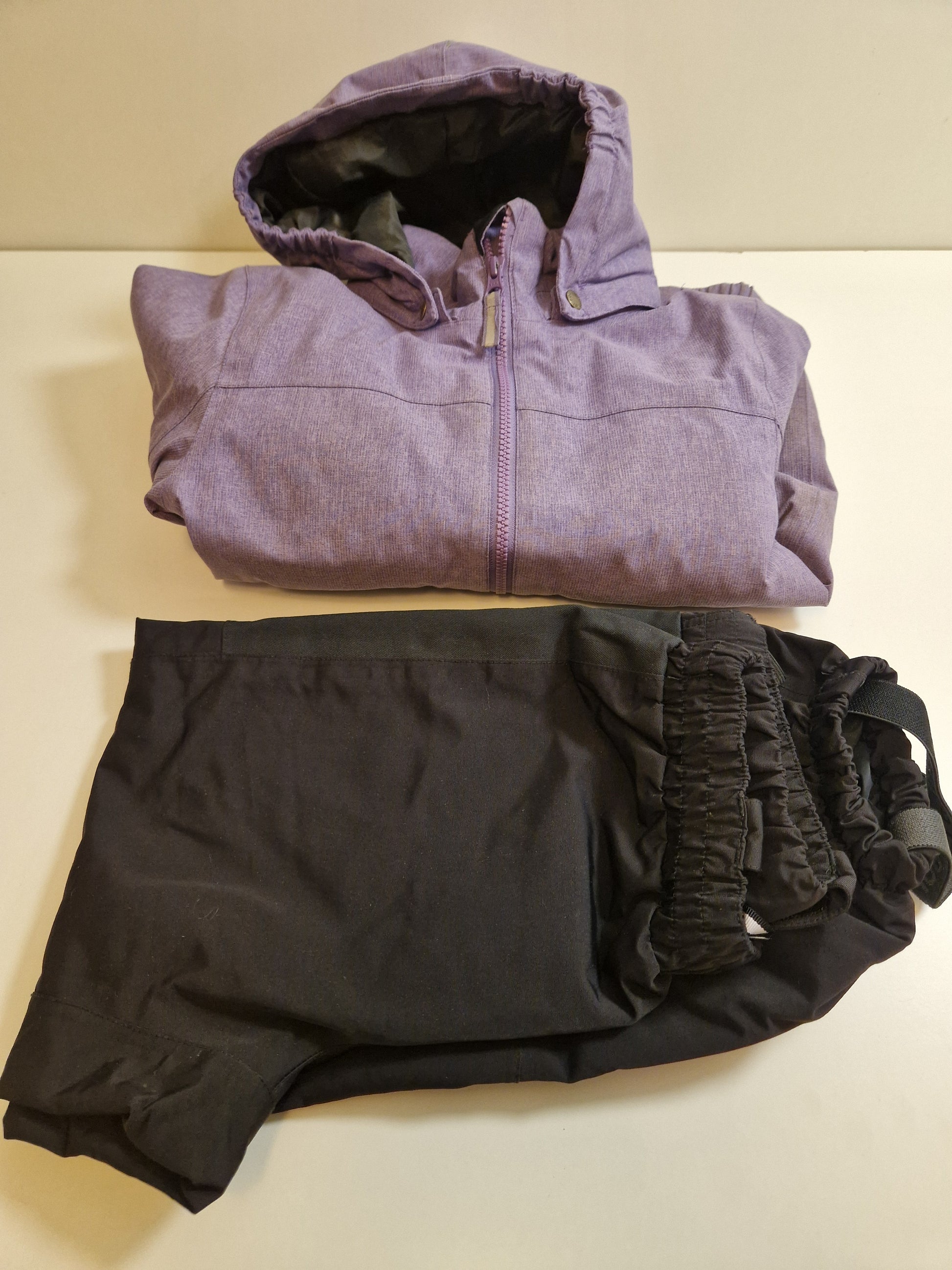 Lila jacka och svarta byxor från Polarn O. Pyret I storlek 122/6-7år.