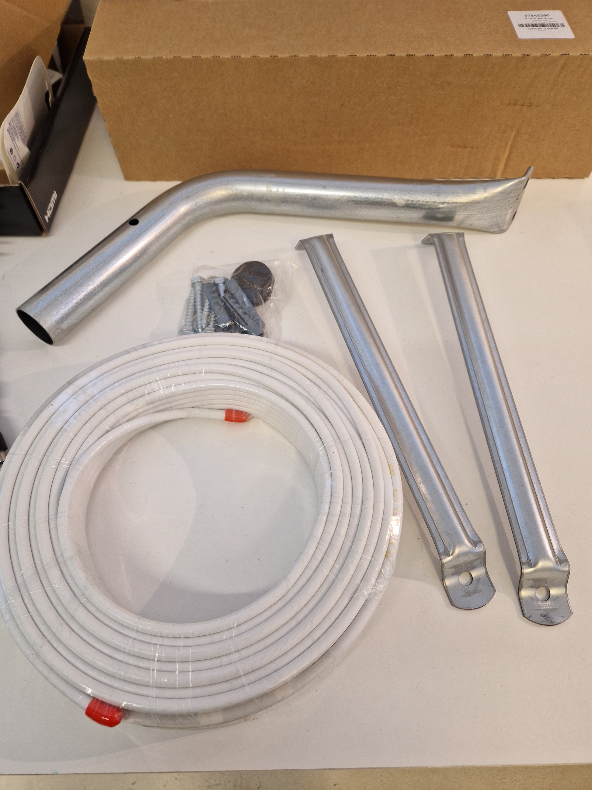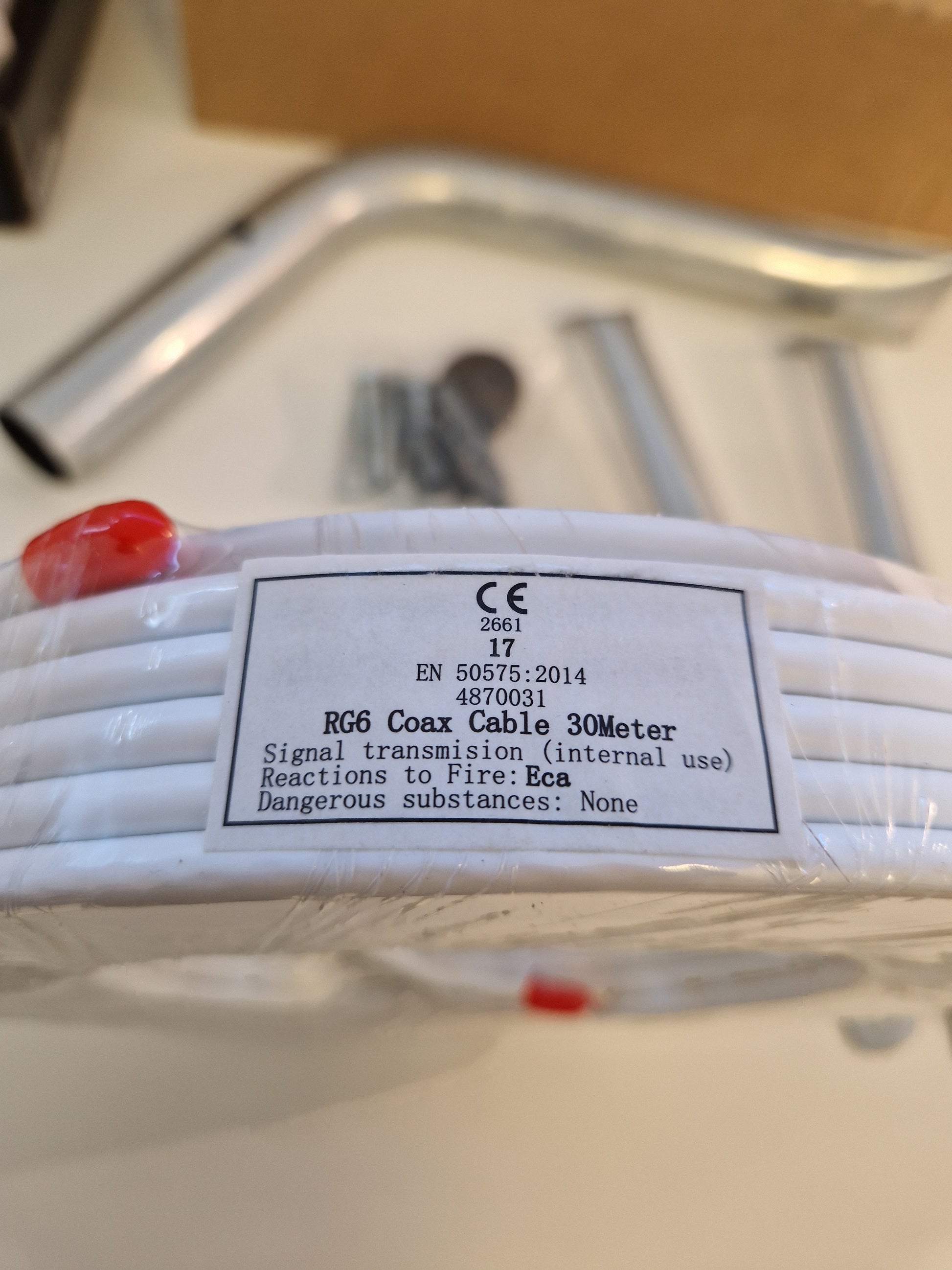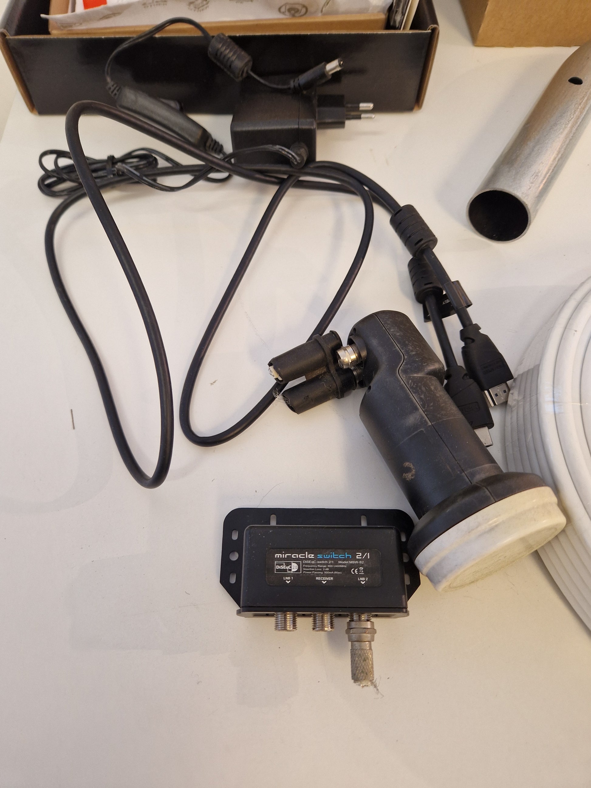 Div. monteringstillbehör, beg. LNB huvud, nätkabel, HDMI-kabel, coxkabel 30 m, mm.