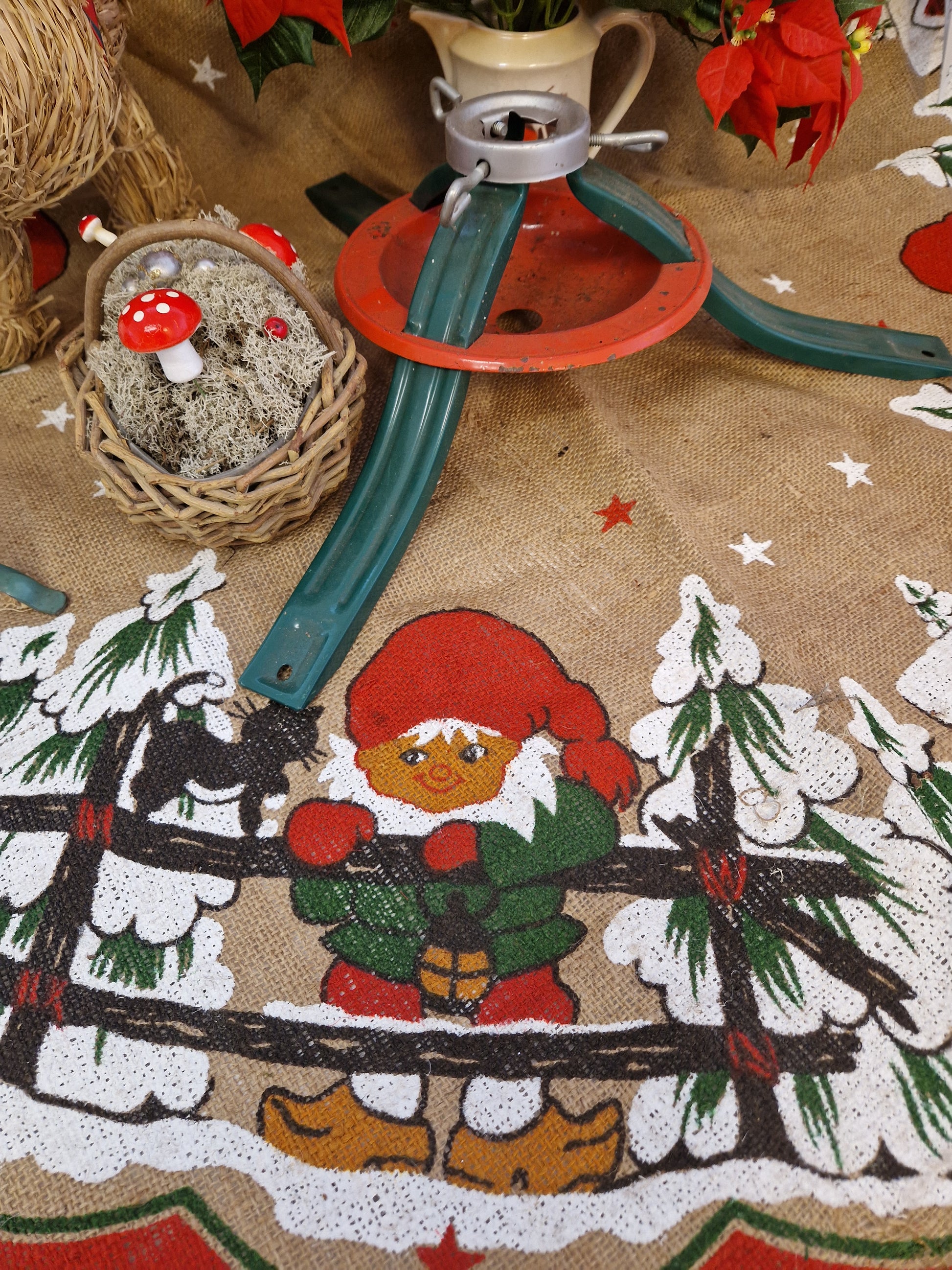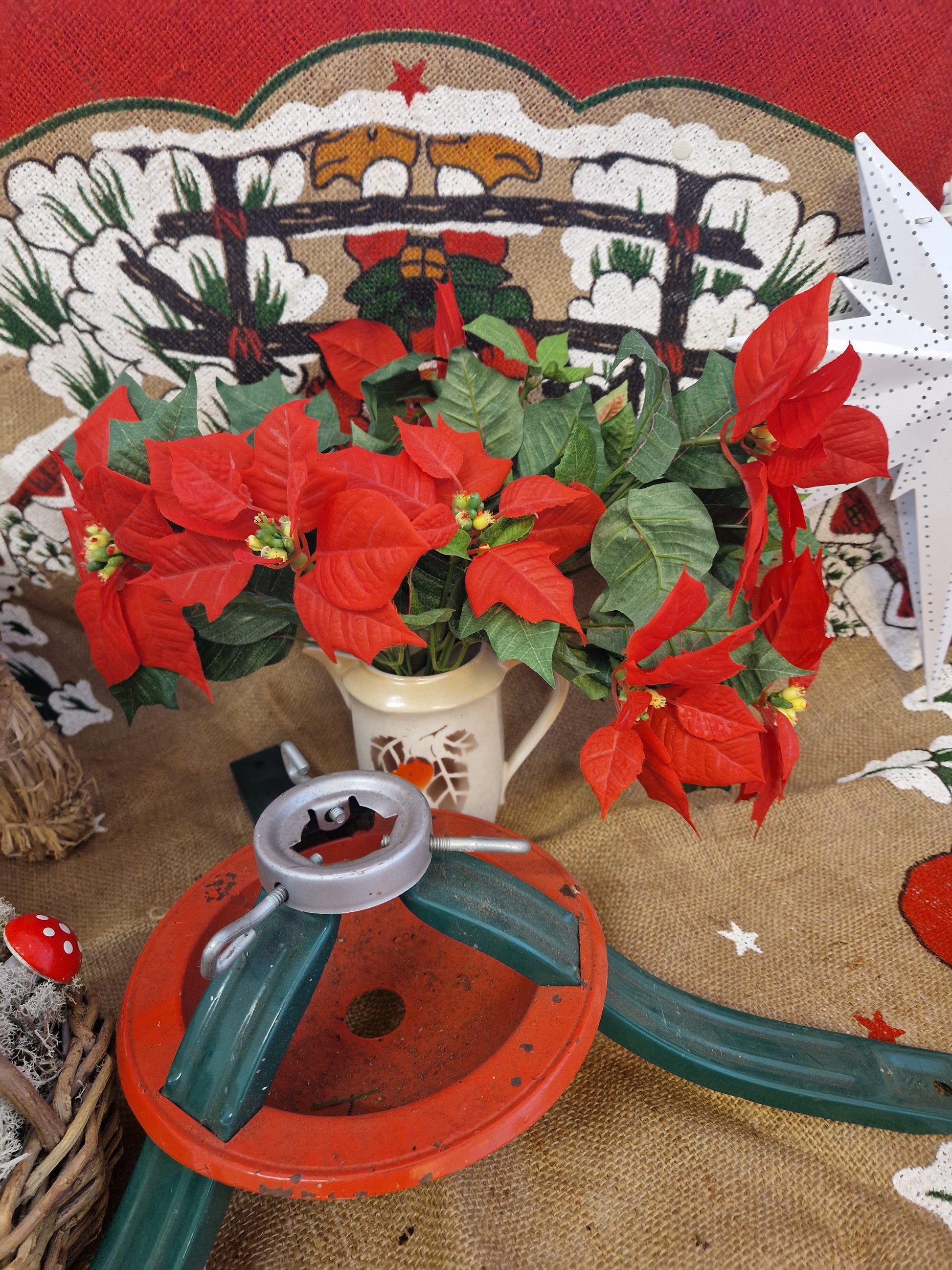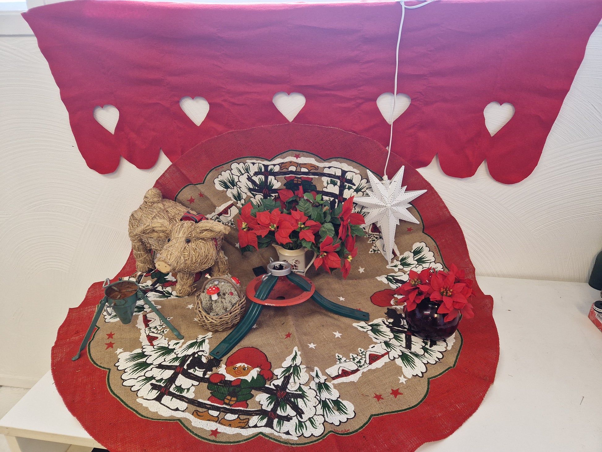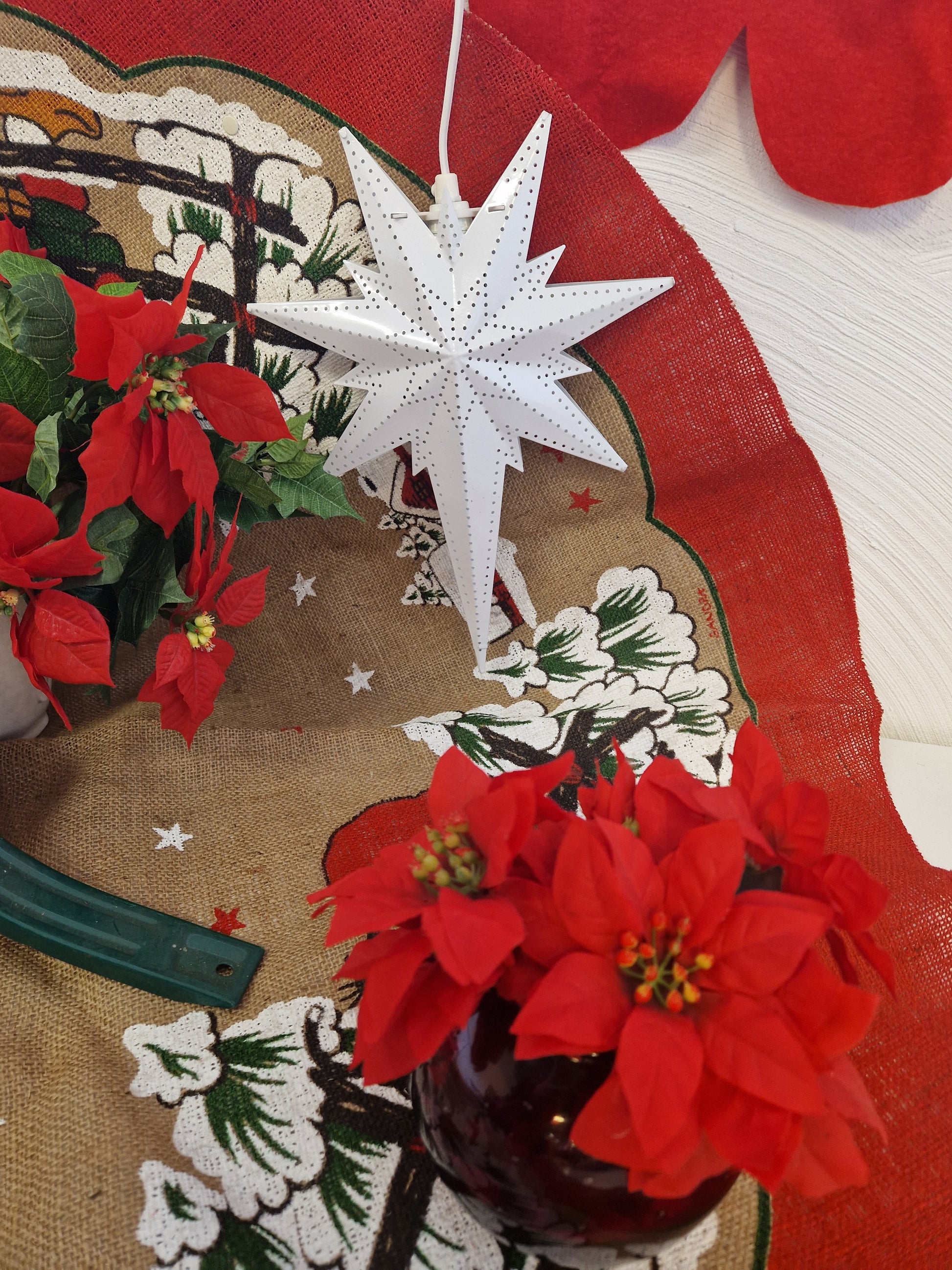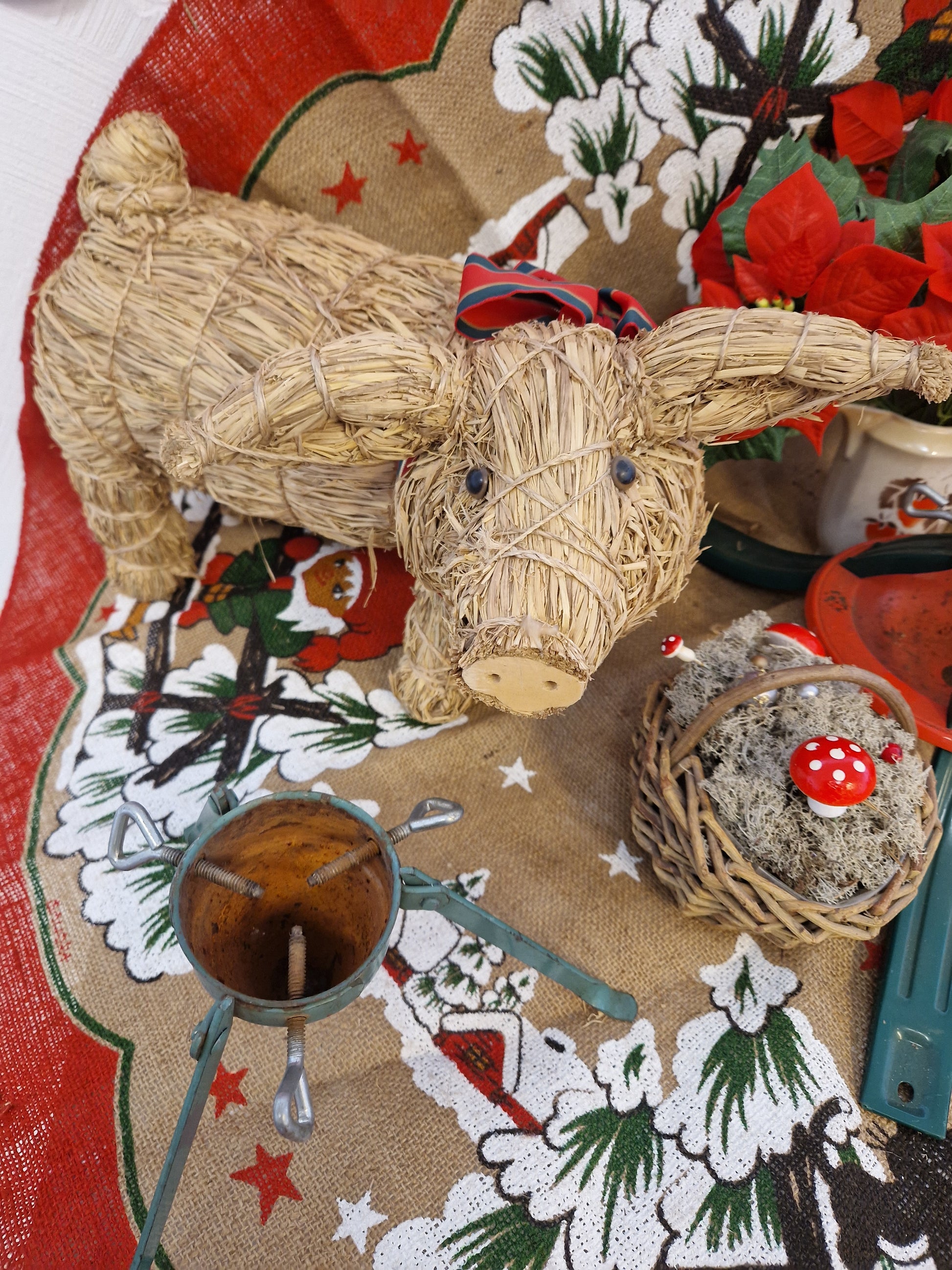 Julgris i halm, div. plastblommor, julgardin och vit julstjärna i plåt.