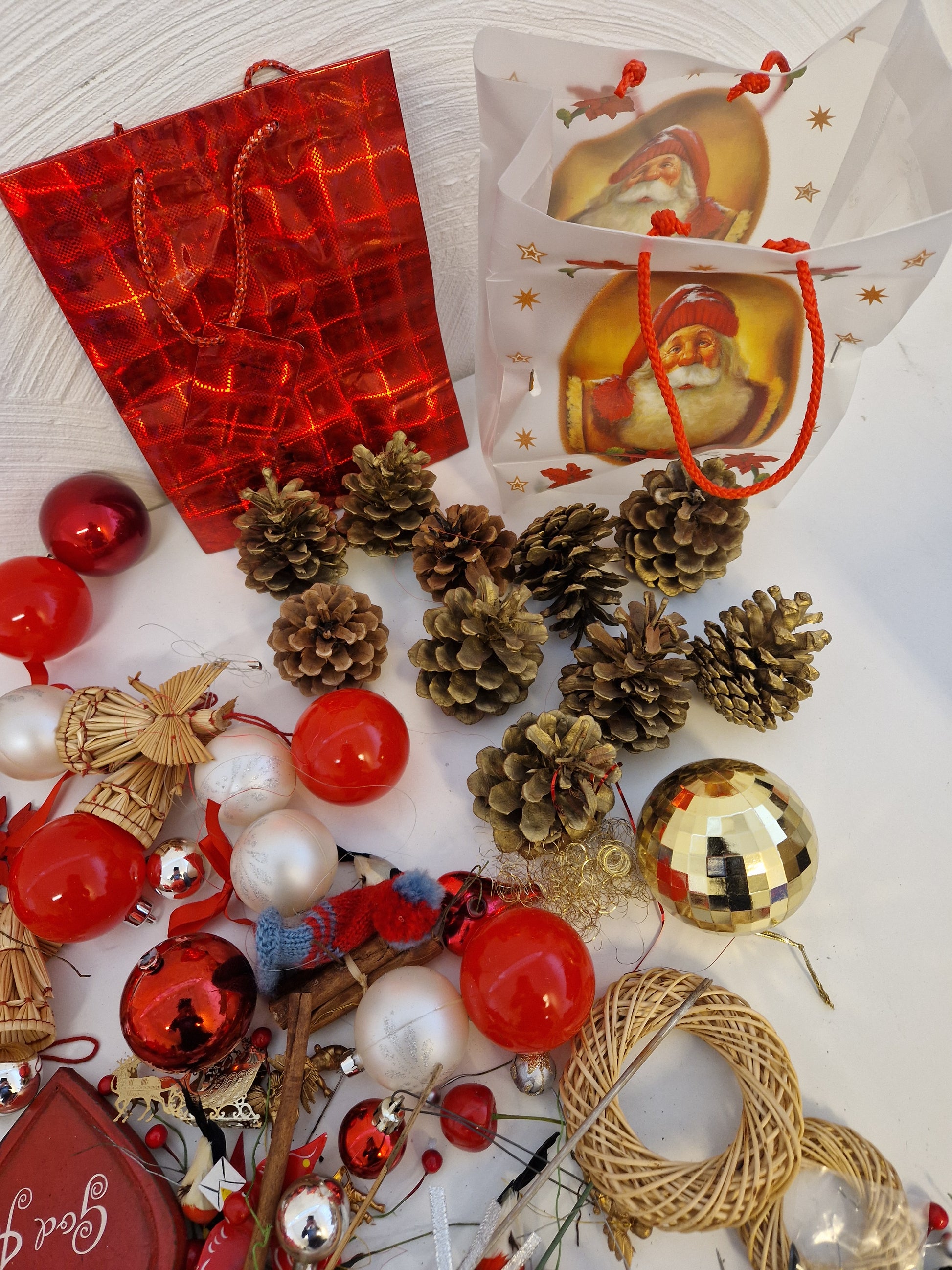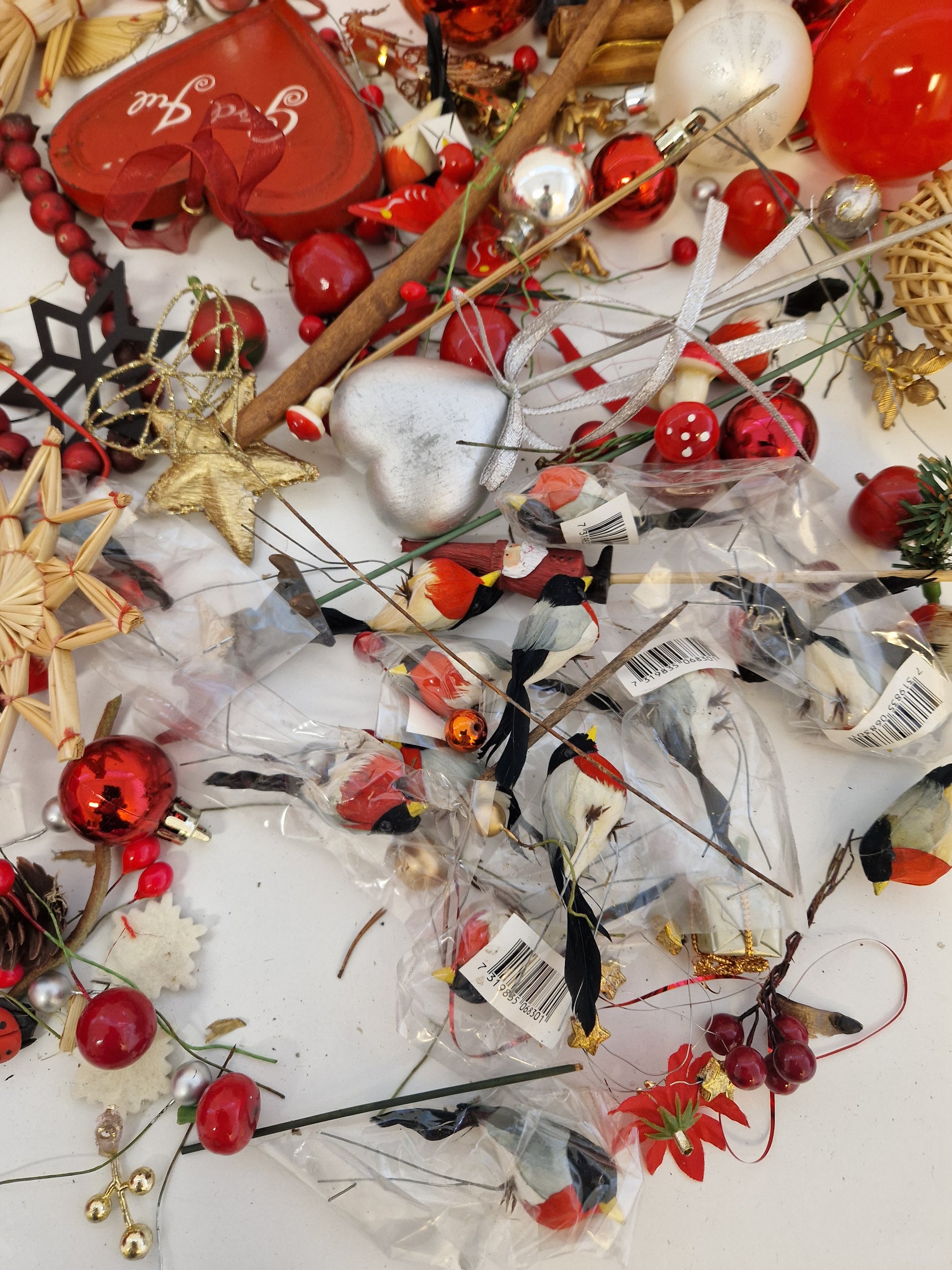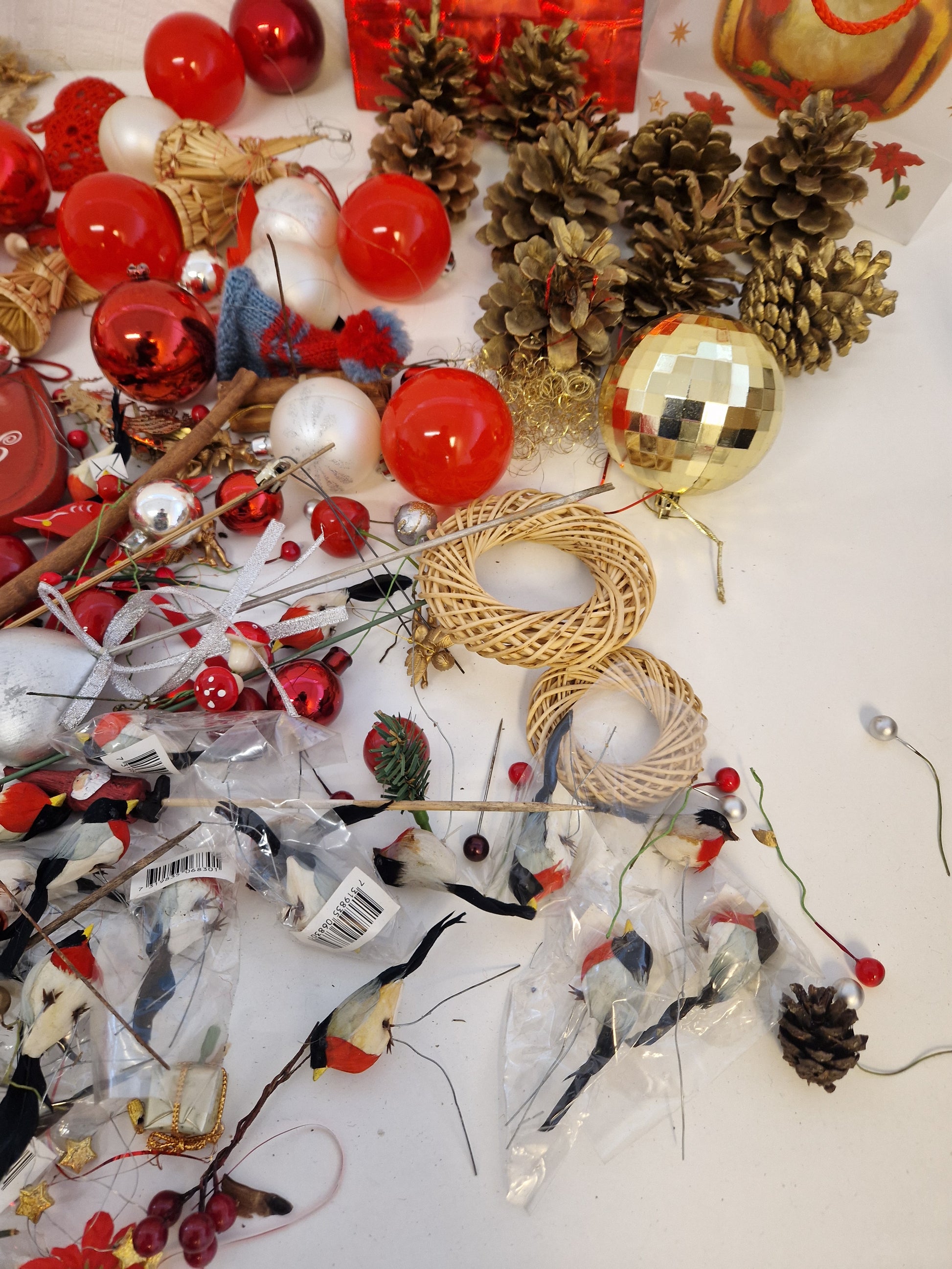 Massor med pynt och julgranskulor.