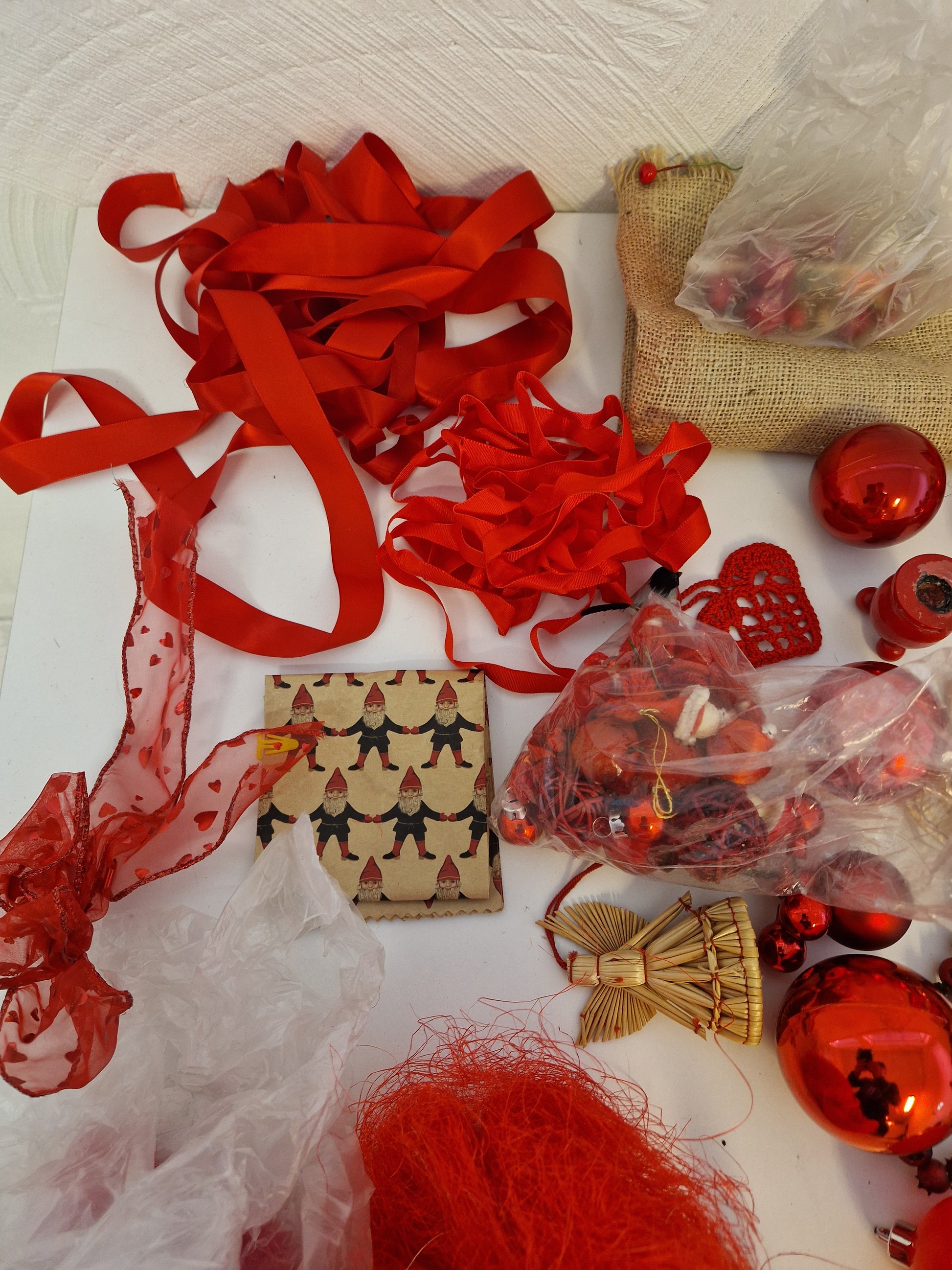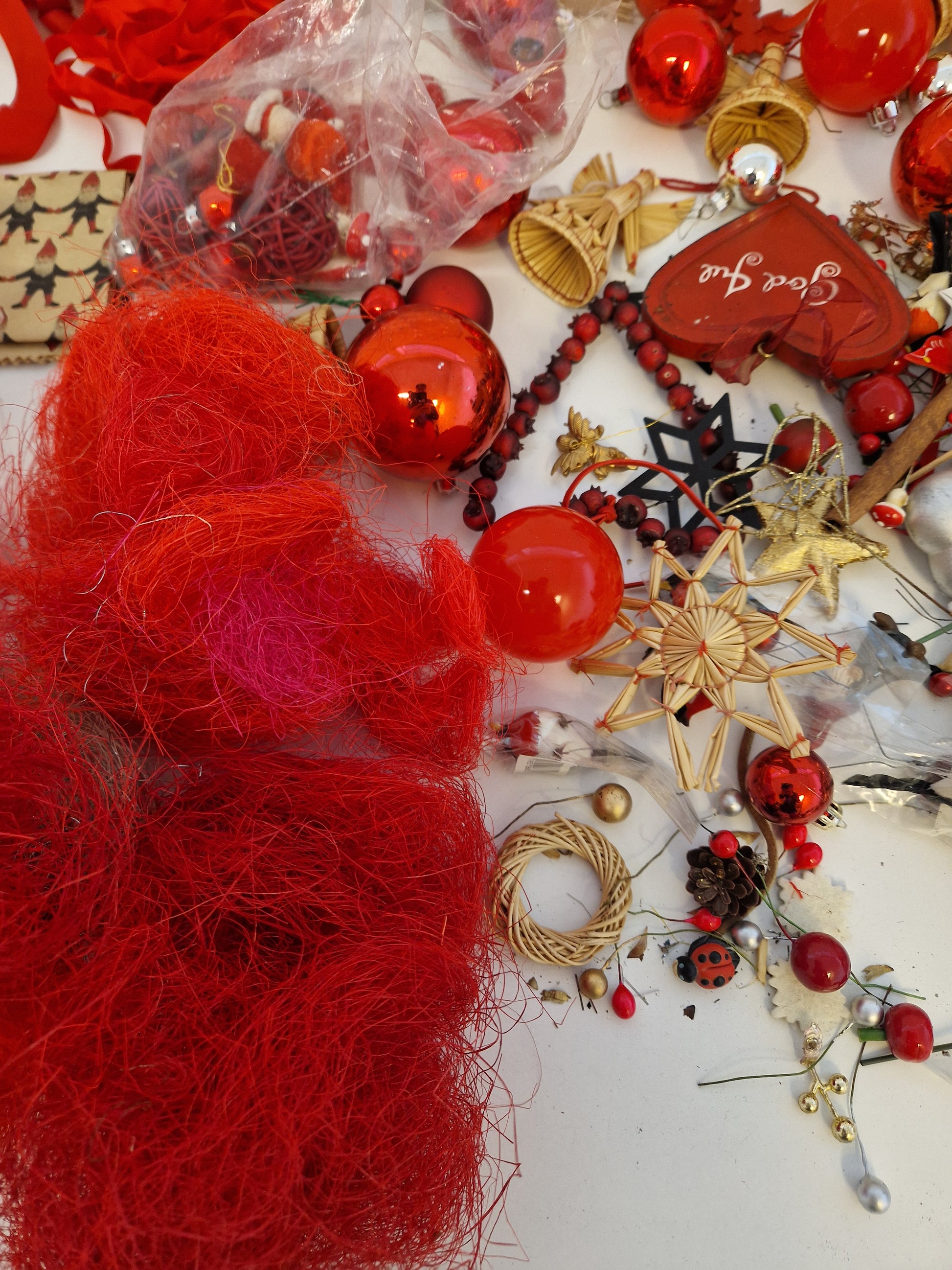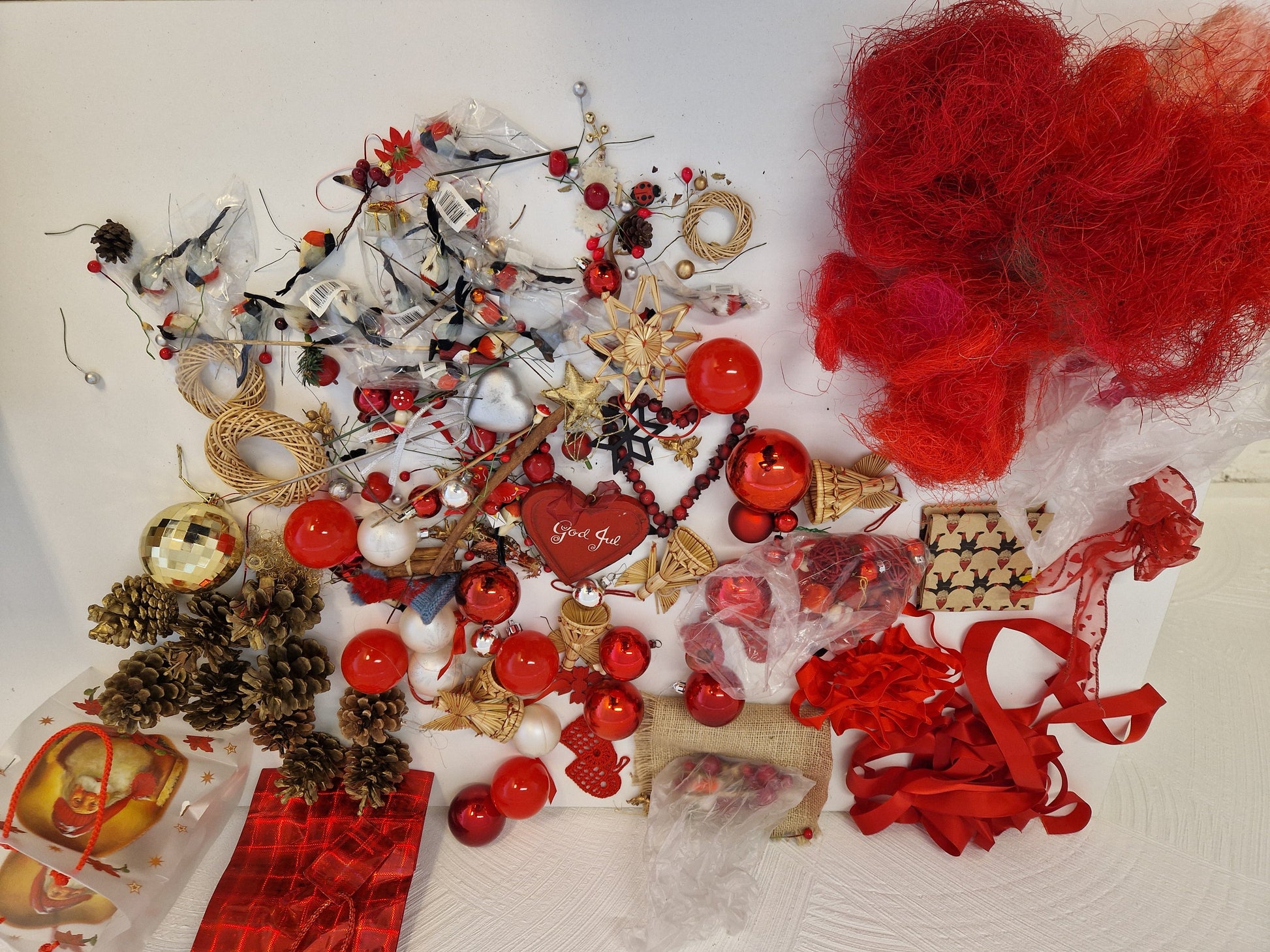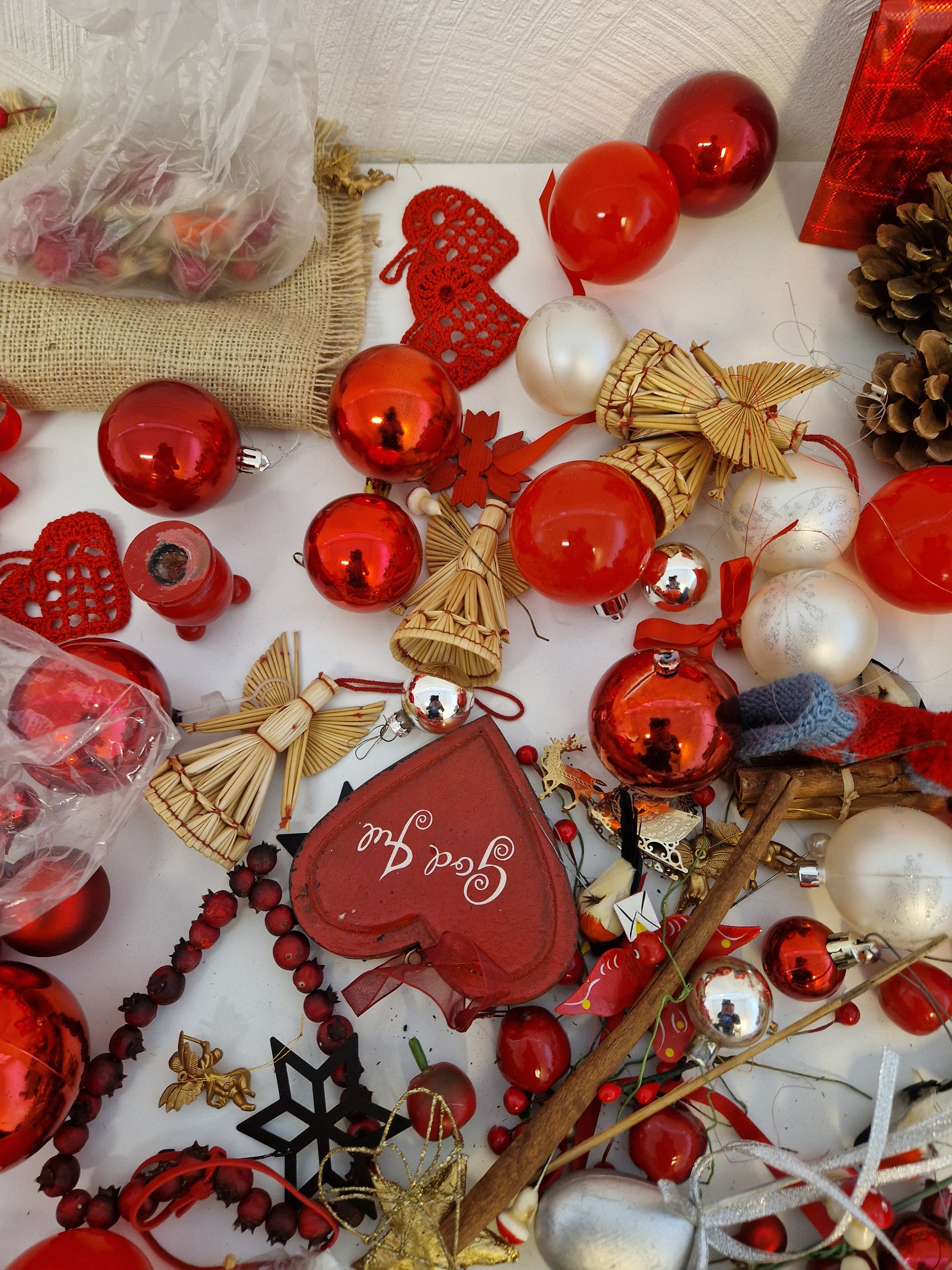Massor med pynt och julgranskulor.