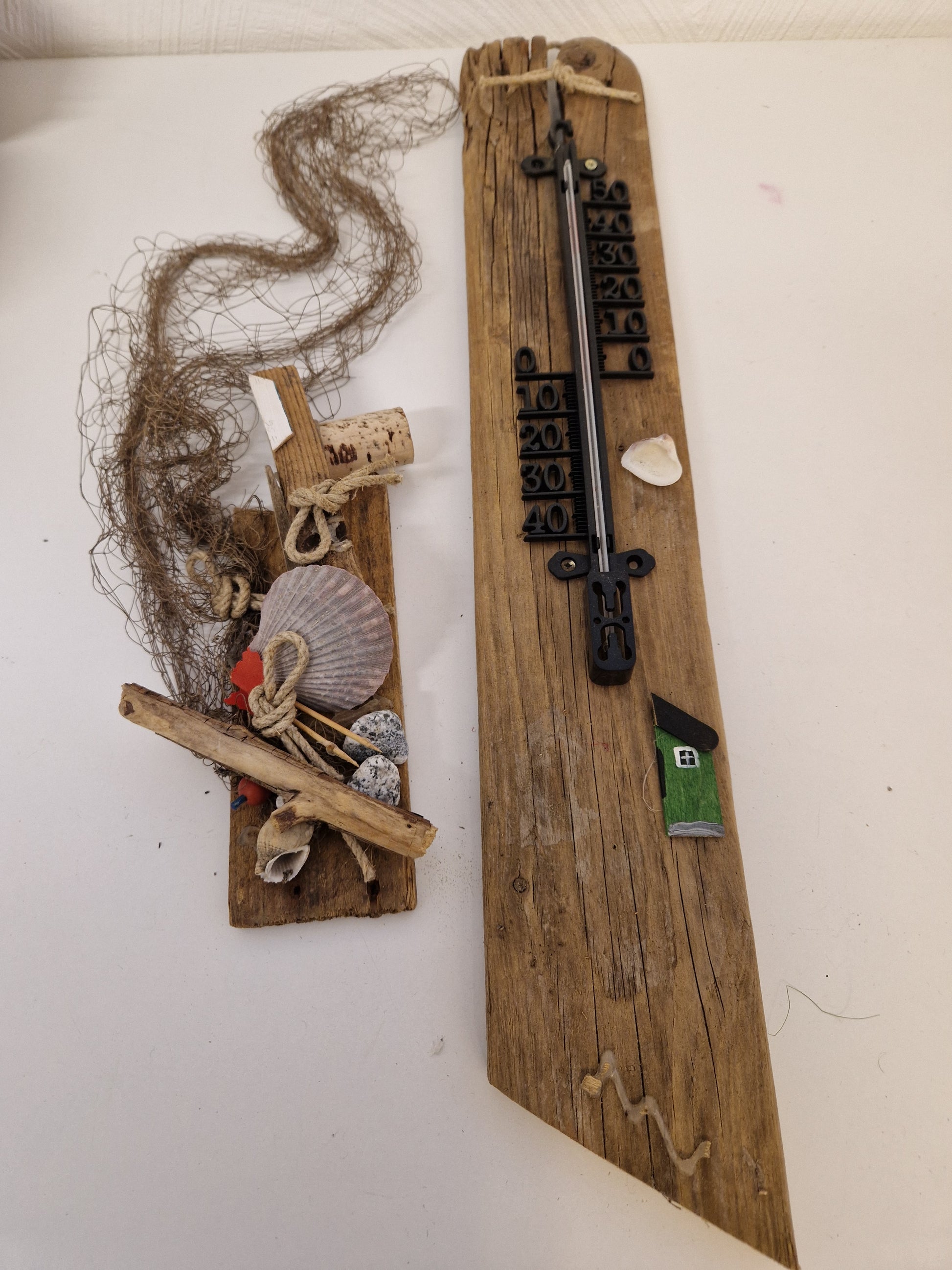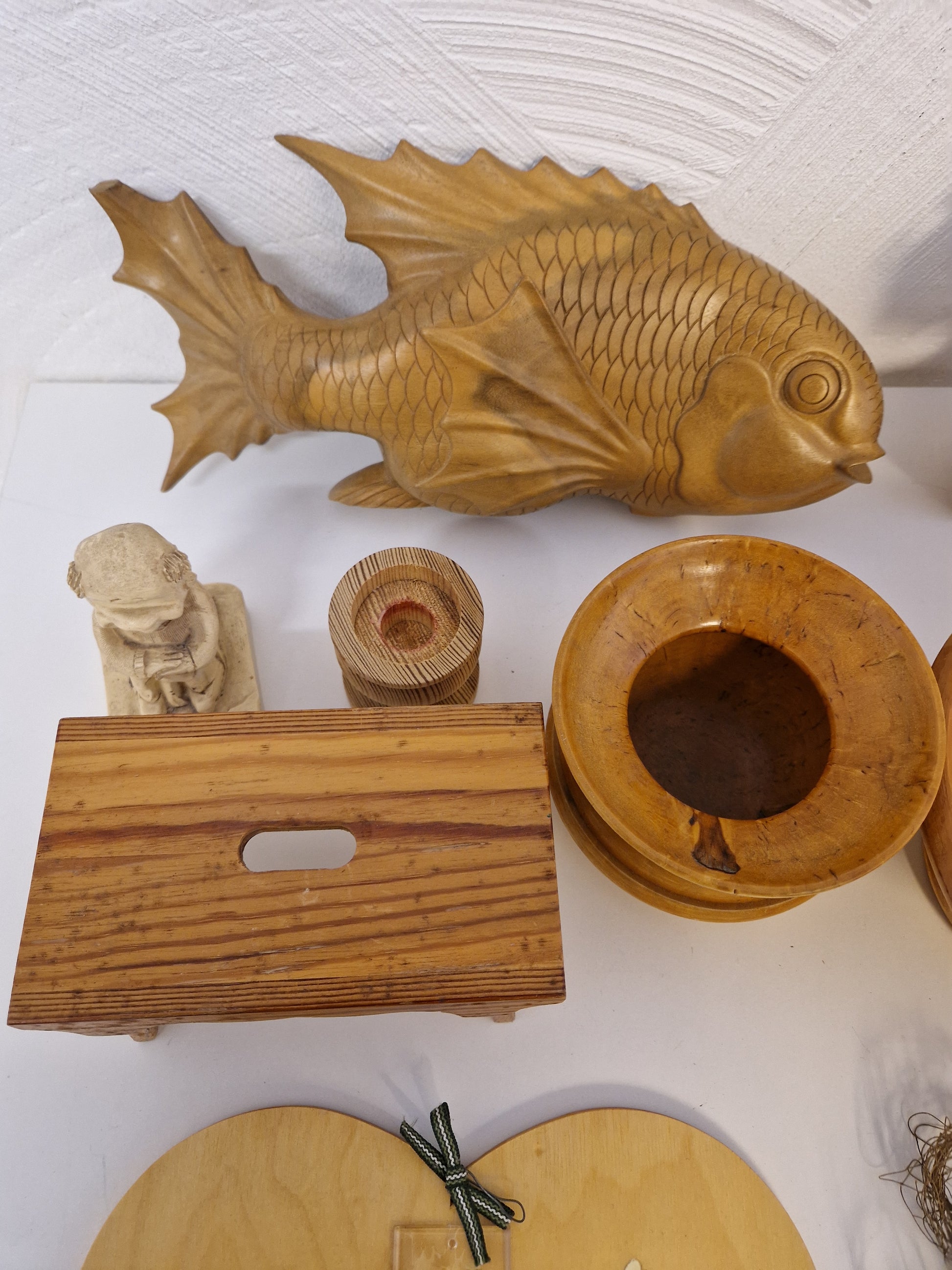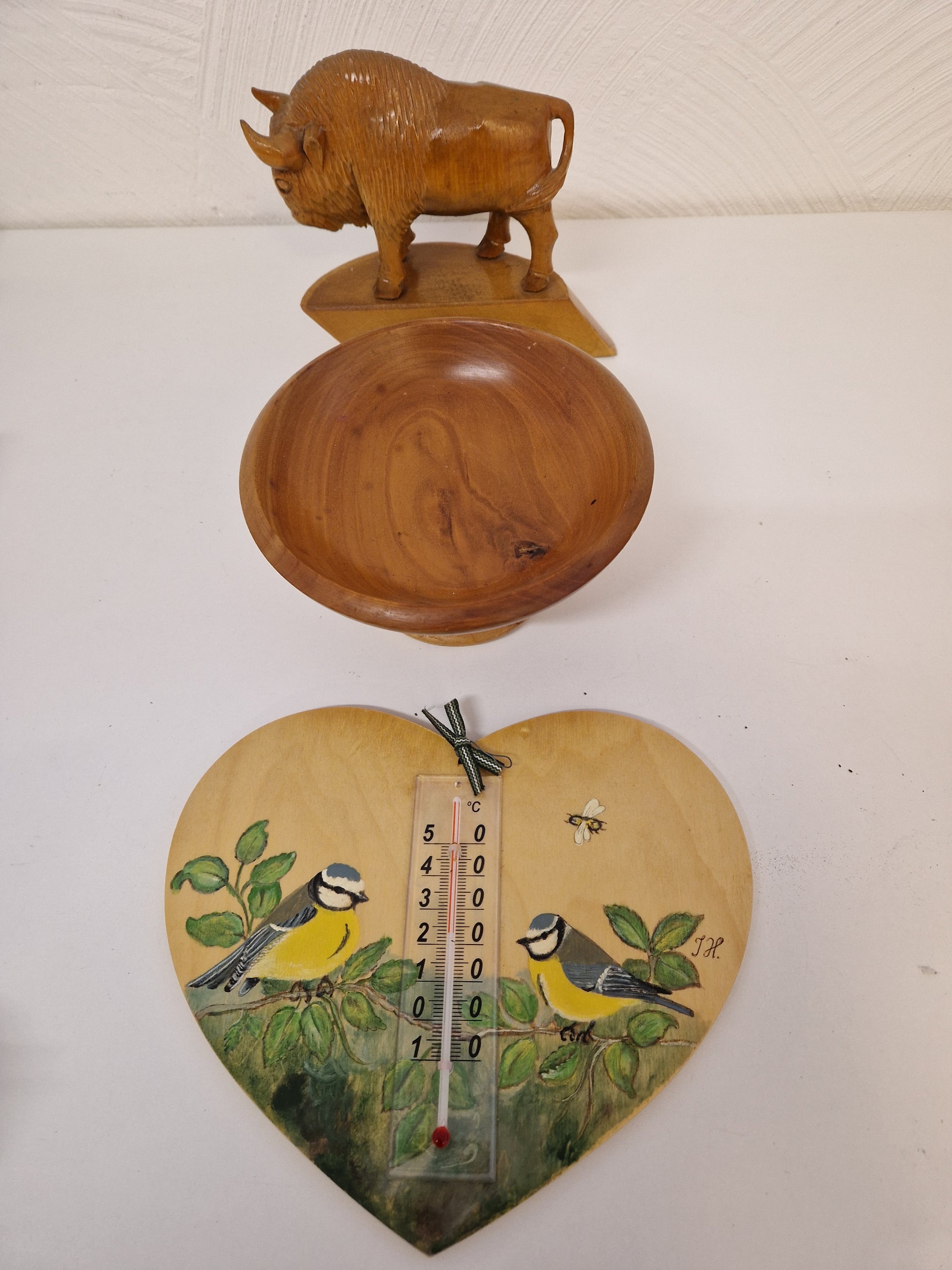 Diverse konst & kuriosa i trä, bl.a. oxe, skålar, fisk, hjärttermometer, pall samt stor termometer tillverkad av drivved mm.