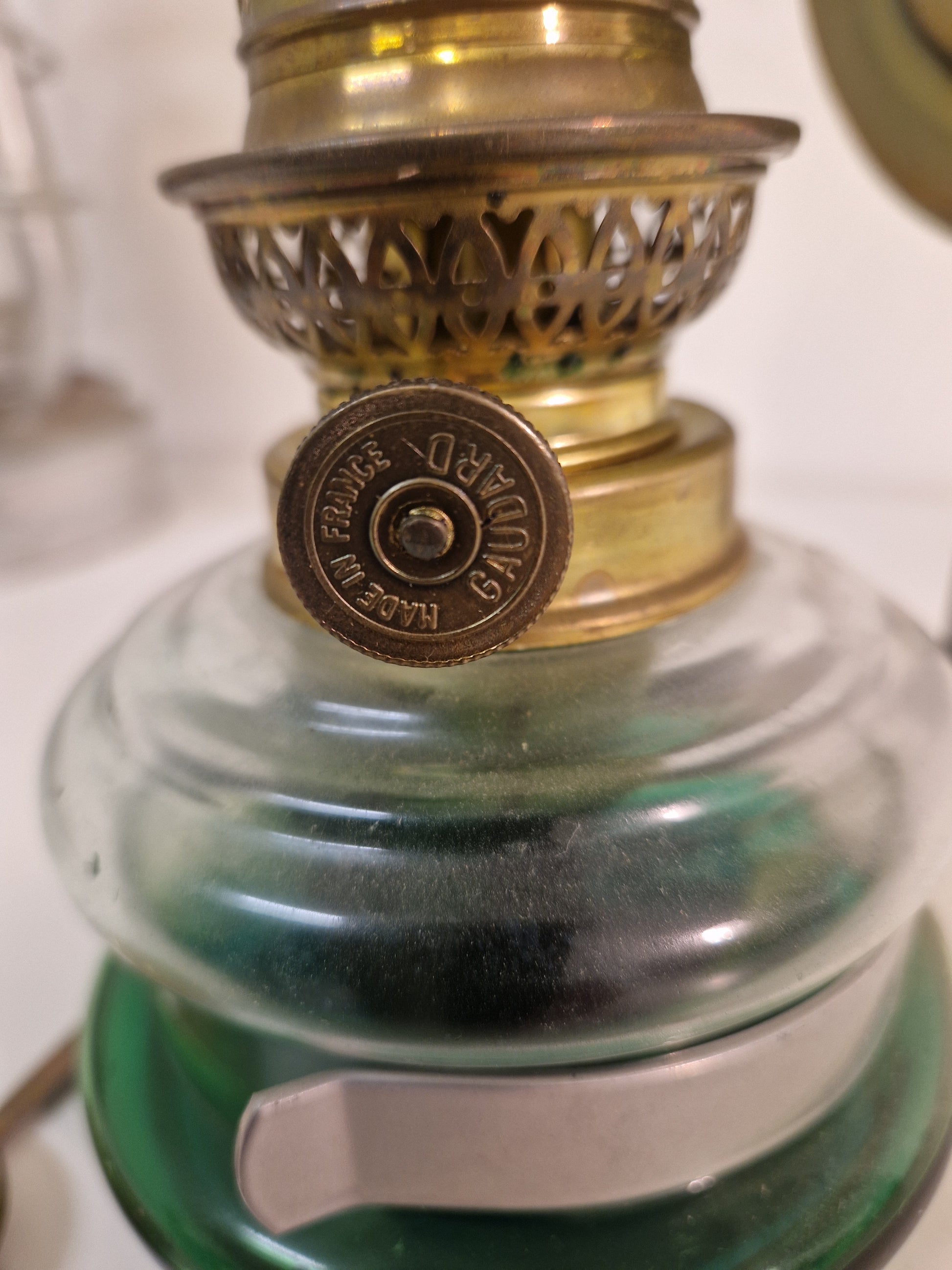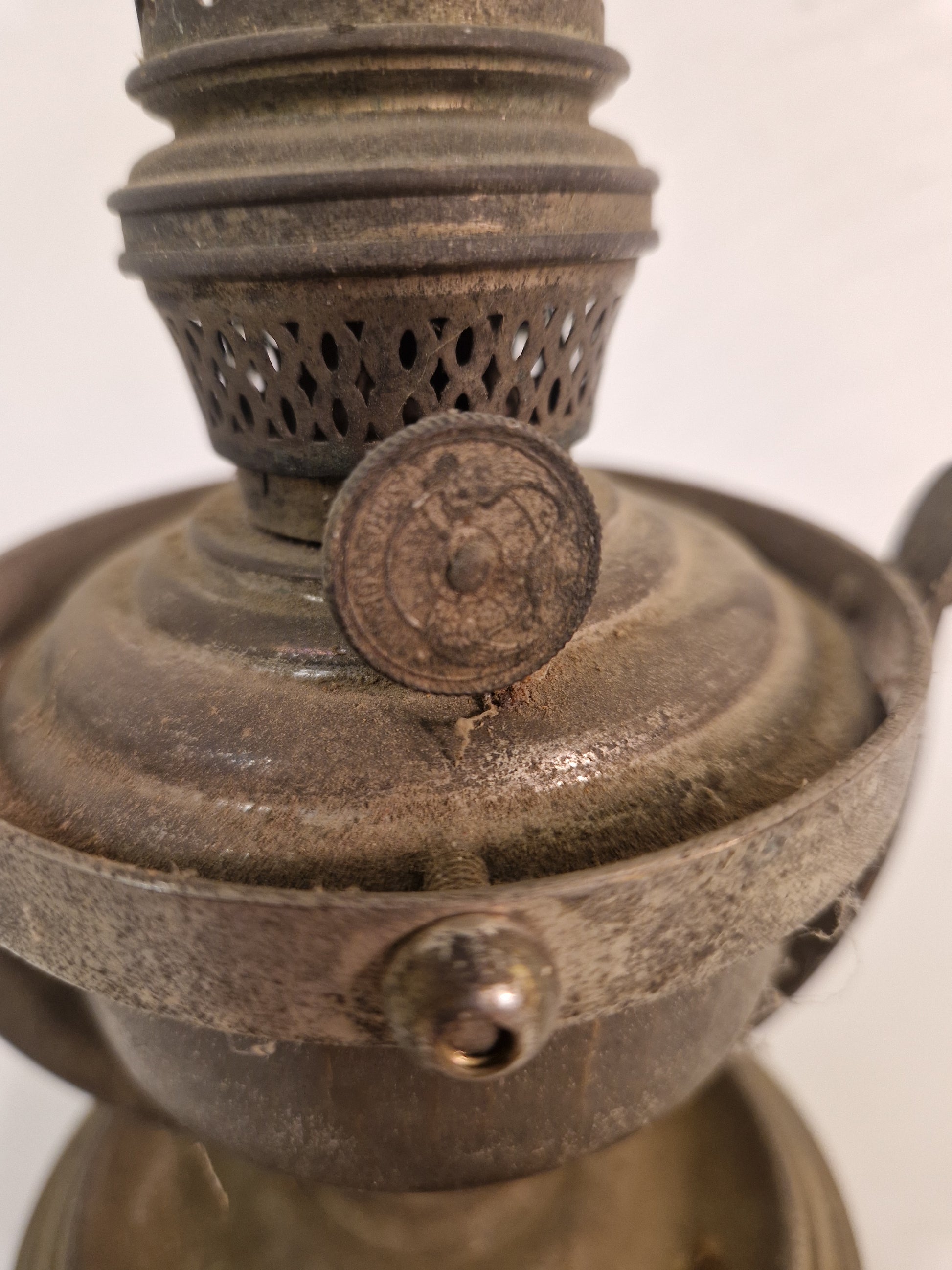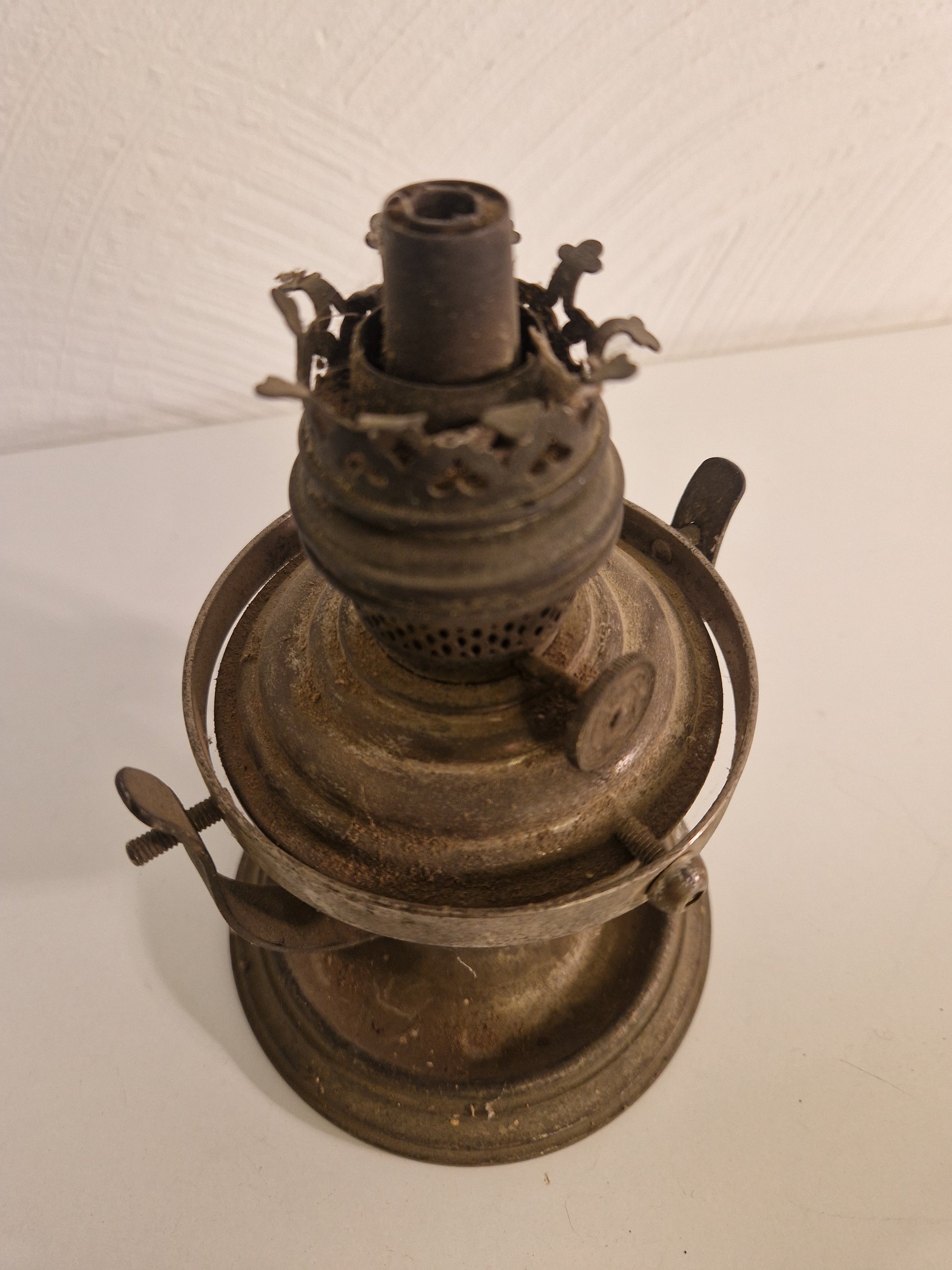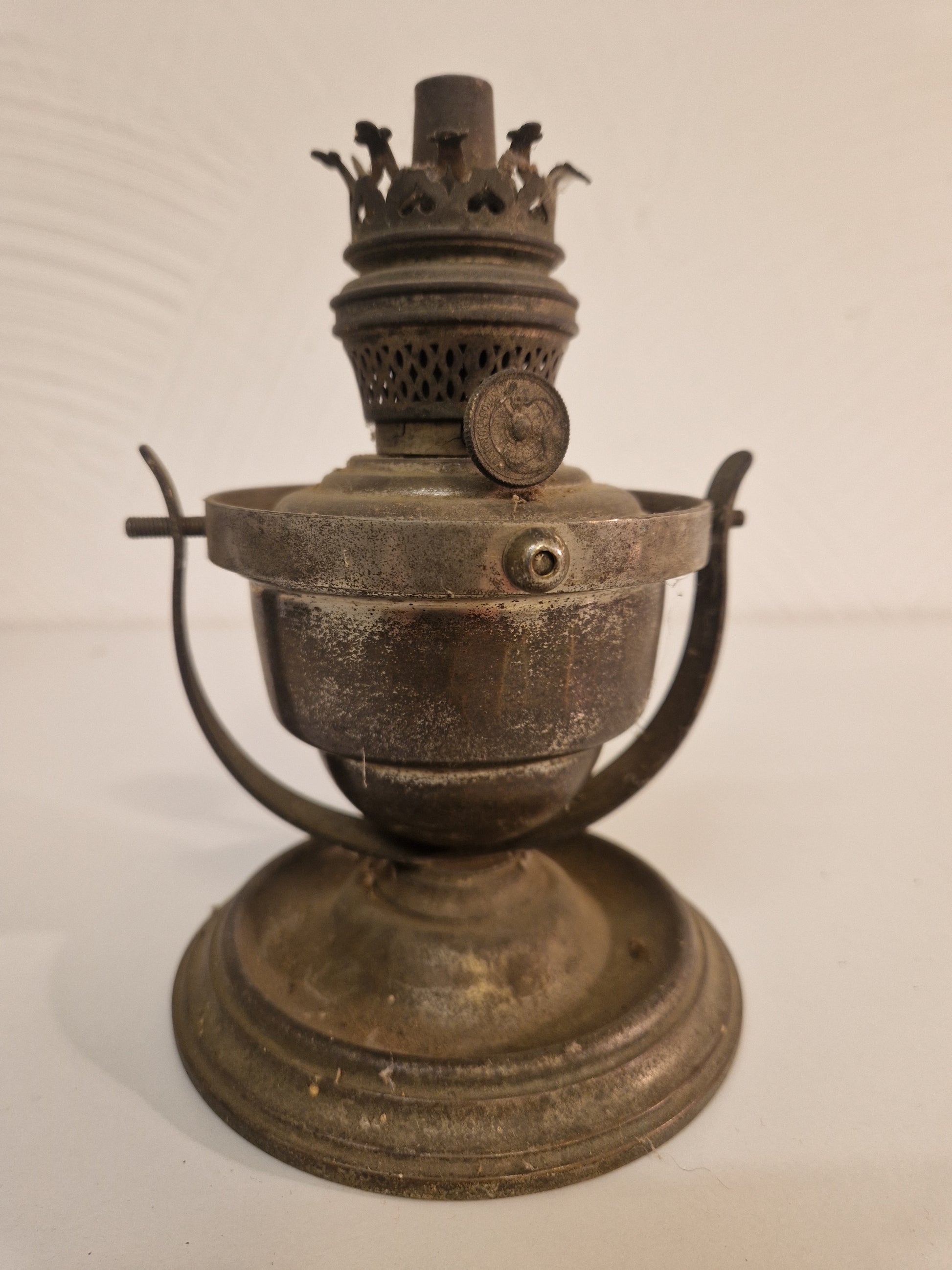 1 skeppslykta med gyrofunktion som saknar brännarglas. Är i dåligt skick och behöver putsas. Ursprung och ålder okänt. Höjd ca 18cm.