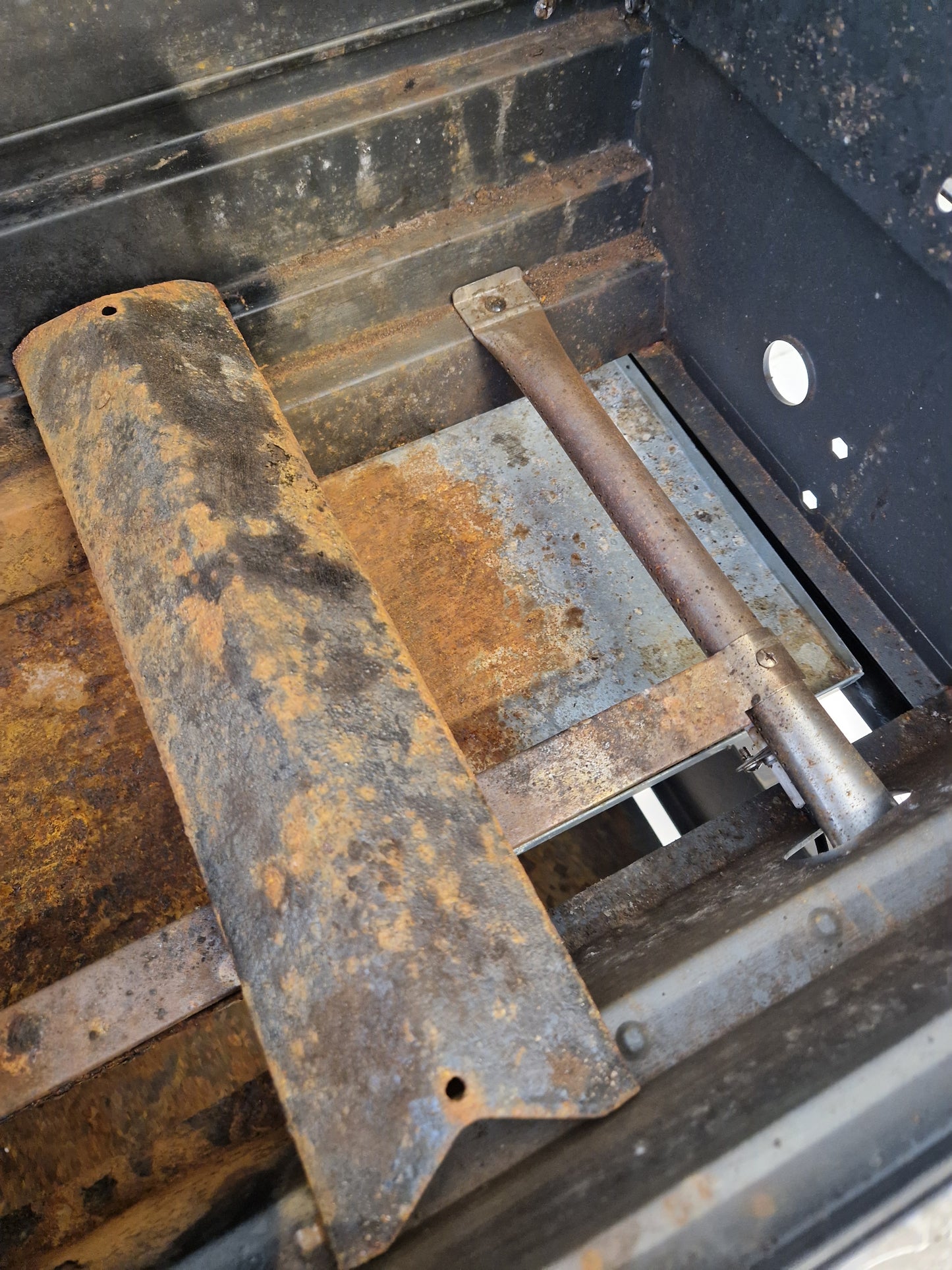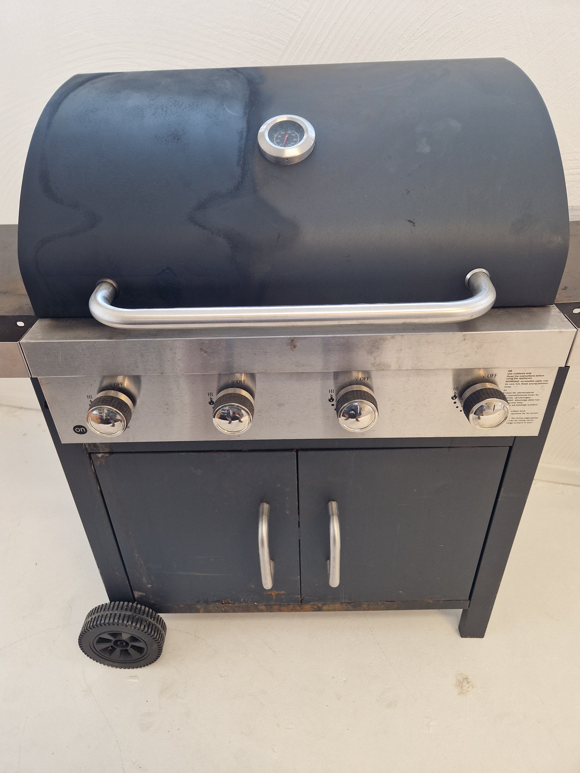 Gasolgrill av okänt varumärke i väl använt och rostigt skick.